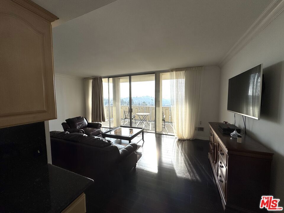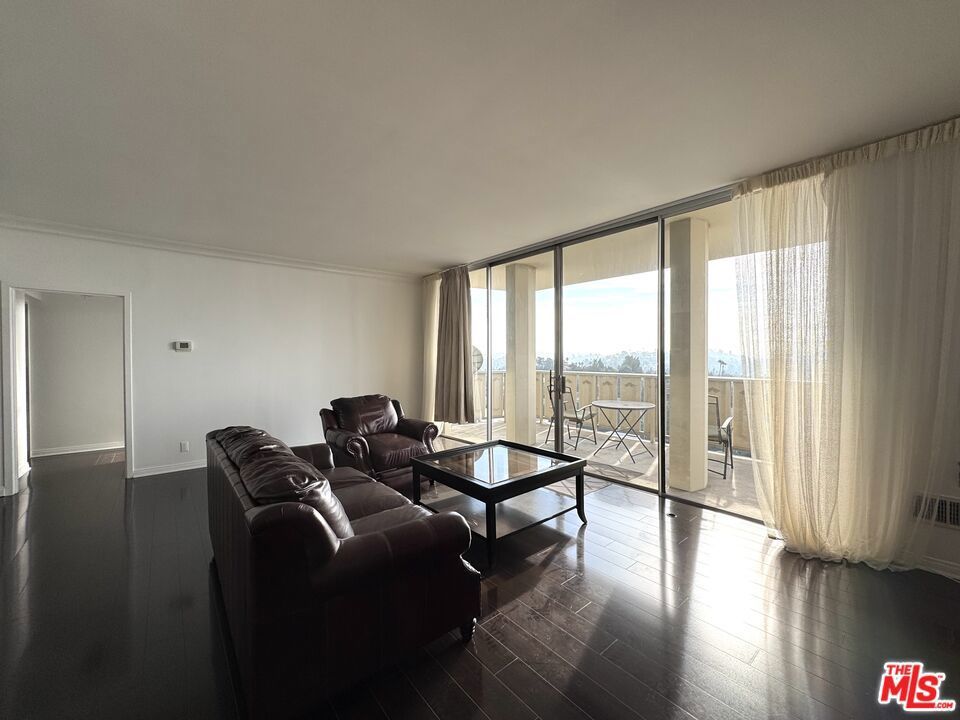 Stunning views from this impressive top floor unit in Los Feliz Towers. A freshly painted one bedroom + one bathroom condominium in the ever popular high-rise. This unit boasts hardwood floors, a dedicated office/den area and an expansive deck to watch the sunrises and sunsets. This luxury condo is in a full service building with a doorman, security, pool, gym and sauna.