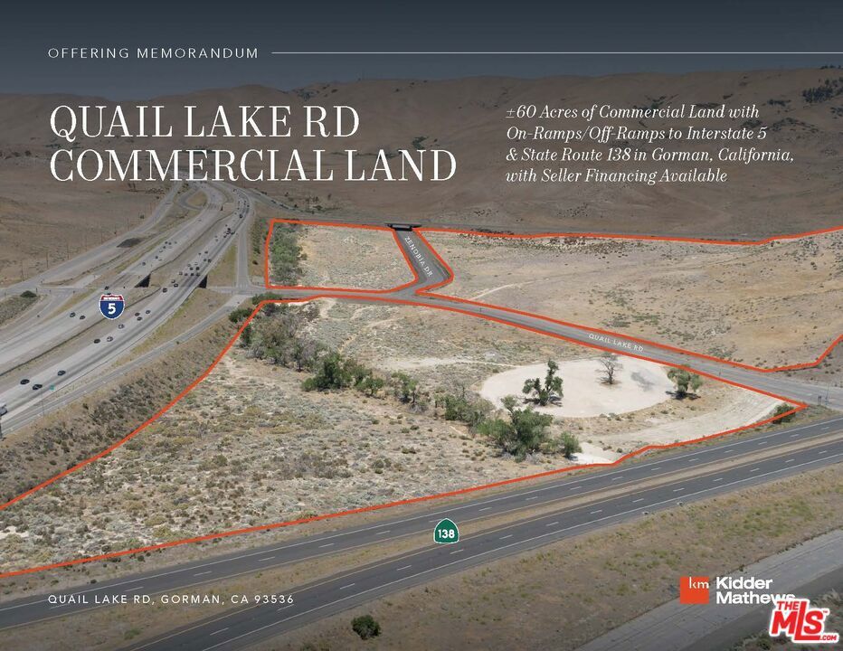 We are pleased to present a unique opportunity consisting of 60 acres on 3 parcels of primarily flat commercial land along the 5 Freeway at the intersection of Highway 138. With 3 freeway off-ramps/on-ramps directly onto the property, the property, which has already paved roads, is well-positioned for a developer to take advantage of the 250,000+ vehicles per day traveling along one of the busiest freeways in the world that provides access to Los Angeles ports, Central Valley agricultural businesses, San Francisco tech hubs, and the entire West Coast. Ownership has a land use survey completed by David Evans and Associates, Inc. which can be made available for qualified buyers. Potential uses include hotels/motels, drive-through services, utility-scale solar energy, along with a myriad of other options, which the Buyer shall rely on their own due diligence and investigations to confirm in full. With nearby future developments including the fully entitled 12,000+ acre Centennial at Tejon Ranch Master Planned Community approximately 3 miles away, which include 19,000+ homes and 10M+ square feet of retail/public/business park/office space/civic development, the next owner of these parcels may be well positioned for significant growth over the coming years. Also nearby is Pyramid Lake only 5 miles to the south, and the Tejon Ranch Commerce Center just 8 miles to the north. APN's included are: 3252-011-016, 3252-011-023, 3252-011-022. Seller financing available for qualified buyers! Contact the listing team today for additional information regarding this unique opportunity.