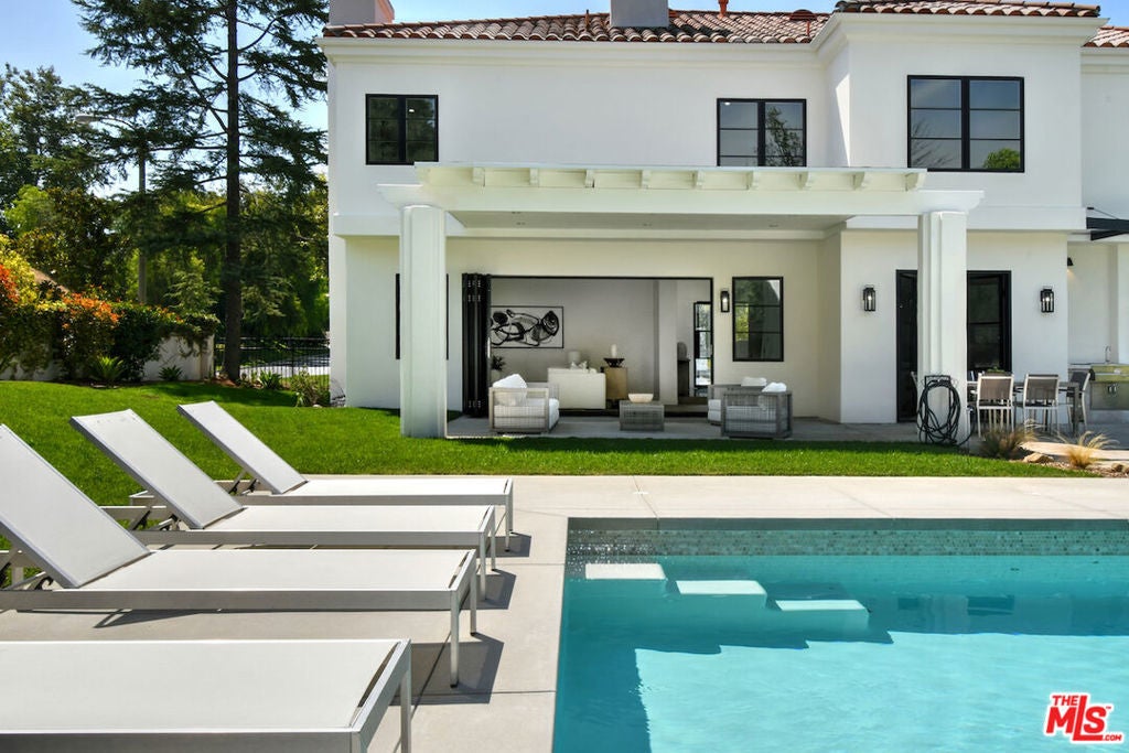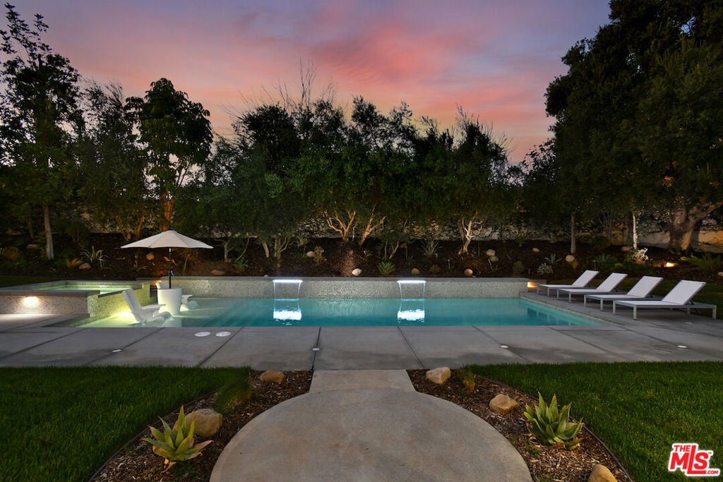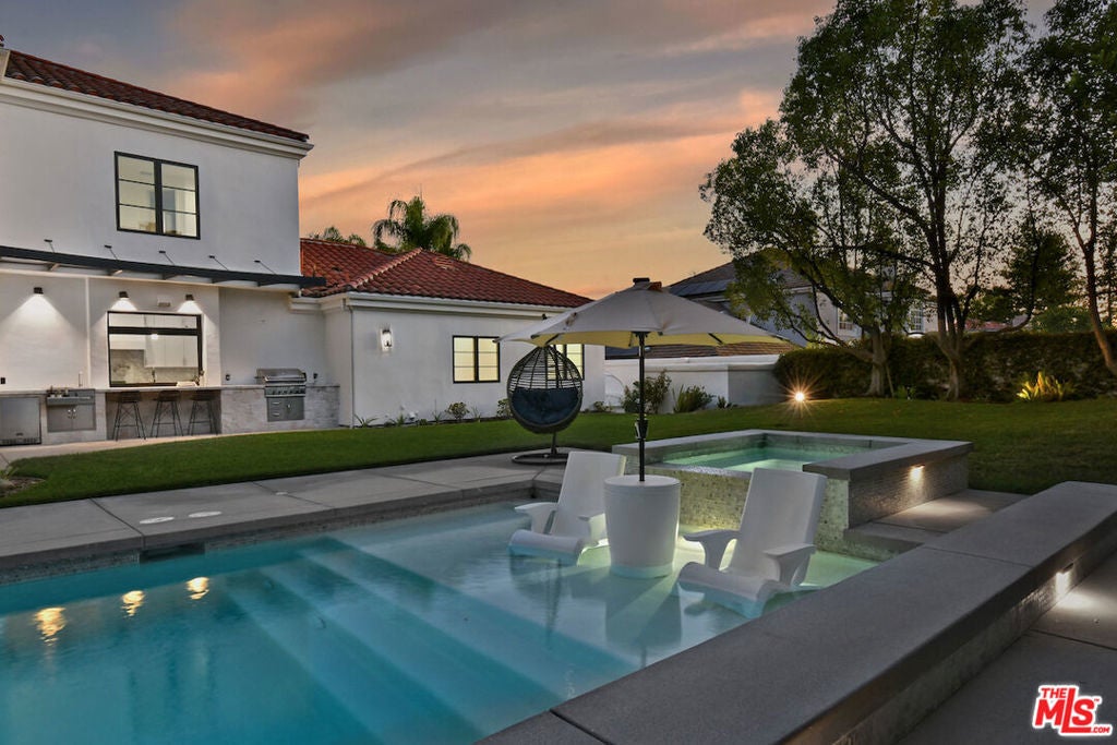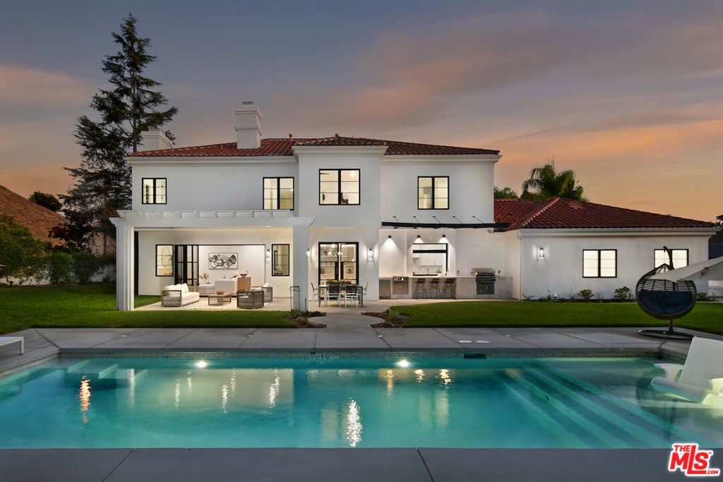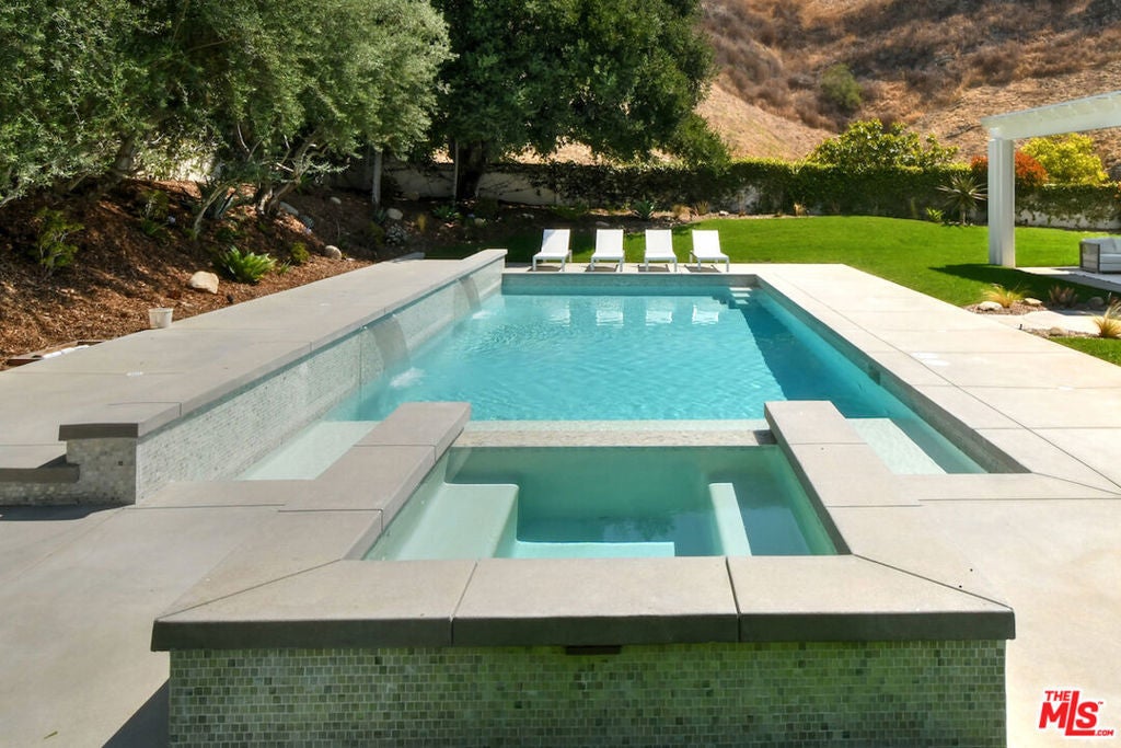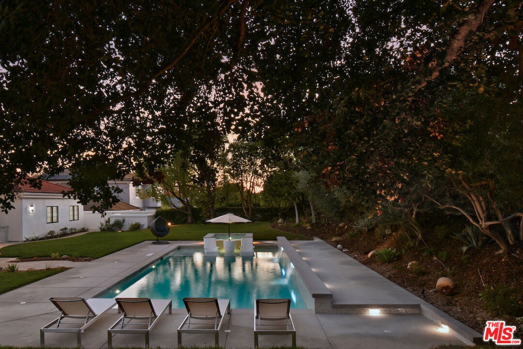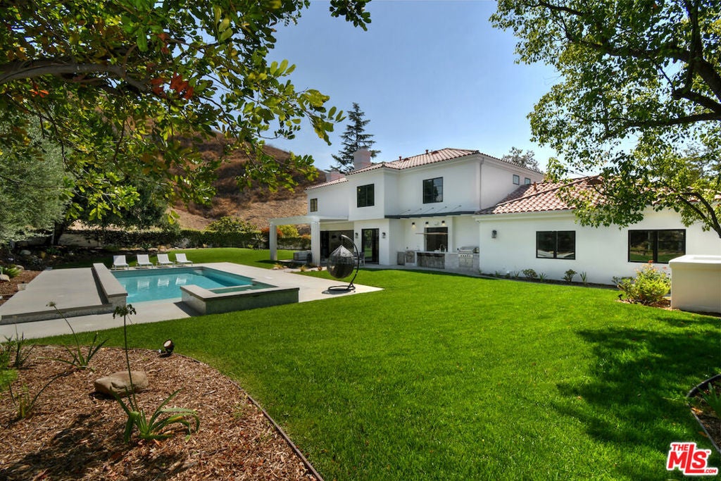 This spectacular, fully remodeled home is located within the prestigious 24-hour guard-gated Mountain View Estates in prime Calabasas. Set on an impressive 17,000 sq ft corner lot, this 5-bedroom, 4.5-bath residence is a true design-forward showplace. A striking metal and glass entry door opens to a dramatic staircase, wide-plank hardwood floors, and new Marvin windows that flood the home with natural light. The reimagined chef's kitchen is the heart of the home, outfitted with top-tier appliances including dual dishwashers, a walk-in pantry, marble countertops, and a built-in serving hub with ice maker and beverage fridge. A pass-through window connects to the expansive outdoor entertaining area. The generous family room, finished with a Venetian plaster fireplace and fully retractable doors, flows seamlessly to the covered patio and backyard beyond. Formal living and dining spaces offer scale and sophistication while remaining functional for modern living. Upstairs, the primary suite is a luxurious retreat featuring a fireplace, sitting area, spa-like bath with glass-enclosed shower, freestanding soaking tub, and a high-end electric toilet. Three additional upstairs bedrooms are spacious and well-appointed. A private office, large utility room, and 3-car garage add to the home's thoughtful layout. The resort-style backyard is designed for year-round enjoyment, complete with a redesigned pool and spa with Baja shelf, built-in BBQ, generous grassy areas, and multiple zones for lounging and entertaining. This is a rare opportunity to own a turnkey property that checks every box, style, function, and setting.