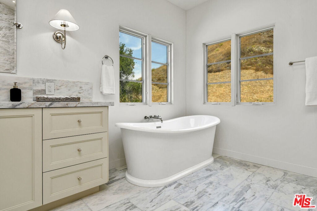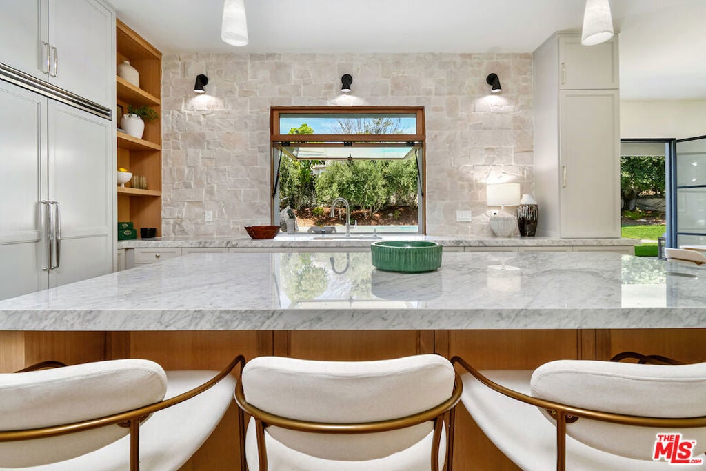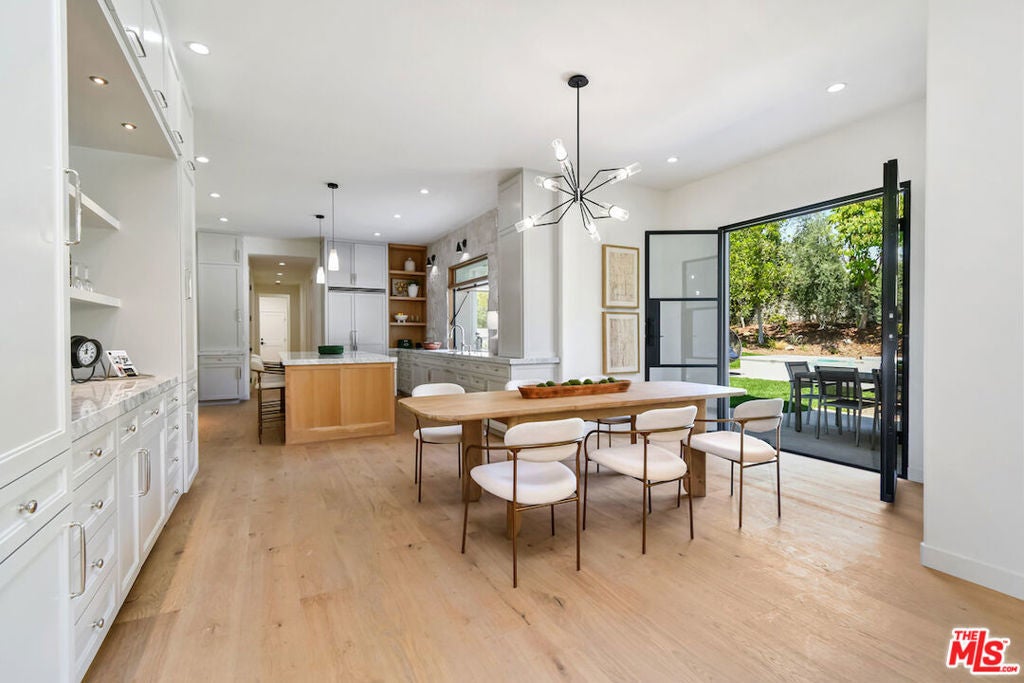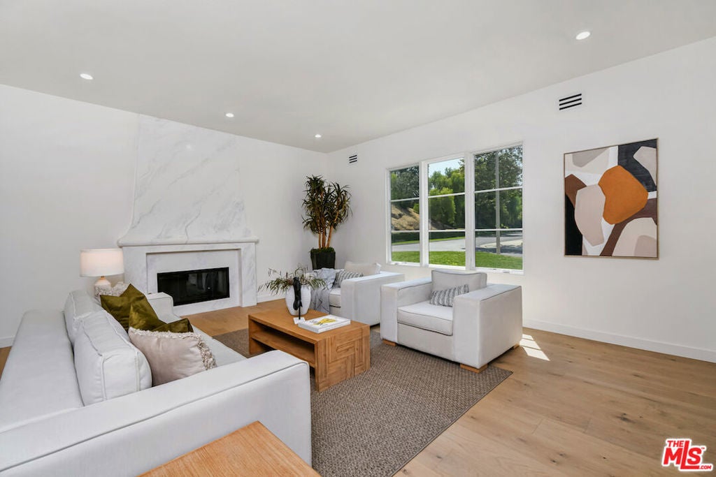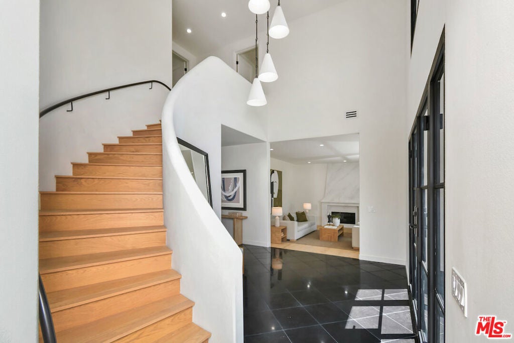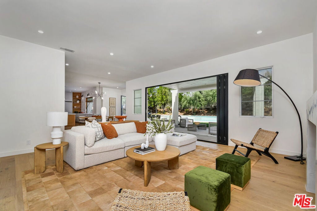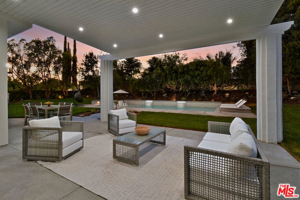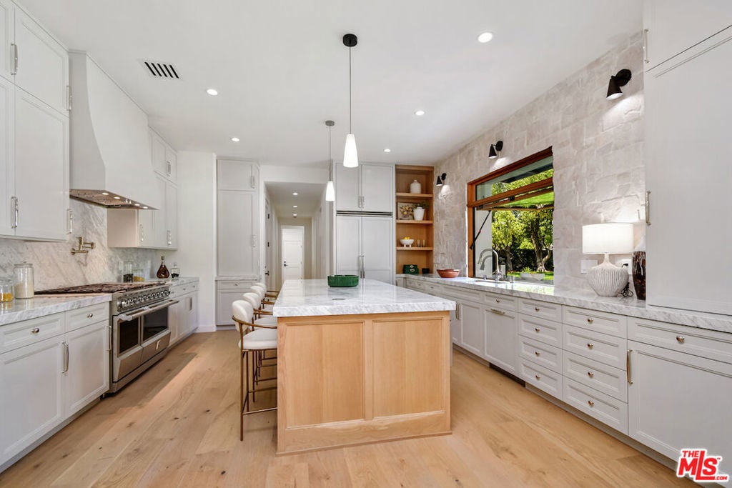 This spectacular, fully remodeled home is located within the prestigious 24-hour guard-gated Mountain View Estates in prime Calabasas. Set on an impressive 17,000 sq ft corner lot, this 5-bedroom, 4.5-bath residence is a true design-forward showplace. A striking metal and glass entry door opens to a dramatic staircase, wide-plank hardwood floors, and new Marvin windows that flood the home with natural light. The reimagined chef's kitchen is the heart of the home, outfitted with top-tier appliances including dual dishwashers, a walk-in pantry, marble countertops, and a built-in serving hub with ice maker and beverage fridge. A pass-through window connects to the expansive outdoor entertaining area. The generous family room, finished with a Venetian plaster fireplace and fully retractable doors, flows seamlessly to the covered patio and backyard beyond. Formal living and dining spaces offer scale and sophistication while remaining functional for modern living. Upstairs, the primary suite is a luxurious retreat featuring a fireplace, sitting area, spa-like bath with glass-enclosed shower, freestanding soaking tub, and a high-end electric toilet. Three additional upstairs bedrooms are spacious and well-appointed. A private office, large utility room, and 3-car garage add to the home's thoughtful layout. The resort-style backyard is designed for year-round enjoyment, complete with a redesigned pool and spa with Baja shelf, built-in BBQ, generous grassy areas, and multiple zones for lounging and entertaining. This is a rare opportunity to own a turnkey property that checks every box, style, function, and setting.