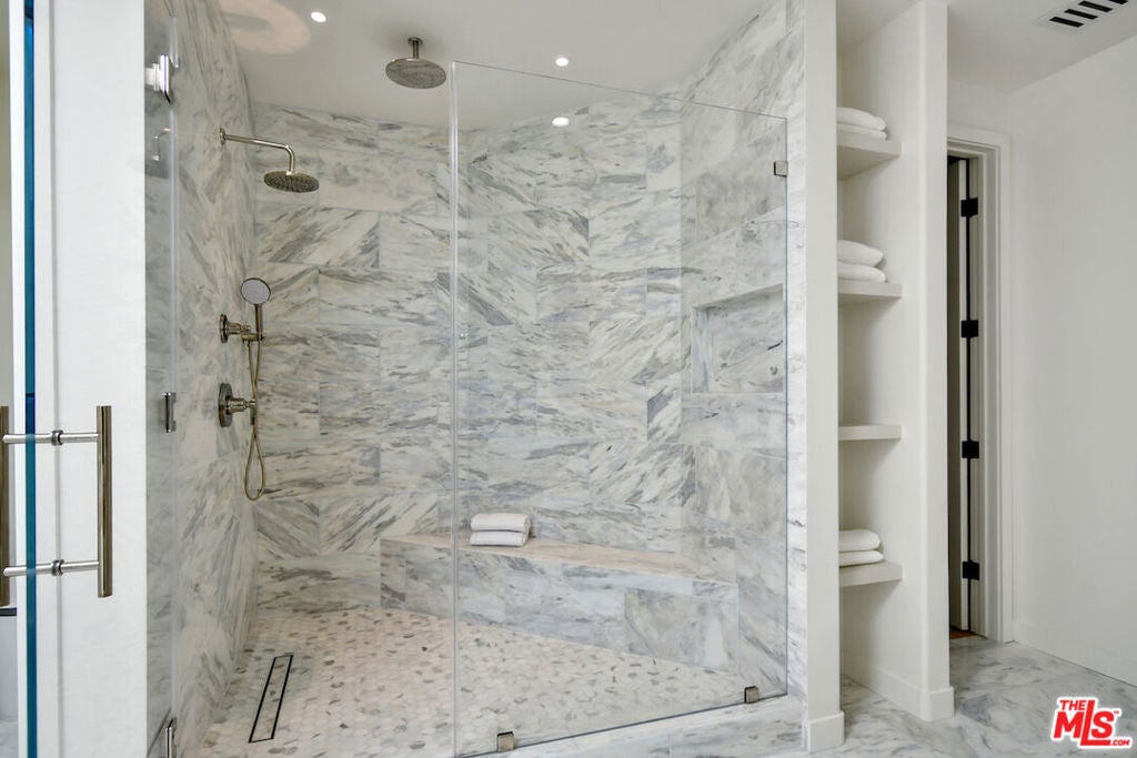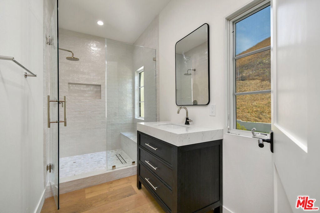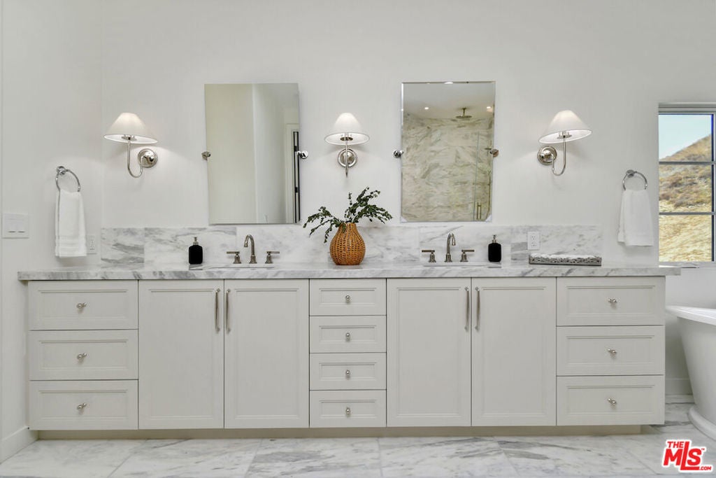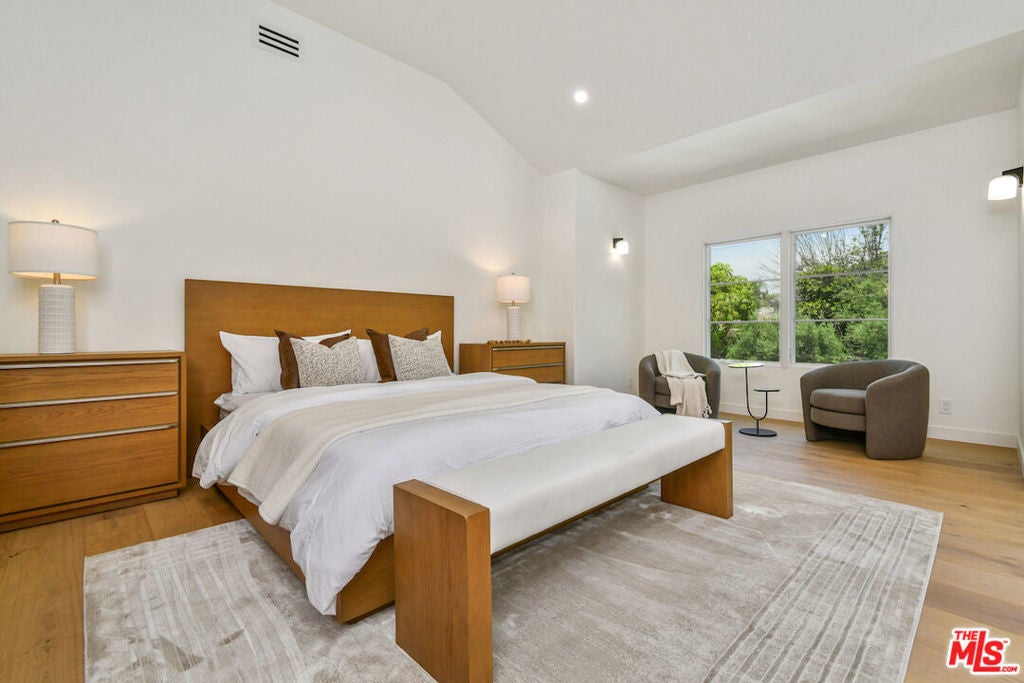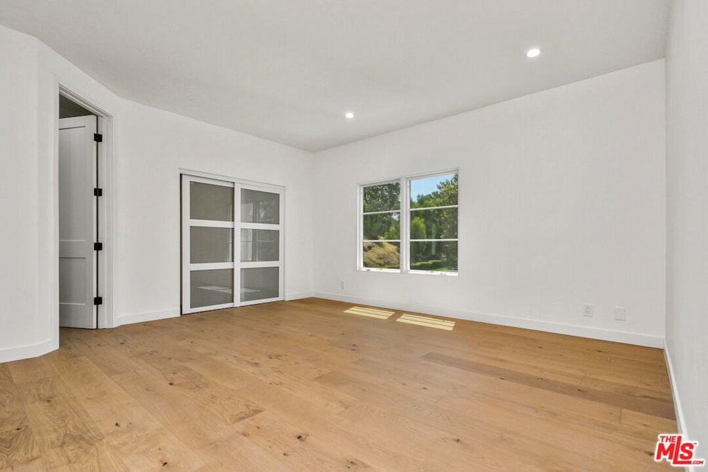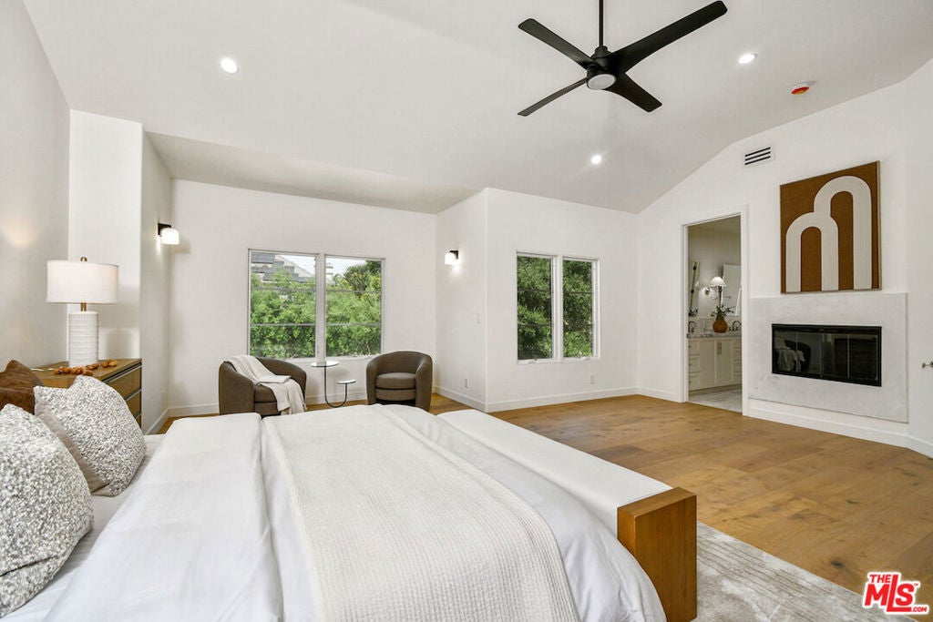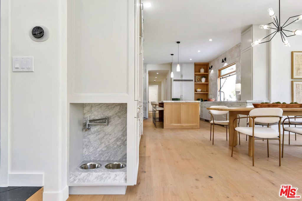 This spectacular, fully remodeled home is located within the prestigious 24-hour guard-gated Mountain View Estates in prime Calabasas. Set on an impressive 17,000 sq ft corner lot, this 5-bedroom, 4.5-bath residence is a true design-forward showplace. A striking metal and glass entry door opens to a dramatic staircase, wide-plank hardwood floors, and new Marvin windows that flood the home with natural light. The reimagined chef's kitchen is the heart of the home, outfitted with top-tier appliances including dual dishwashers, a walk-in pantry, marble countertops, and a built-in serving hub with ice maker and beverage fridge. A pass-through window connects to the expansive outdoor entertaining area. The generous family room, finished with a Venetian plaster fireplace and fully retractable doors, flows seamlessly to the covered patio and backyard beyond. Formal living and dining spaces offer scale and sophistication while remaining functional for modern living. Upstairs, the primary suite is a luxurious retreat featuring a fireplace, sitting area, spa-like bath with glass-enclosed shower, freestanding soaking tub, and a high-end electric toilet. Three additional upstairs bedrooms are spacious and well-appointed. A private office, large utility room, and 3-car garage add to the home's thoughtful layout. The resort-style backyard is designed for year-round enjoyment, complete with a redesigned pool and spa with Baja shelf, built-in BBQ, generous grassy areas, and multiple zones for lounging and entertaining. This is a rare opportunity to own a turnkey property that checks every box, style, function, and setting.