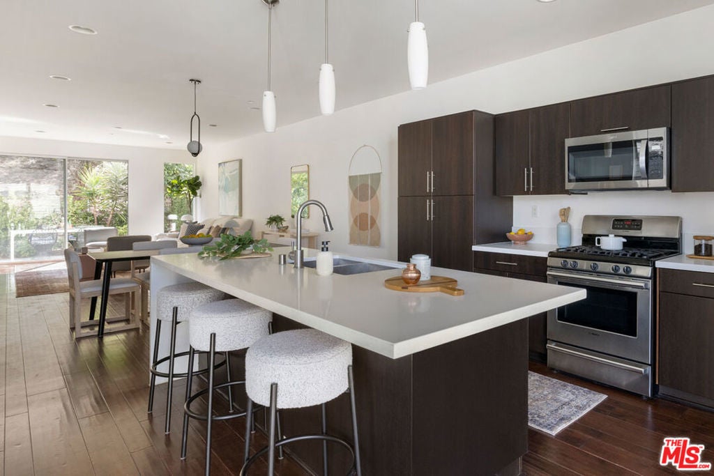 Stylish design and expansive space define this three-bedroom Modern in a quiet Echo Park enclave. The airy, earth-friendly home impresses with a generous layout spanning three levels, featuring a sunny great room with wood floors and glass sliders that open to a private yard, plus a versatile office space for work or guests. The open kitchen is appointed with quartz counters, a center island, and stainless appliances. Upstairs, three bedrooms include an oversized primary suite with walk-in closet, massive bath, and full laundry room. Enjoy central air, a two-car garage with direct access, and the ease of low-maintenance modern living. The setting feels private and tucked against a serene hillside, yet access is easy to Lady Byrd Cafe, Bacetti, The Semi-Tropic, Valerie, and the LA River Bike Path connecting to Frogtown and Elysian Valley trails.