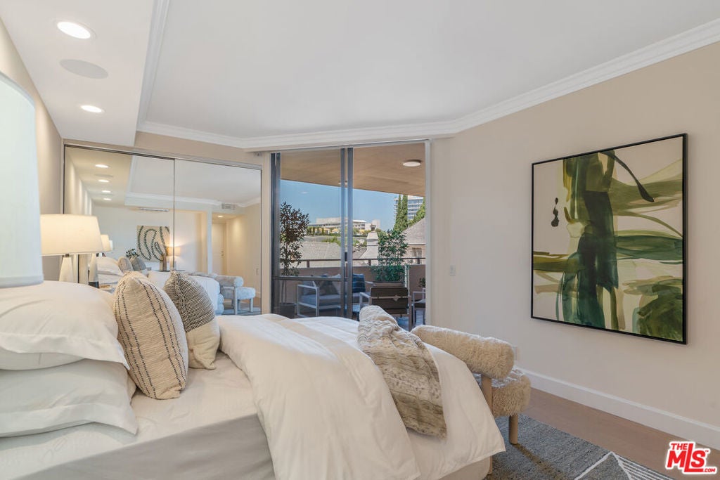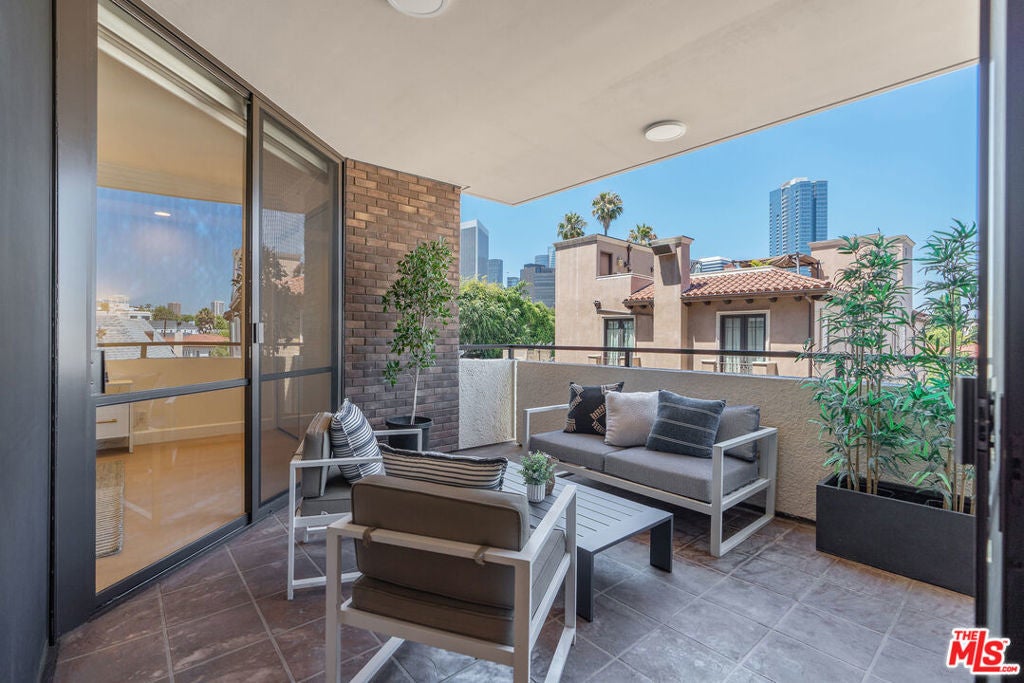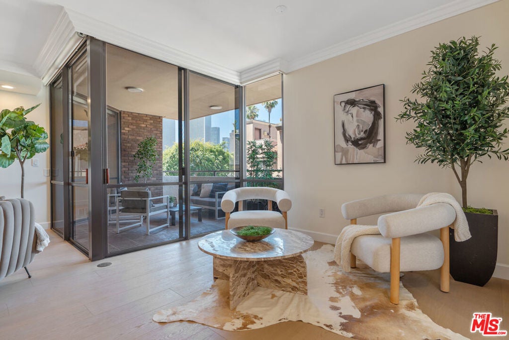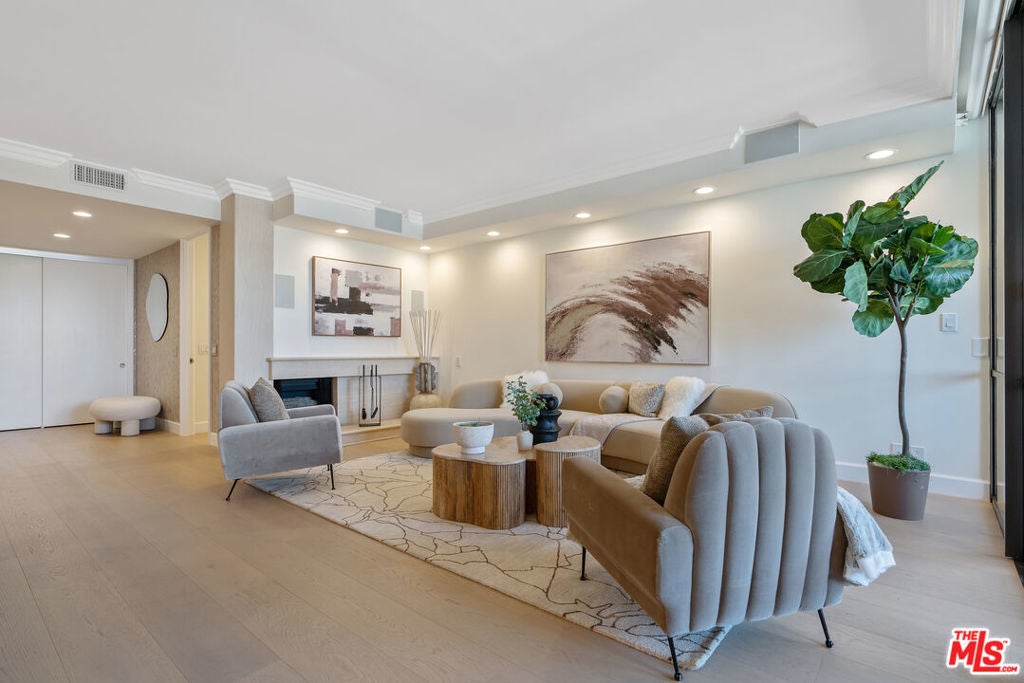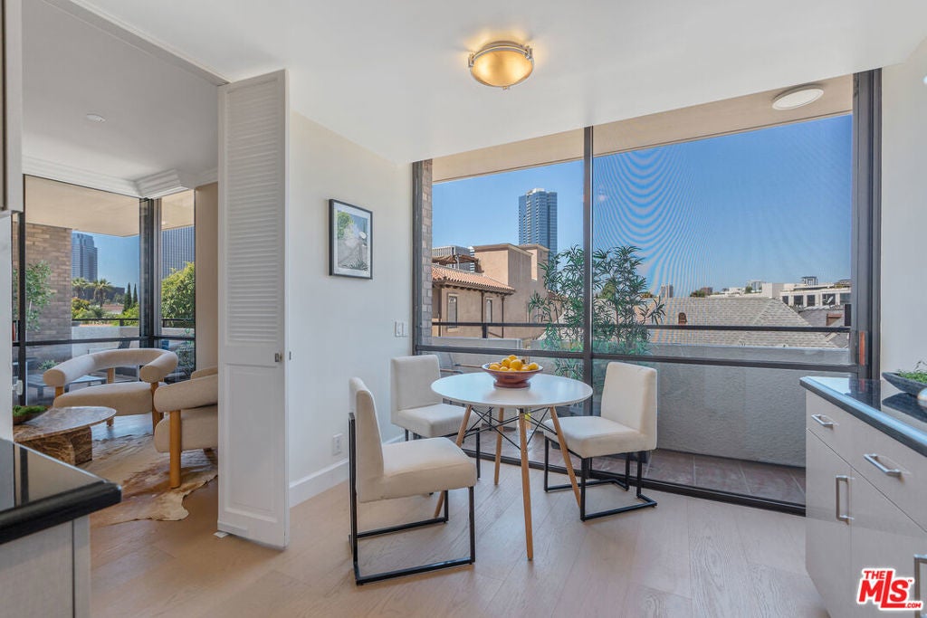 Sophisticated Unit Located in the heart of Beverly Hills, this luxurious and light-filled condo in the prestigious full-service 211 Spalding building offers the ultimate in style, comfort, and location. A formal entry sets the tone, opening to a spacious open-concept living and dining area framed by floor-to-ceiling glass and drenched in natural light. The living room features a fireplace, cozy lounge nook, and direct access to an expansive private patio with stunning Century City skyline views - perfect for indoor-outdoor entertaining. The chef's kitchen boasts granite countertops, top-tier stainless steel appliances, abundant custom cabinetry, a charming breakfast nook, and an adjoining laundry room for convenience. The primary suite is a tranquil retreat with its own private patio, a spa-inspired bath with soaking tub, glass-enclosed shower, dual vanities, and a massive custom walk-in closet. A well-appointed guest suite offers its own private patio, en-suite bath, and an ideal work-from-home niche. Other highlights include wide-plank hardwood floors, central HVAC, floor-to-ceiling windows, and a well-designed layout offering privacy with bedroom suites on opposite sides of the unit. A chic powder room adds convenience for guests. Enjoy resort-style amenities in this full-service luxury building: 24-hour concierge and doorman, valet parking, sparkling pool and spa, expansive sun deck, state-of-the-art fitness center, and sauna. This elegant and move-in ready residence offers the perfect blend of sophistication and access to the very best of Beverly Hills - from world-class dining to designer boutiques on Rodeo Drive. A rare offering in an iconic location.