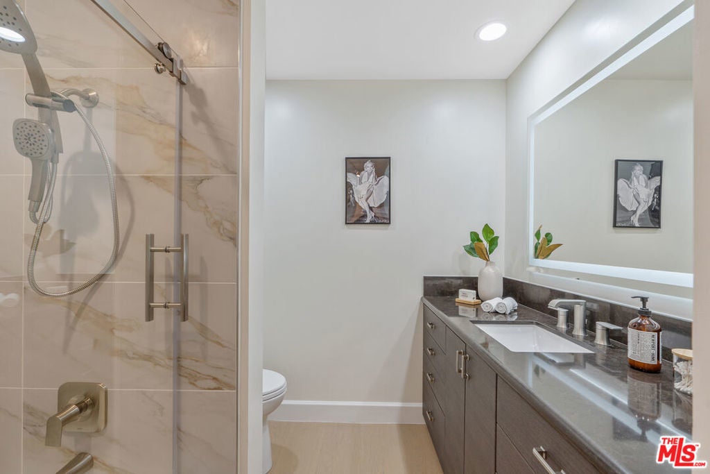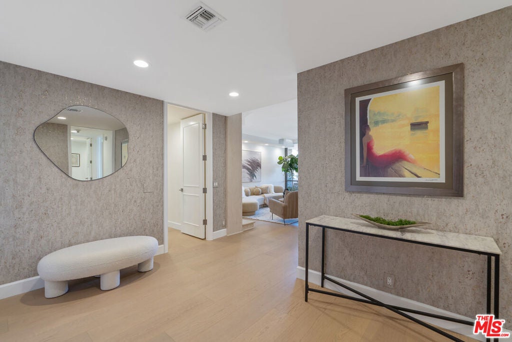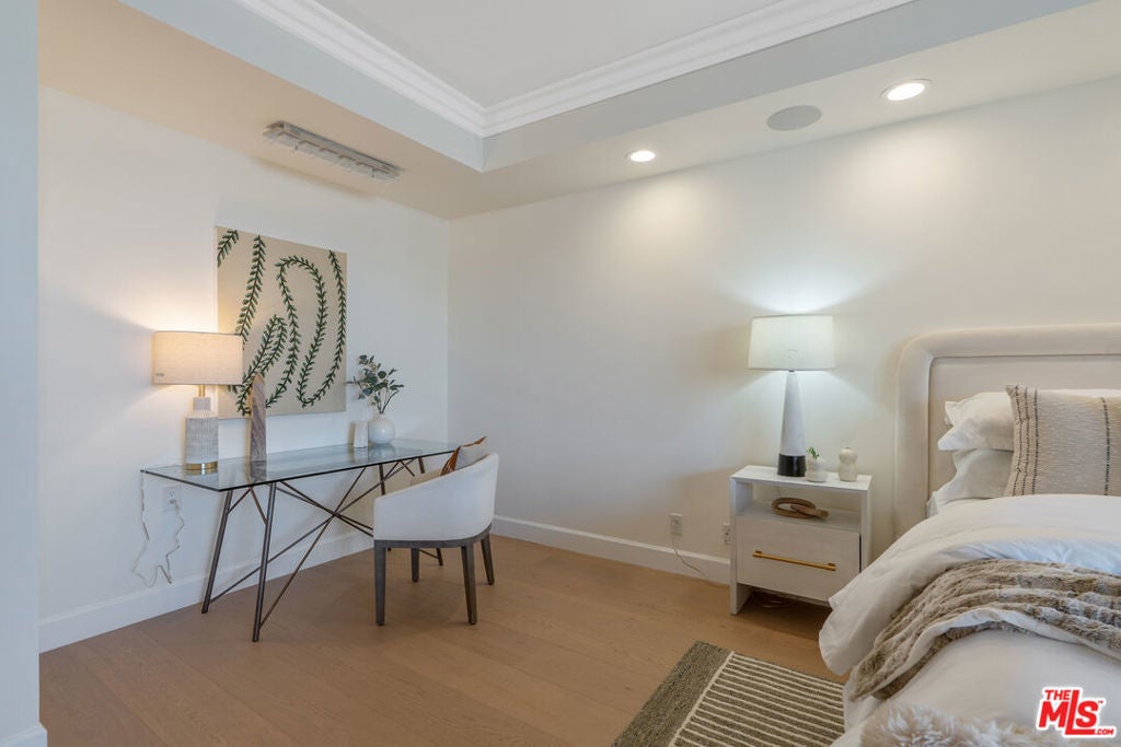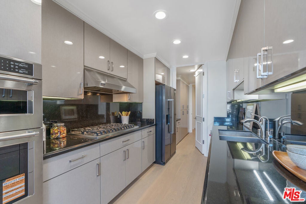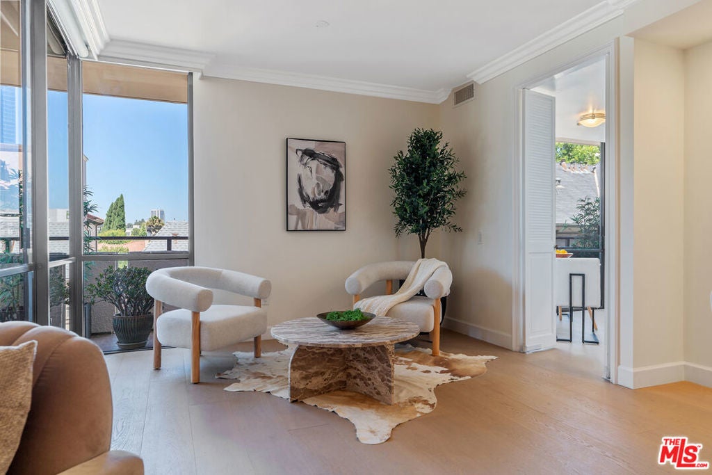 Sophisticated Unit Located in the heart of Beverly Hills, this luxurious and light-filled condo in the prestigious full-service 211 Spalding building offers the ultimate in style, comfort, and location. A formal entry sets the tone, opening to a spacious open-concept living and dining area framed by floor-to-ceiling glass and drenched in natural light. The living room features a fireplace, cozy lounge nook, and direct access to an expansive private patio with stunning Century City skyline views - perfect for indoor-outdoor entertaining. The chef's kitchen boasts granite countertops, top-tier stainless steel appliances, abundant custom cabinetry, a charming breakfast nook, and an adjoining laundry room for convenience. The primary suite is a tranquil retreat with its own private patio, a spa-inspired bath with soaking tub, glass-enclosed shower, dual vanities, and a massive custom walk-in closet. A well-appointed guest suite offers its own private patio, en-suite bath, and an ideal work-from-home niche. Other highlights include wide-plank hardwood floors, central HVAC, floor-to-ceiling windows, and a well-designed layout offering privacy with bedroom suites on opposite sides of the unit. A chic powder room adds convenience for guests. Enjoy resort-style amenities in this full-service luxury building: 24-hour concierge and doorman, valet parking, sparkling pool and spa, expansive sun deck, state-of-the-art fitness center, and sauna. This elegant and move-in ready residence offers the perfect blend of sophistication and access to the very best of Beverly Hills - from world-class dining to designer boutiques on Rodeo Drive. A rare offering in an iconic location.