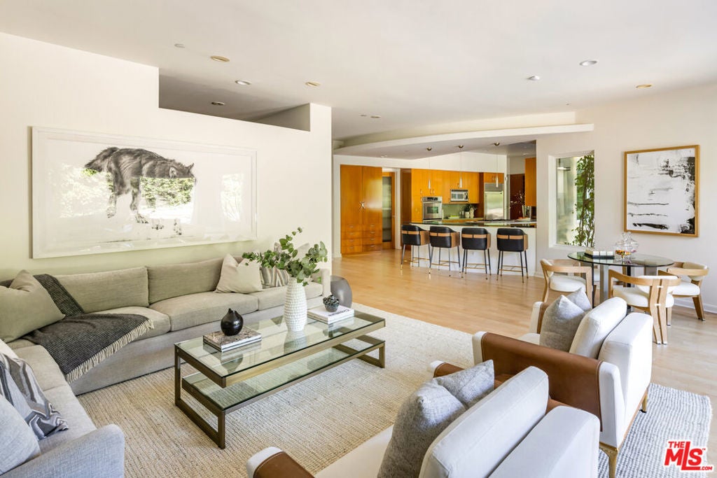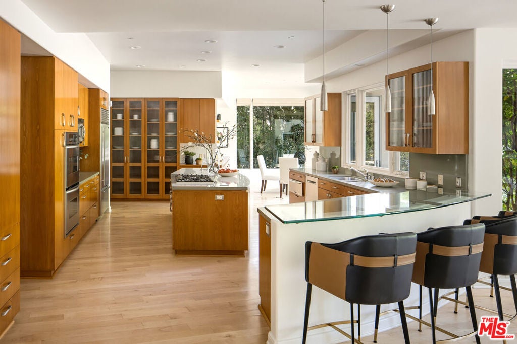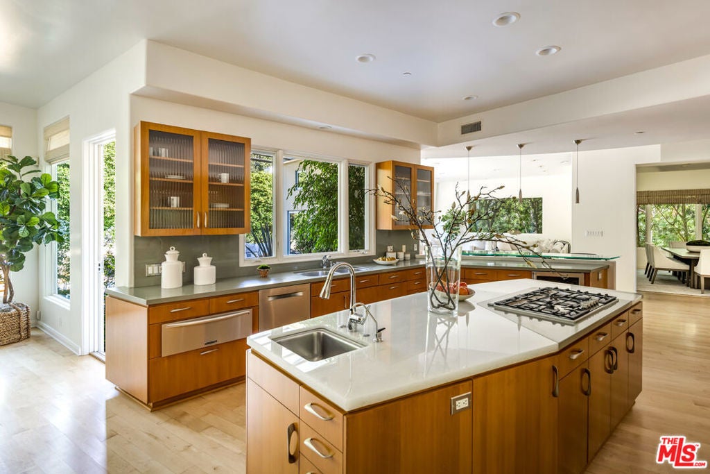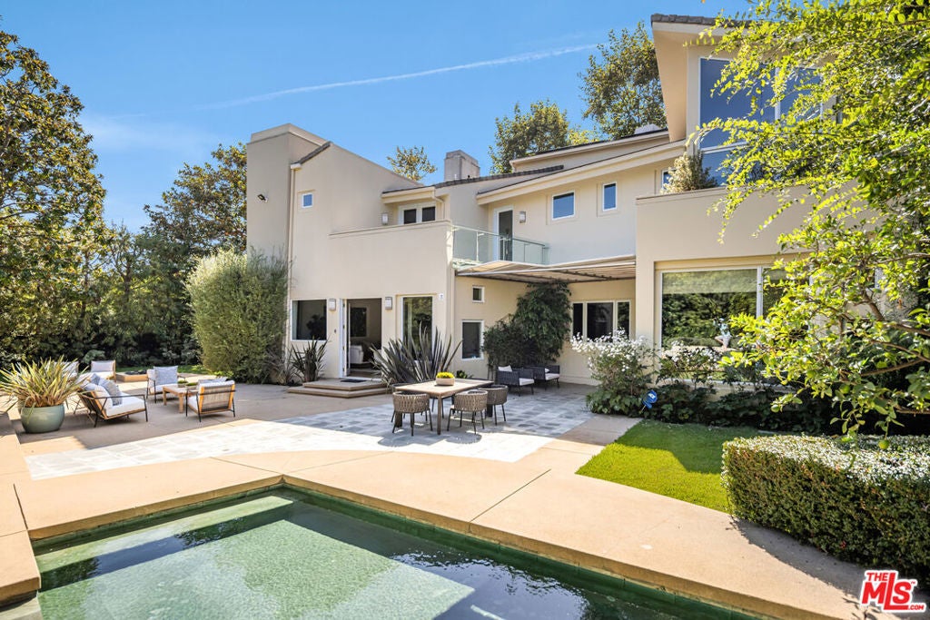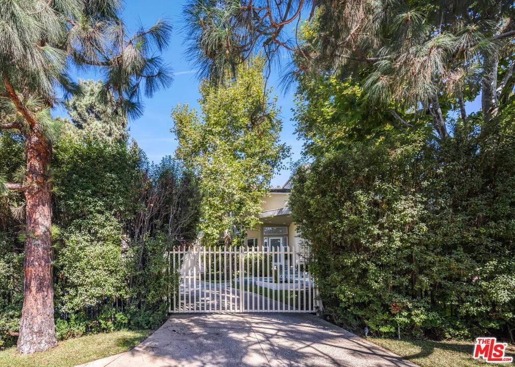Tucked away in a quiet and picturesque nook of Brentwood Park south of Sunset, in close proximity to the Brentwood Country Mart, lies this warm, yet striking custom-built Contemporary done by the current owner. Set behind tall hedges and gates amidst towering trees, this uplifting, sun-filled home offers the very best California lifestyle. Open free-flowing floor plan, clean lines, lofty spaces with soaring ceilings all bathed in natural light, walls of glass, wonderful indoor-outdoor flow, wrap-around gardens, and great privacy & quiet. Wonderful drama, detail and quality of workmanship and materials throughout. Grand scale entry with sweeping stair and awe-inspiring voluminous ceiling leads to step-down formal living room with bar, formal dining room and library/den with built-ins and private bath. Expansive cook's kitchen, sunny breakfast room and spacious family room with fireplace all overlook and open to fabulous private yard with ample patios for entertaining, sparkling pool, spa with children's wading area and two grassy areas. Four spacious bedrooms upstairs, each with its own bath, including exceptional owner's suite with generous sitting area, fireplace, terrace, lavish bath and room size walk-in closet, plus a downstairs guest bedroom. Other features and amenities include maple hardwood and stone floors, extensive built-ins, and an oversized three-car garage. A truly extraordinary home with distinctive design in the very finest Brentwood neighborhood-- close to world class shopping and restaurants.