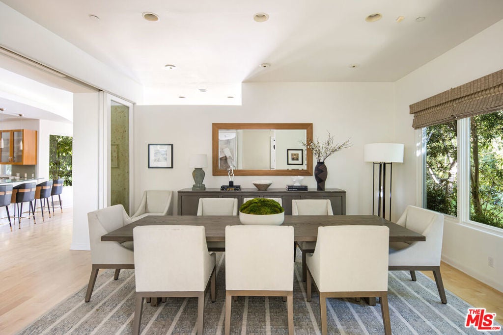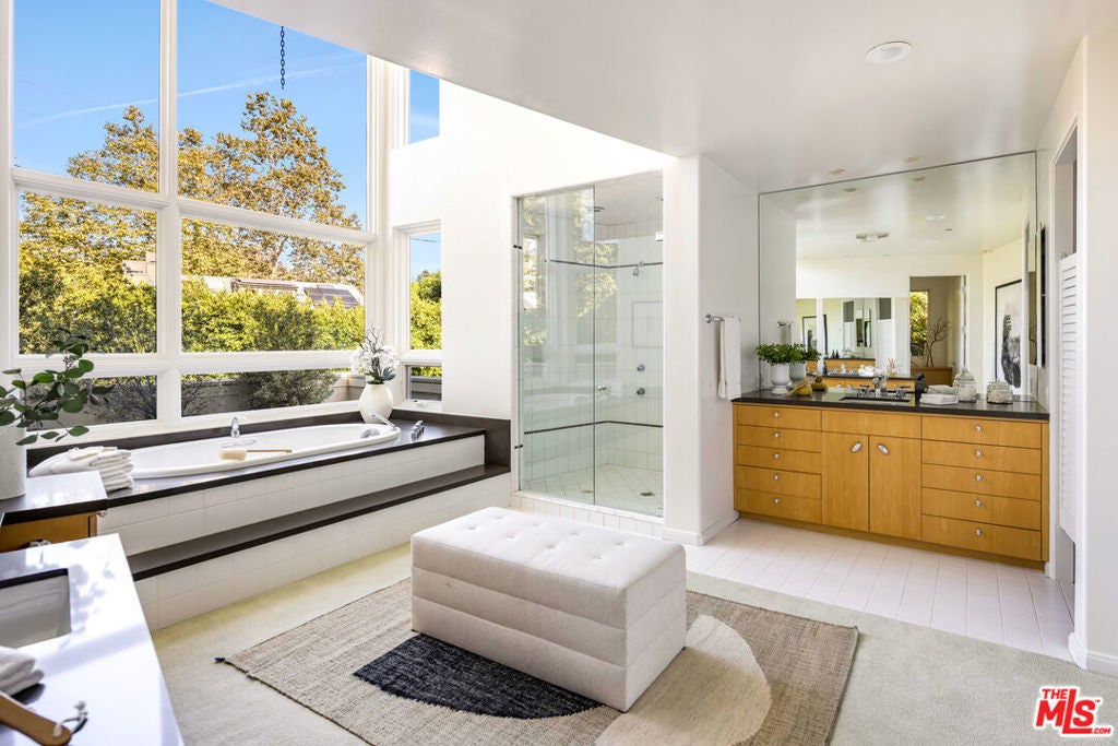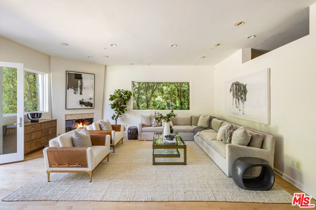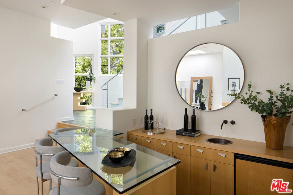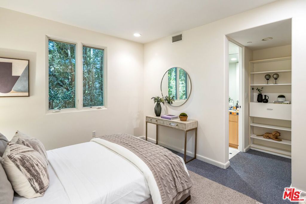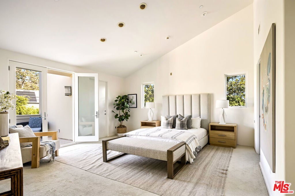 Tucked away in a quiet and picturesque nook of Brentwood Park south of Sunset, in close proximity to the Brentwood Country Mart, lies this warm, yet striking custom-built Contemporary done by the current owner. Set behind tall hedges and gates amidst towering trees, this uplifting, sun-filled home offers the very best California lifestyle. Open free-flowing floor plan, clean lines, lofty spaces with soaring ceilings all bathed in natural light, walls of glass, wonderful indoor-outdoor flow, wrap-around gardens, and great privacy & quiet. Wonderful drama, detail and quality of workmanship and materials throughout. Grand scale entry with sweeping stair and awe-inspiring voluminous ceiling leads to step-down formal living room with bar, formal dining room and library/den with built-ins and private bath. Expansive cook's kitchen, sunny breakfast room and spacious family room with fireplace all overlook and open to fabulous private yard with ample patios for entertaining, sparkling pool, spa with children's wading area and two grassy areas. Four spacious bedrooms upstairs, each with its own bath, including exceptional owner's suite with generous sitting area, fireplace, terrace, lavish bath and room size walk-in closet, plus a downstairs guest bedroom. Other features and amenities include maple hardwood and stone floors, extensive built-ins, and an oversized three-car garage. A truly extraordinary home with distinctive design in the very finest Brentwood neighborhood-- close to world class shopping and restaurants.