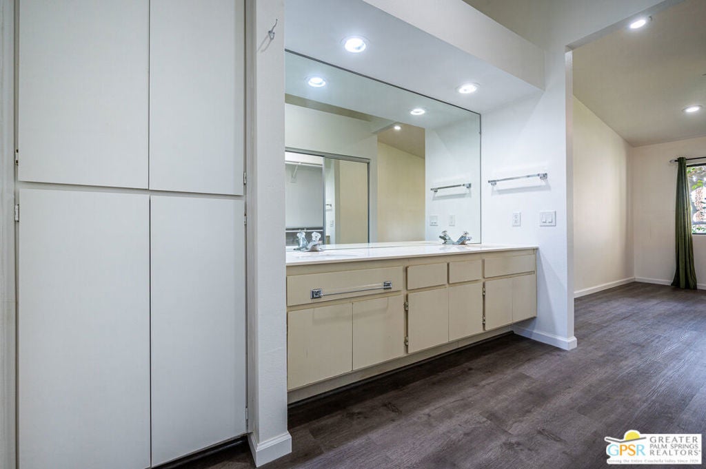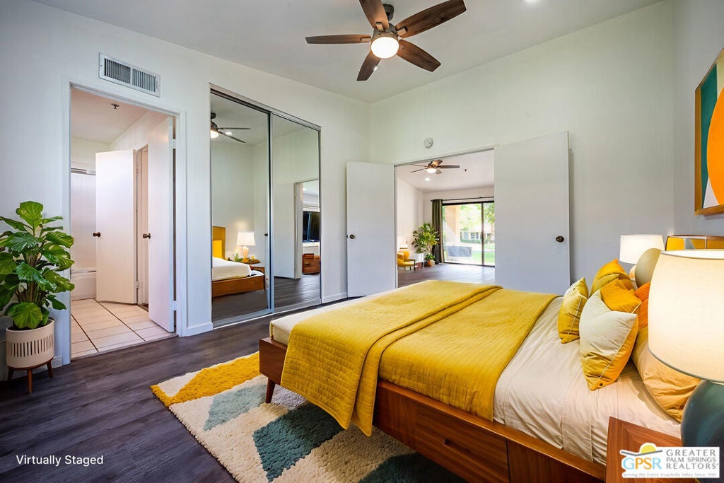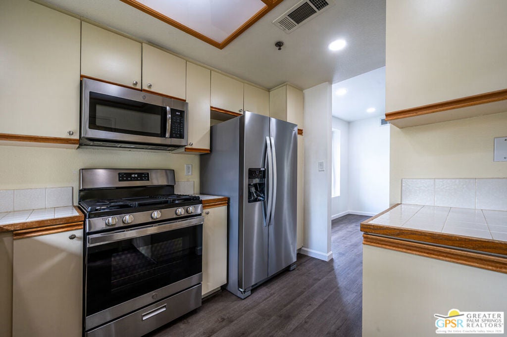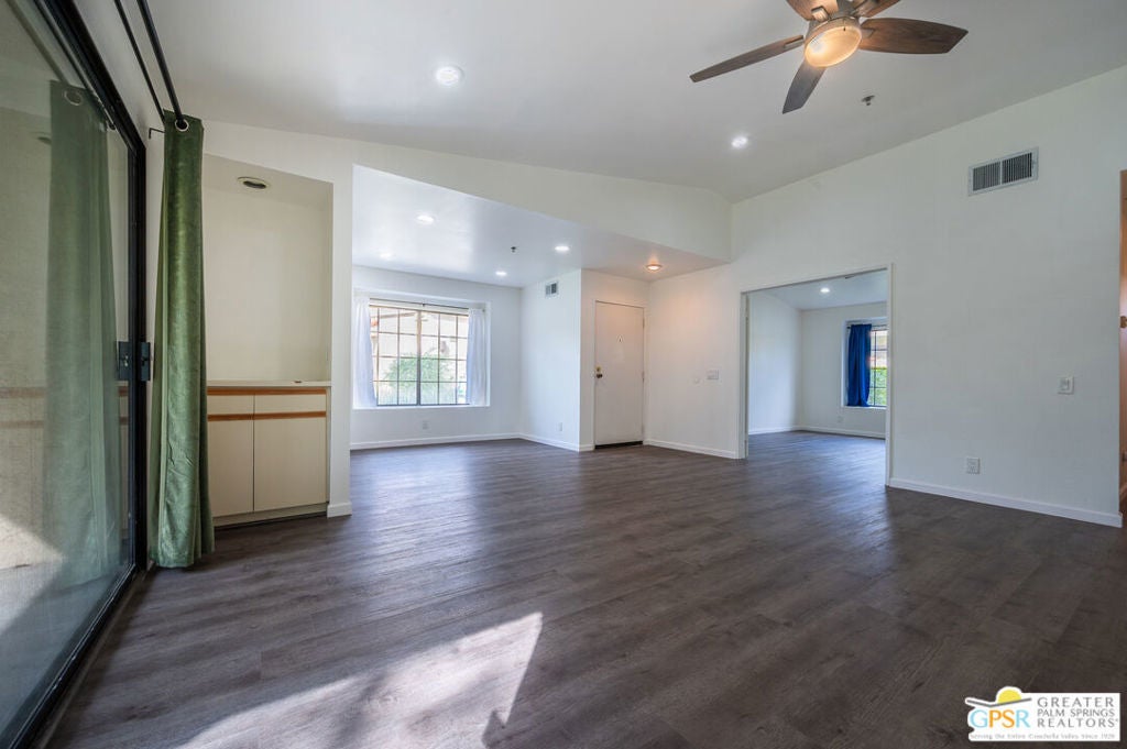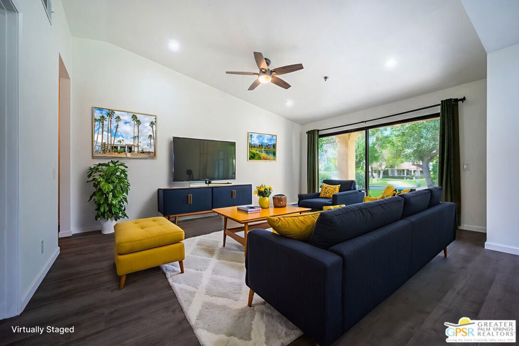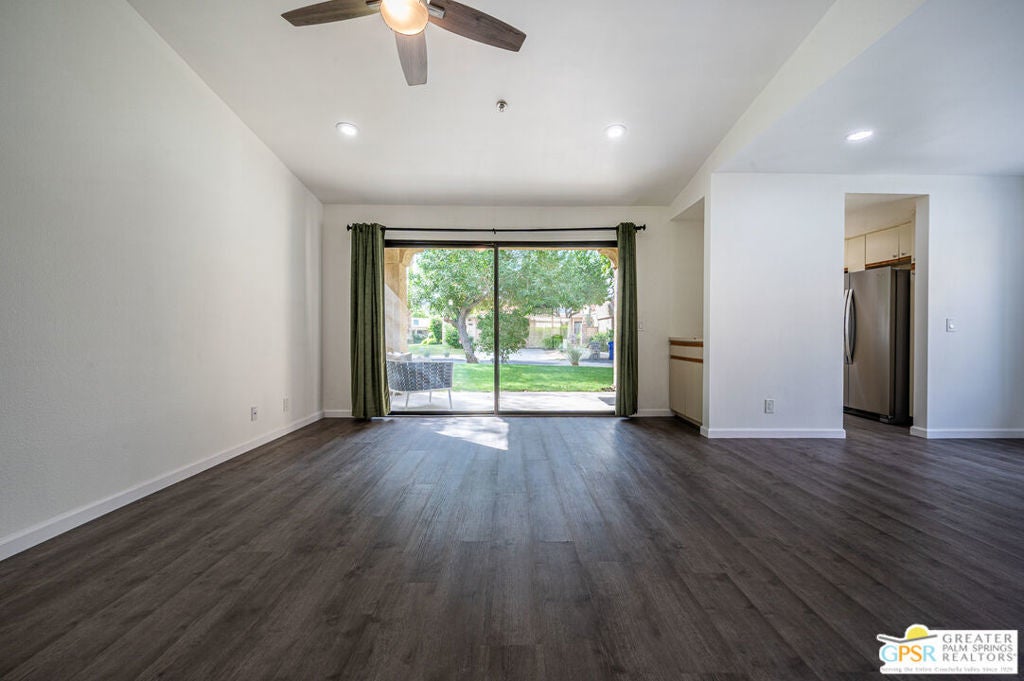 Experience resort-style living at its finest in this move-in-ready, rare single-story condo located within the coveted Cathedral Canyon Country Club. Perfectly situated between Palm Springs and Palm Desert, this beautifully updated 2-bedroom, 2-bath residence offers the ultimate blend of comfort, sophistication, and desert charm. Step inside to discover a freshly renovated interior featuring smooth, popcorn-free ceilings, new recessed lighting, modern ceiling fans, all-new outlets, and stylish new flooring and baseboards. The kitchen gleams with brand-new stainless steel appliances, making it a joy for everyday living or entertaining. Step outside to your private patio and take in breathtaking mountain views - the perfect backdrop for morning coffee, al fresco dining, or sunset cocktails. This beautifully maintained community has sparkling pools and spas, tennis courts, an 18-hole golf course and clubhouse all set against the dramatic San Jacinto Mountains. Enjoy peace of mind with an HOA that covers landscaping, exterior maintenance, roof, pools/spas, and security gates. The community is pet-friendly, allowing up to three pets per household. Schedule your private showing today and fall in love the moment you arrive.