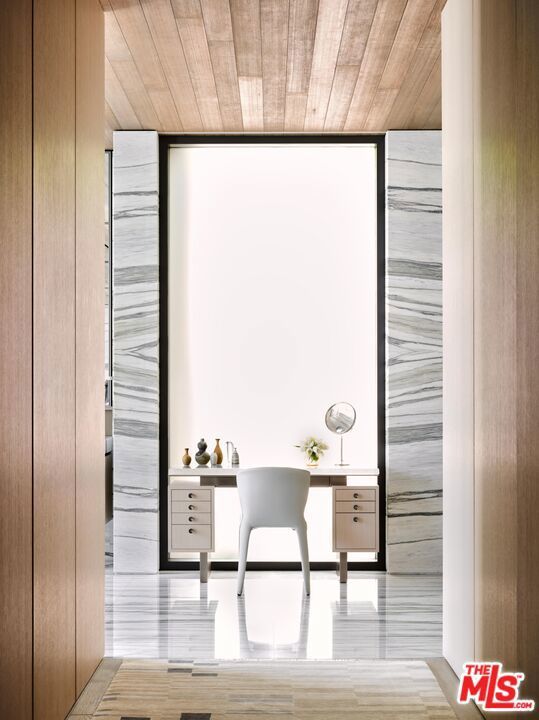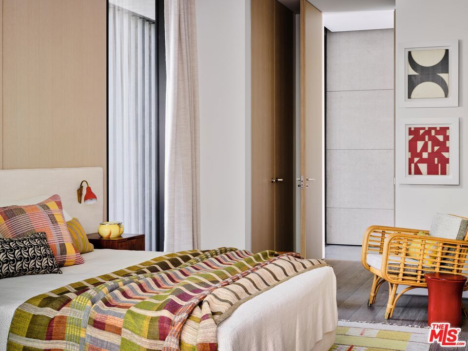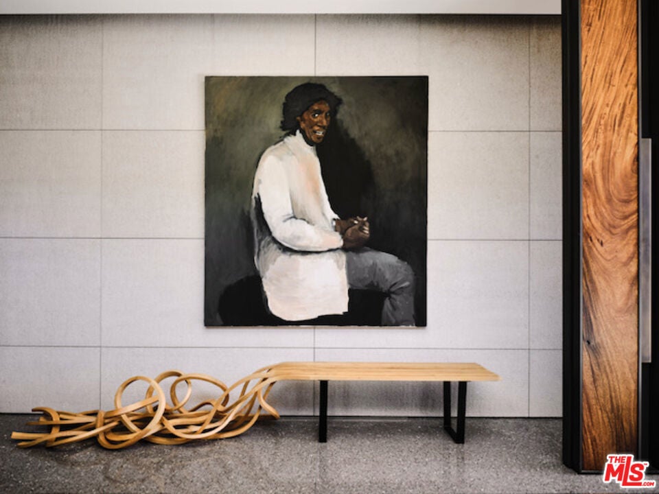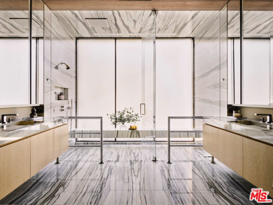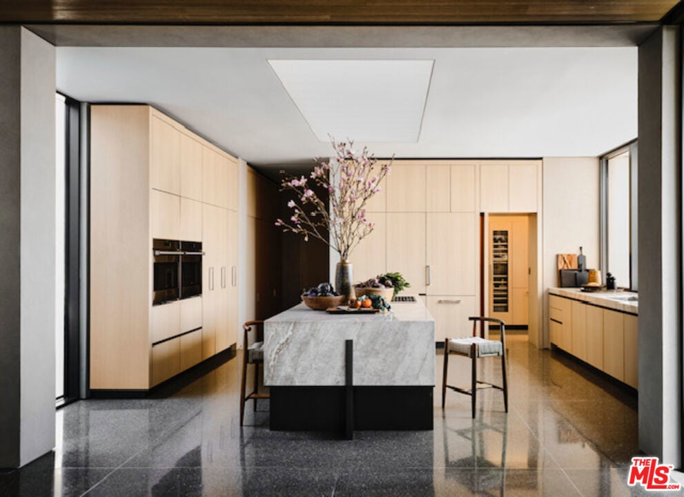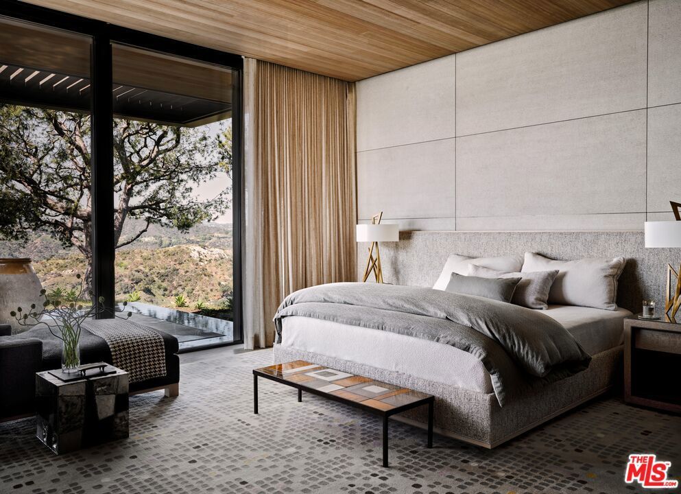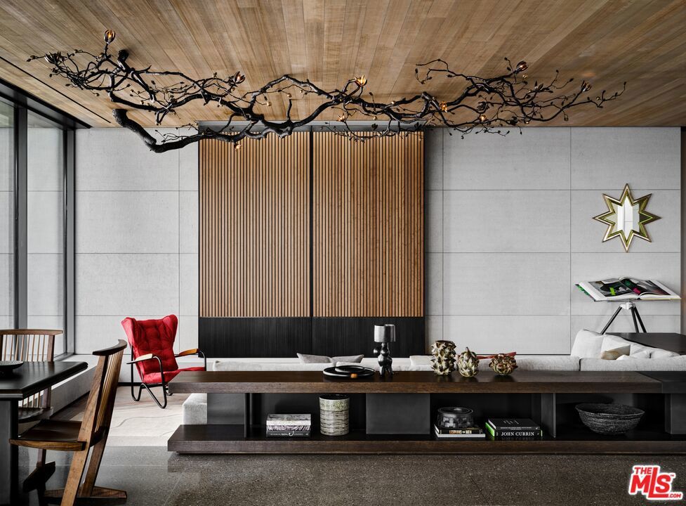 Set within a premier enclave of Trousdale Estates, this 6,500-square-foot architectural masterpiece merges contemporary luxury with the distinctive character of midcentury-modern design. Surrounded by panoramic views of the Santa Monica Mountains, this two-bedroom, four-bathroom estate offers an unparalleled living experience in one of Beverly Hills most coveted neighborhoods. In collaboration with Lucas Design Studio, the residence embodies soft contemporary architectural precision and material mastery, featuring an array of exotic finishes selected for their beauty and integrity, along with four sculptural gas fireplaces that bring warmth and architectural presence to the home. Floor-to-ceiling windows invite natural light and stunning vistas into every room, creating a harmonious flow between indoor and outdoor living. A striking flame-sprayed nickel wall extends from the exterior into the living room, setting the stage for a curated collection of design icons, including a curved Vladimir Kagan sofa, an Ado Chale coffee table, and a Paul Evans I Wavy front credenza, all resting atop a custom wool and silk rug from Fedora Design. Art takes center stage in this residence, with commissioned works throughout, including a mesmerizing light sculpture by LA artist David Wiseman that illuminates the sunken TV lounge. Inspired by the surrounding landscape, Wiseman cast acorns from the property's trees, incorporating them into the intricate design. At night, the sculpture transforms the space into an enchanting retreat, evoking the feeling of relaxing beneath a starlit canopy. The dining room exudes sophistication, with a Herve Van der Straeten dining table, complemented with dining chairs by designer Hans Wegner. The open-concept kitchen is equally striking, featuring wire-brushed and cerused rift oak cabinetry, quartzite countertops, and dazzling custom lighting. The primary suite is a unique sanctuary, with a custom-upholstered bed, luxurious textiles from de Le Cuona, and designer pieces by Roger Capron and Paul Evans. The vast spa-inspired primary bath is a study in exquisite stonework with two Toto toilets enhancing the spa-level experience. Midcentury Swedish flatweave rug, and vintage sconces elevate the guest suite's atmosphere of curated luxury. Floors are Terrazzo, bantered by bordered by limestone edges. Outside, the infinity pool extends to the edge of the living room, creating a seamless visual connection between water and sky. Thoughtfully designed outdoor spaces offer ample room for relaxation and entertaining, with breathtaking views serving as the perfect backdrop. A rare offering in a historic enclave once home to legends like Frank Sinatra and Elvis Presley, this residence is a masterclass in design, blending artistry, luxury, and architectural integrity. This estate is being offered furnished as curated for someone desiring a highly designed atmosphere throughout. Particular attention was paid to the lighting design for the home, pool, and landscaping, to the point where the homeowners insist that interested Buyers experience the property both during the day and in the evening to fully appreciate it. Highlights include Italian iGuzzini laser lighting integrated throughout the home. The residence is prominently featured on the sites of its creative partners - Lucas Studio (lucasinterior.com), TLD Lighting Design (t-ld.com), and Hocker Design Group (hockerdesign.com) offering an additional lens into the home's exceptional design.