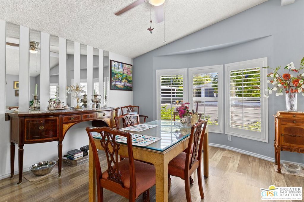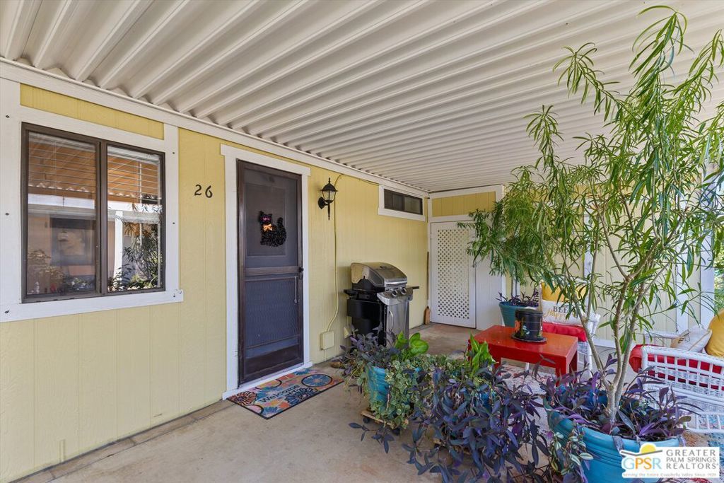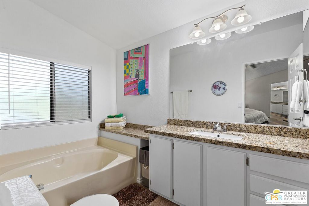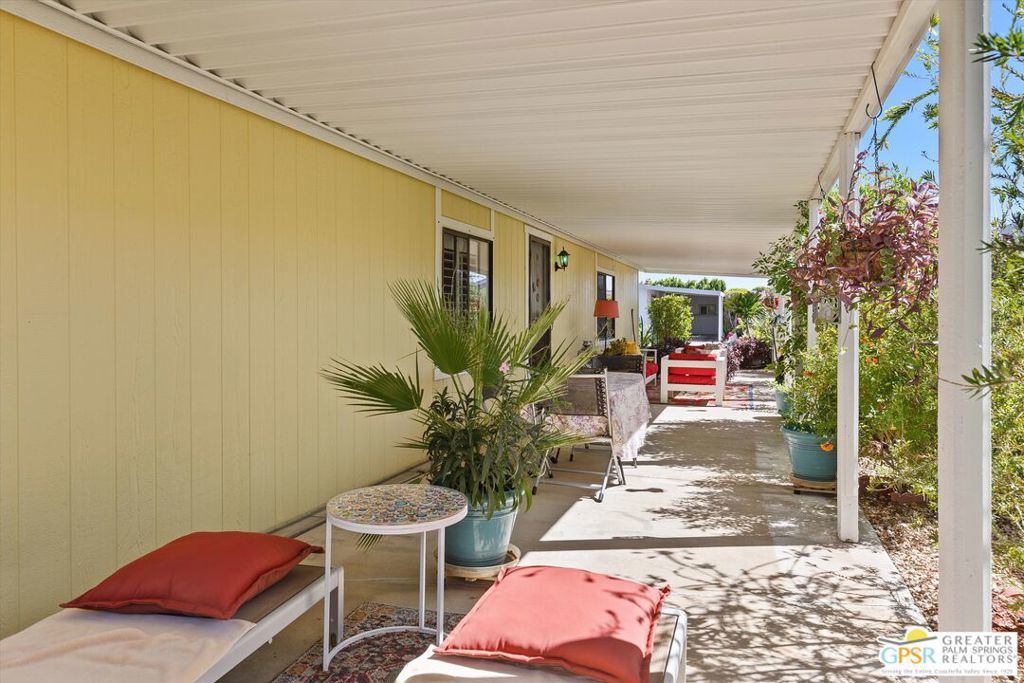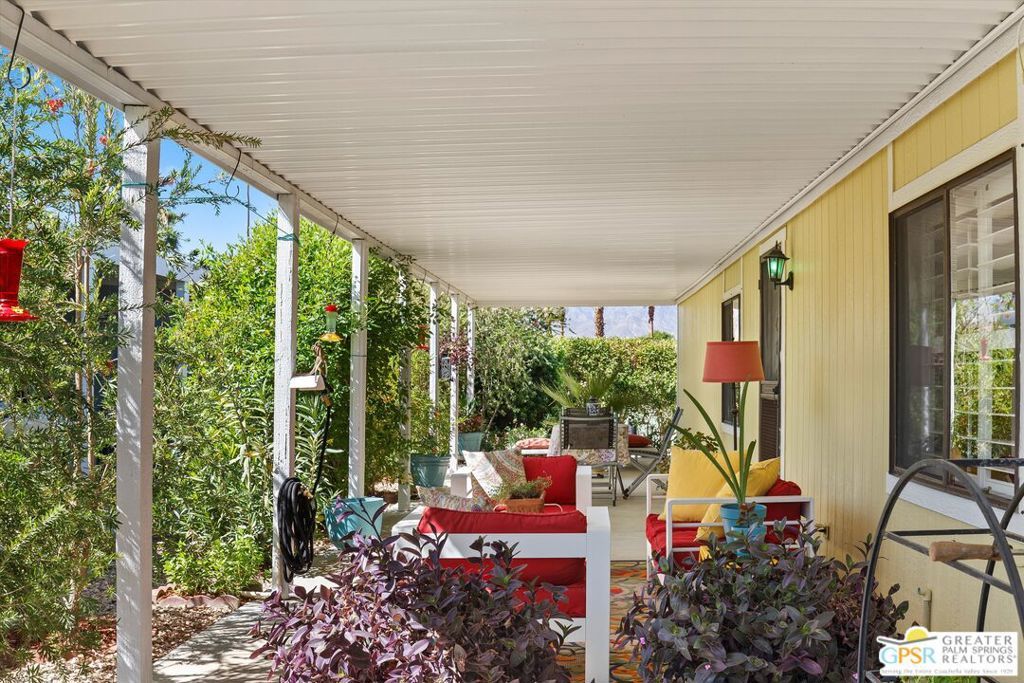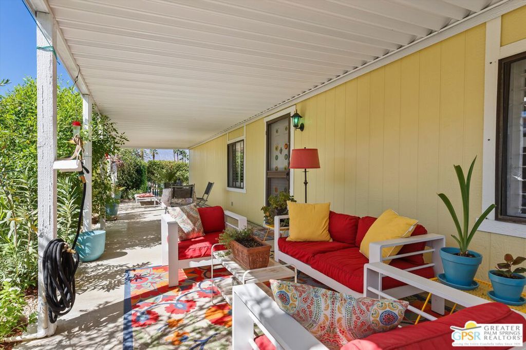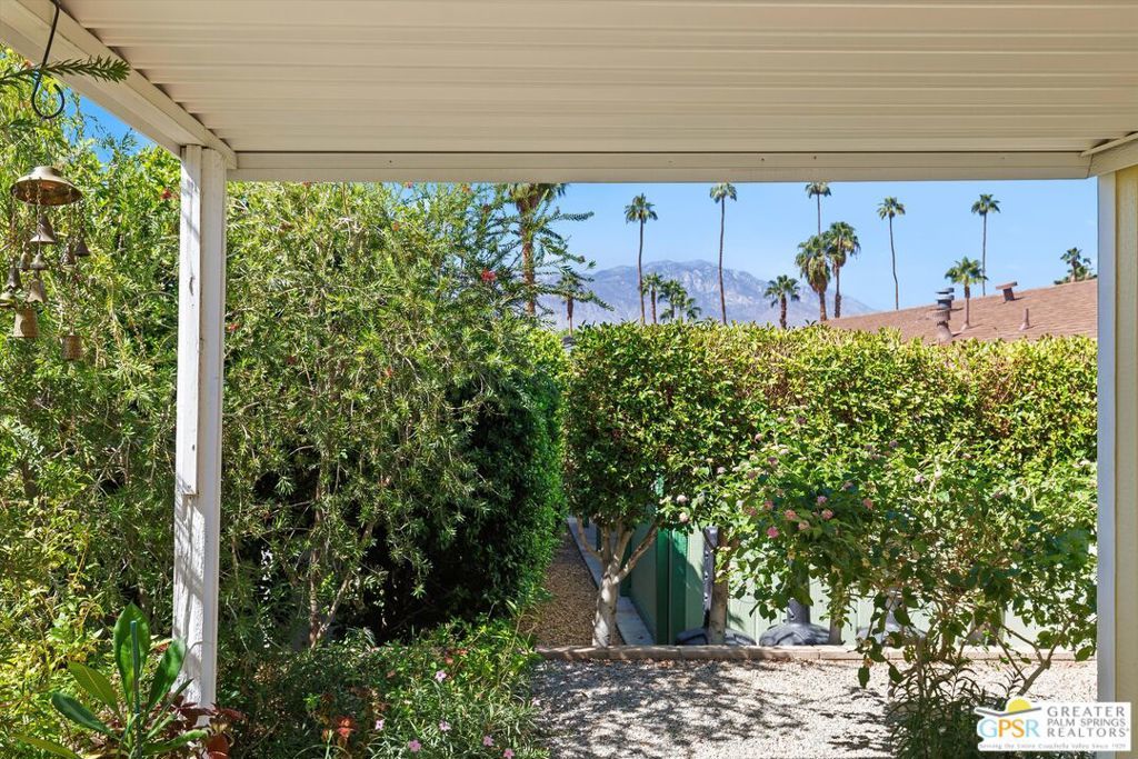 Embraced by colorful gardens, mountain views and shaded outdoor spaces on both sides, this move-in-ready residence elevates indoor/outdoor living to new heights at Palm Desert's 55-and-better Suncrest Country Club. Built in 1986, the manufactured home is open and bright, with two bay windows welcoming natural light into the seamless living and dining room space and vaulted ceilings lending a sense of openness throughout. Approximately 1,344 square feet, the residence showcases newer woodgrain laminate flooring, upgraded granite countertops in the kitchen and baths, a NU Aqua water filtration system, plantation shutters, mirrored wardrobe doors, ceiling fans and fresh paint. The kitchen flows directly to the dining room and hosts white cabinetry, stainless steel appliances, a peninsula, and full tile backsplash. An oversized laundry room off the kitchen opens to the outdoors and presents a built-in desk with granite top. Two private bedrooms and two baths include a spacious primary suite with generous closet, a soaking tub and separate shower. Settled in a quiet and serene area of the community, this lovingly maintained home offers a seating area, large storage space and golf cart parking on the carport side, while the entry side features a full-length patio that is primed for entertaining. Located in the western end of Palm Desert near Rancho Mirage and Palm Springs, Suncrest Country Club is home to a luxurious clubhouse with billiards, library, pro shop and the popular Jazzy J's cafe. Residents appreciate having easy access to three swimming pools, in-ground spas, lighted tennis and pickleball courts, and a gorgeous 9-hole golf course. Premium resorts, abundant shopping, countless restaurants, and Eisenhower Medical Center are moments from home.