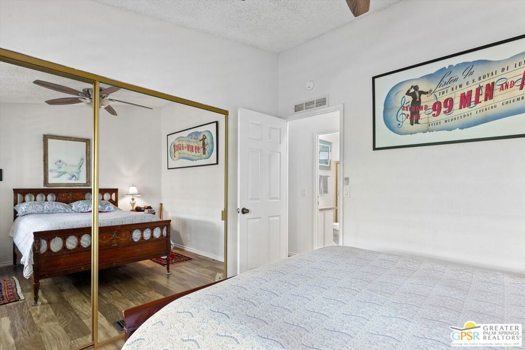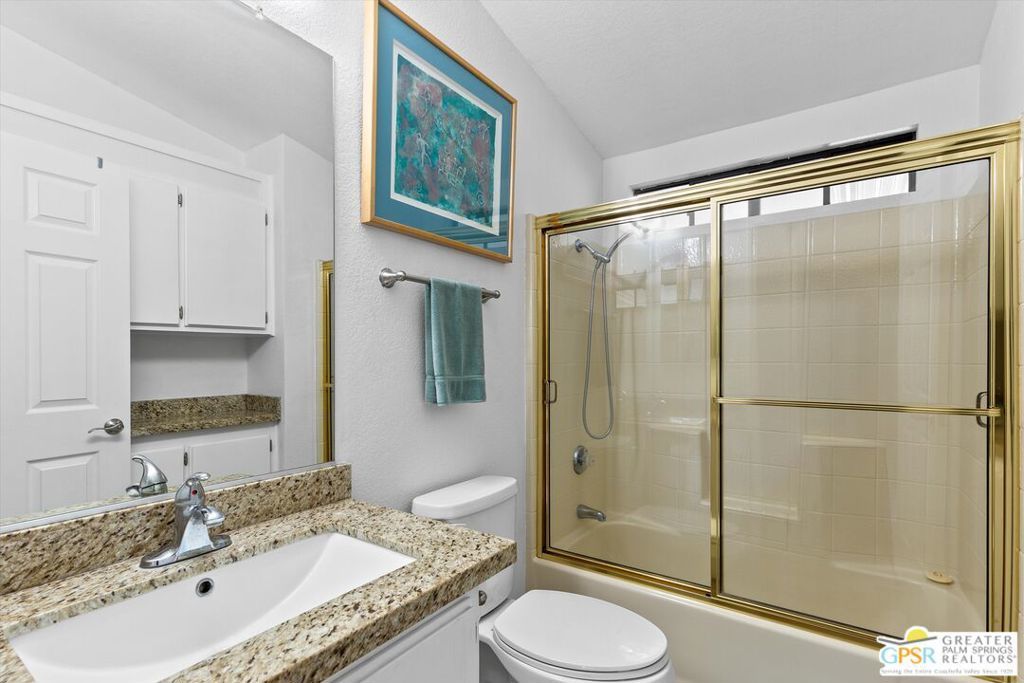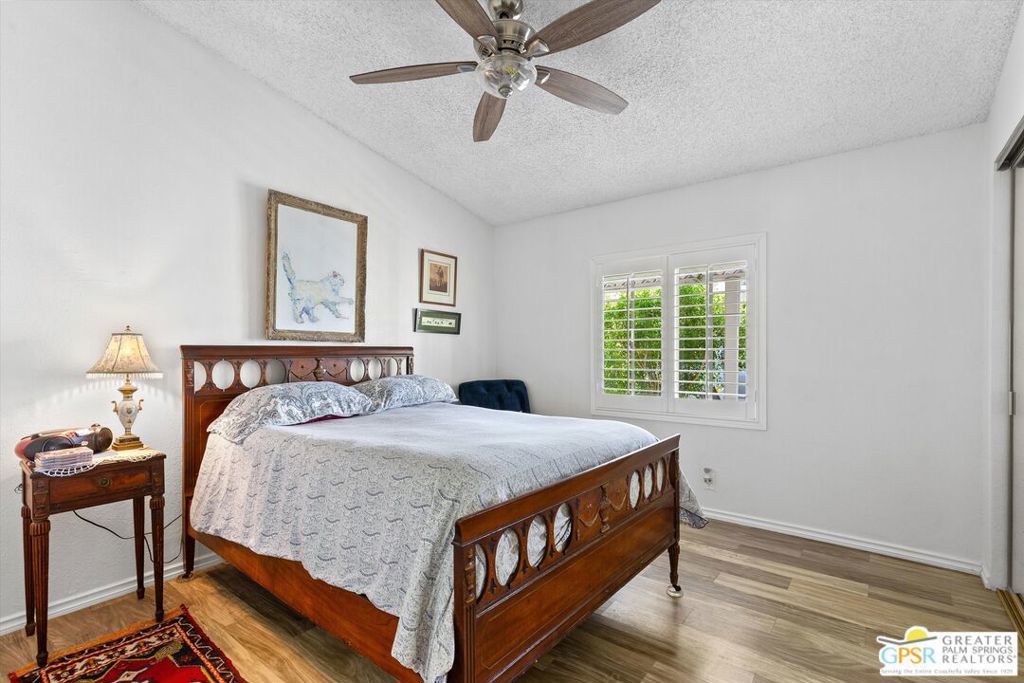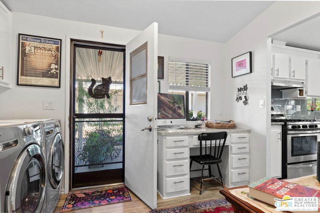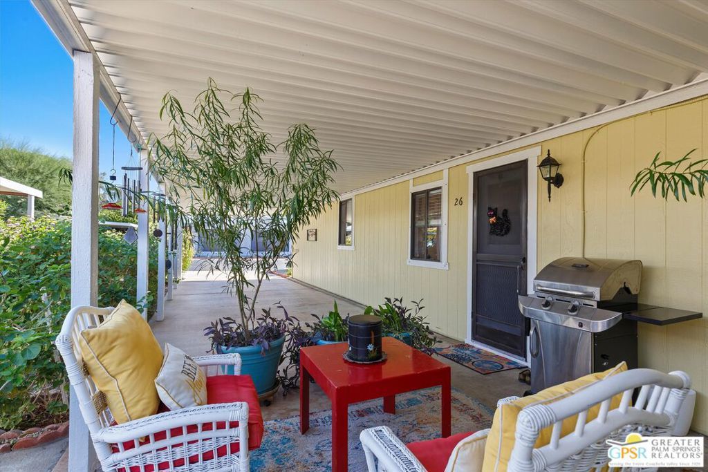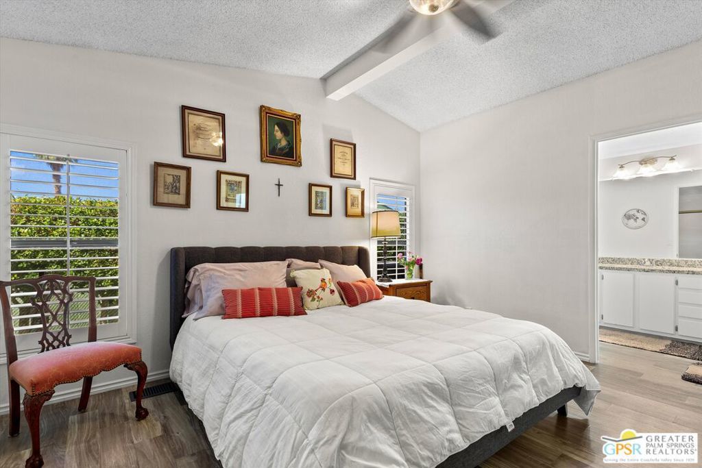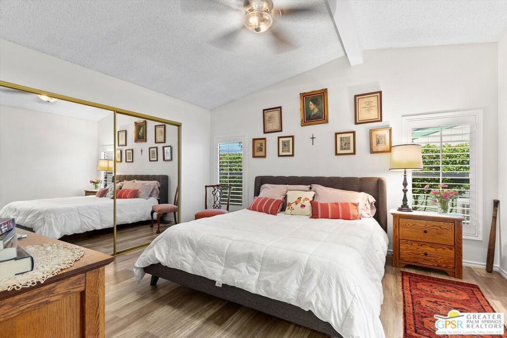 Embraced by colorful gardens, mountain views and shaded outdoor spaces on both sides, this move-in-ready residence elevates indoor/outdoor living to new heights at Palm Desert's 55-and-better Suncrest Country Club. Built in 1986, the manufactured home is open and bright, with two bay windows welcoming natural light into the seamless living and dining room space and vaulted ceilings lending a sense of openness throughout. Approximately 1,344 square feet, the residence showcases newer woodgrain laminate flooring, upgraded granite countertops in the kitchen and baths, a NU Aqua water filtration system, plantation shutters, mirrored wardrobe doors, ceiling fans and fresh paint. The kitchen flows directly to the dining room and hosts white cabinetry, stainless steel appliances, a peninsula, and full tile backsplash. An oversized laundry room off the kitchen opens to the outdoors and presents a built-in desk with granite top. Two private bedrooms and two baths include a spacious primary suite with generous closet, a soaking tub and separate shower. Settled in a quiet and serene area of the community, this lovingly maintained home offers a seating area, large storage space and golf cart parking on the carport side, while the entry side features a full-length patio that is primed for entertaining. Located in the western end of Palm Desert near Rancho Mirage and Palm Springs, Suncrest Country Club is home to a luxurious clubhouse with billiards, library, pro shop and the popular Jazzy J's cafe. Residents appreciate having easy access to three swimming pools, in-ground spas, lighted tennis and pickleball courts, and a gorgeous 9-hole golf course. Premium resorts, abundant shopping, countless restaurants, and Eisenhower Medical Center are moments from home.