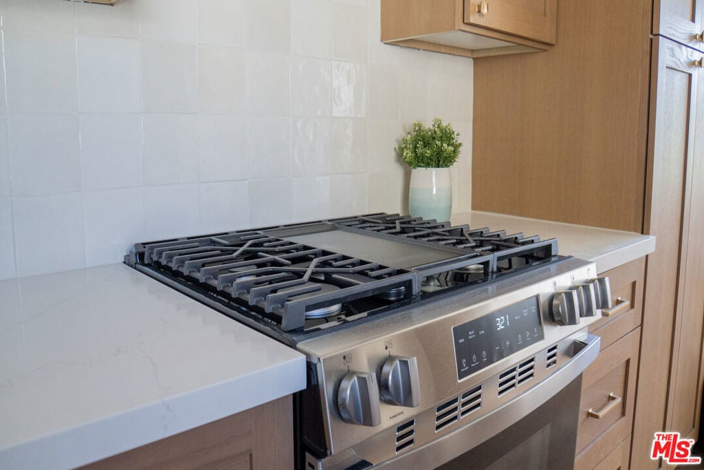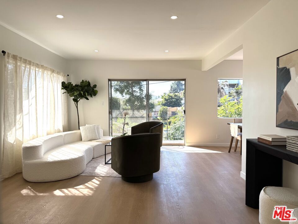 Spacious and updated Mid-Century condo in the heart of Los Feliz! This is a truly unique offering - a top-floor, end-unit condo in a quiet 1950's building, which has been completely restored and updated top-to-bottom with all new systems and designer finishes. The Ambrose sits on a peaceful street, lined with mature palm trees, perfectly situated between Hillhurst and Vermont. Tucked away to create calm, privacy and a connection with nature, yet close to all of the amazing amenities that make this neighborhood special! Originally built in 1959, the complex has been lovingly kept by the close-knit association, and retains that sought-after Mid-Century charm. Within this intimate complex, #8 stands out as an extraordinary unit. Sited on the top level and at the back with only one shared wall, the condo feels both airy and private, perched up away from the street. A complete retrofit and redesign has just been completed, with no surface left untouched. Systems such as plumbing, electrical and drain lines have been replaced. Walls have been stripped to the studs and reinforced, with new high-rated insulation added. New flooring, drywall, paint and recessed lighting throughout give a comfortable and luxurious feel. A brand new, oversized kitchen is chef-ready with all new cabinetry, quartz counters, stainless appliances, custom lighting and ample storage. The kitchen opens to a dedicated dining room with huge windows and a sleek chandelier. The spacious living room has a flexible layout, space for a WFH setup, and sliding glass doors that open onto the private balcony with Observatory views. The center hall boasts ample storage, including space for an in-unit W/D combo. Off the hall, a full bath perfectly incorporates an original cast iron tub with new designer tile, vanity, lighting and fixtures. The large primary bedroom creates a perfect retreat with clerestory windows, walk-in closet, and a beautiful new en-suite bath with walk-in shower, frameless glass enclosure, and dramatic floor-to ceiling tile. Meanwhile, the second bedroom is perfect as a guest room, office or nursery, and also includes an oversized walk-in closet. Finally, the dedicated carport space also includes additional storage. Located mid-block on Ambrose Ave, the building's location gives an ideal blend of privacy and convenience. Close to Griffith Park, transit, freeways, as well as the countless cafes, shops and dining options in Los Feliz and the surrounding neighborhoods, the home is also convenient to studios and employment centers in nearby Hollywood. With a sensible floor plan, original charm, meticulous upgrades, and thoughtful finishes, this move-in ready condo strikes a perfect balance and sits ready for its next chapter!