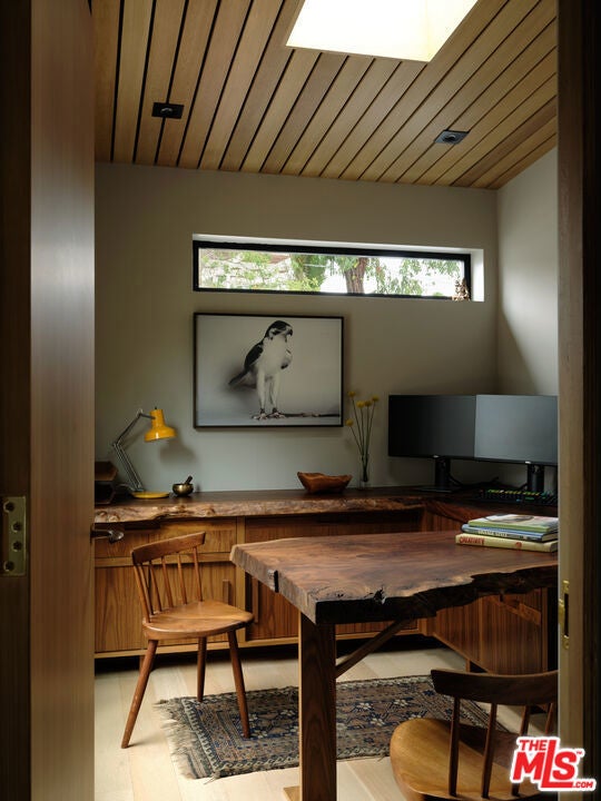 Gorgeously reimagined inside and out, this Point Dume residence has the atmosphere and amenities of a private resort, including a coveted Riviera 2 beach key. Complete with north-south tennis, pool and spa, sports court, outdoor kitchen, and manicured landscaping, this is indoor-outdoor living at its finest. Located behind gates at the end of a private drive, the all en-suite estate has an open, contemporary interior with high, plank-and-beam oak wood ceilings, skylights, art gallery walls, wood floors, and large windows and glass doors opening onto decks, patios, and gardens. The multi-level central living area features a spacious, step-down living room with double-height ceilings, a corner fireplace, and floor-to-ceiling glass with doors to the backyard. Four wide, floating wood steps lead up to the dining area, which features a fossilised stone wet bar, built-in cabinets, and a wall of glass opening onto a back deck. Along with the foyer, also on this level is the kitchen, a culinary masterpiece with beautiful fossilised honed stone countertops, a large island with bar seating, top-of-the-line appliances, and expansive walnut pantry cabinets. Off the entry, steps lead down to the den/media room, which has doors to both the front and back yards. A beautiful skylight office features a custom walnut live-edge built-in desk. The first of the home's five en-suite bedrooms is a bunk room, with four built-in oak bunks and a built-in desk. A half-flight up from the foyer is a hallway with two bedrooms, including the primary suite, which has wraparound windows, a private deck overlooking the backyard and pool, and a dramatic marble and heath tile skylight bath with a pool-view stone tub. Steps down from the living room are two more en-suite bedrooms, both opening to the backyard, one with a covered patio just outside. The property is open and yet exceedingly private. At the front of the house, where there is ample room for guest parking, there is an entry courtyard garden with two decks. The back of the property provides an appealing array of settings for entertaining, lounging, and recreation, including an outdoor kitchen with a pizza oven, Lynx barbecue, and adjacent al fresco dining area. Decks and a wide back lawn offer ideal spots for watching tennis, and the pool has a huge sun deck plus another large lawn that extends along the side of the house. The home's additional features include a powder room, a large laundry room, and a hidden surfboard storage under the deck. This serene and majestic residence is a private and luxurious enclave on ultra-desirable Point Dume.