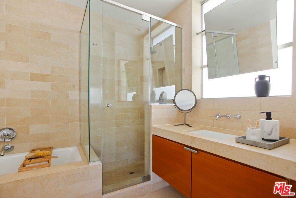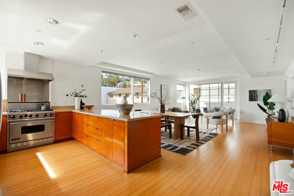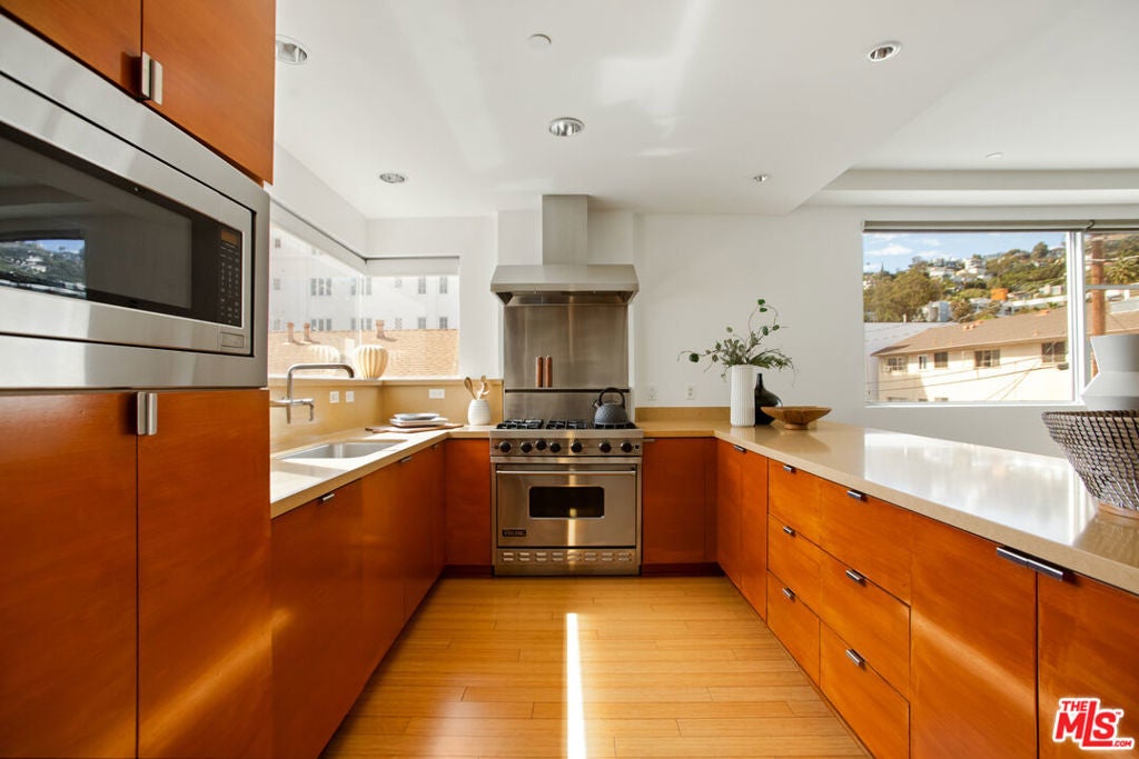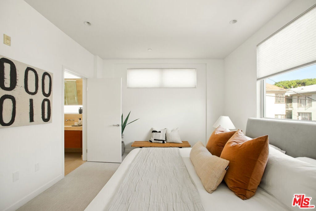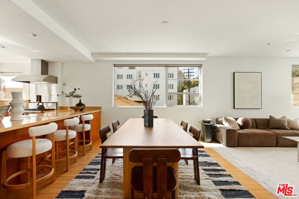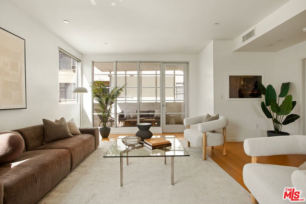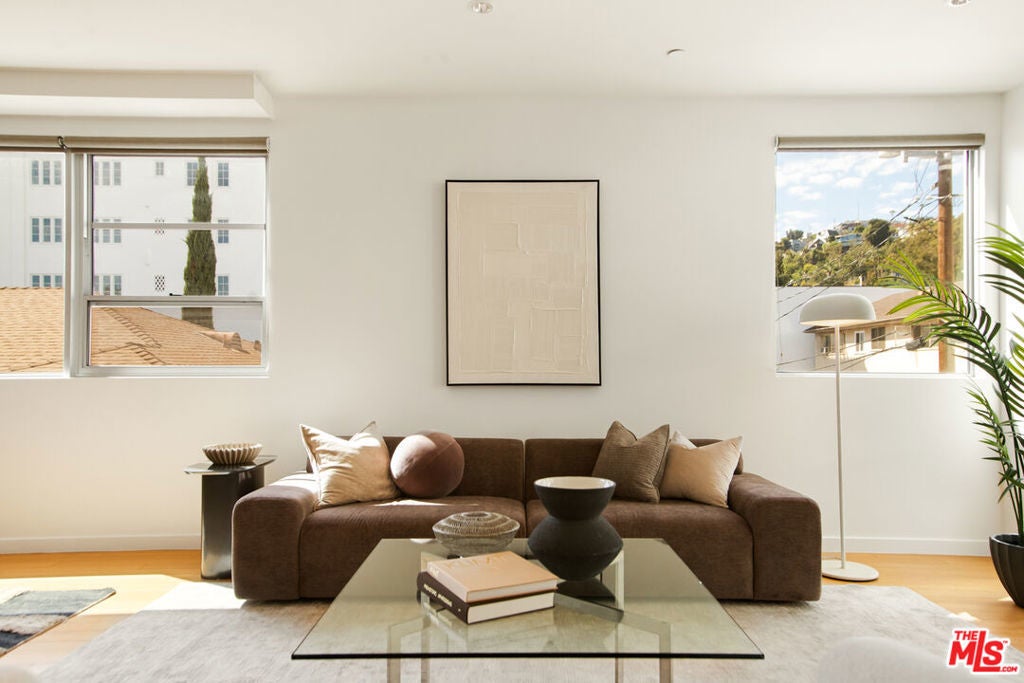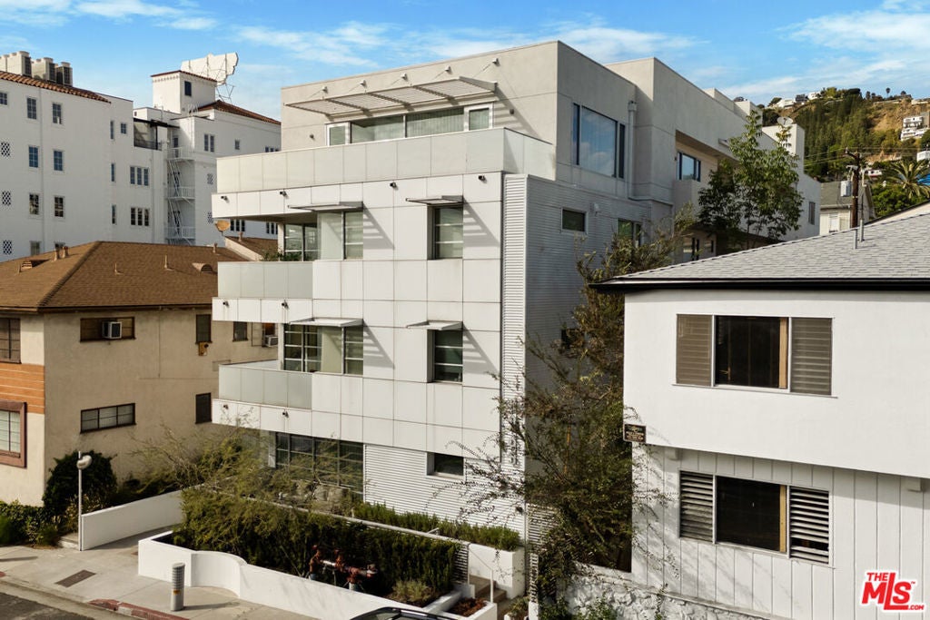 Discover your architectural urban home just off the famed Sunset Strip with exceptional dining, shopping, and entertainment just moments away. Tucked quietly at the rear of this boutique building with only 7 units, enjoy rare tranquility amidst the city's vibrancy with the unique advantage of having no common walls with other units, creating privacy and calm. This modern condo offers a seamless blend of style and convenience. Immediately sense the thoughtful design through the entryway hall opening up to single-level living, with an open concept kitchen with southern views and bar seating, ideal for ease and entertaining. Contemporary and upscale finishes create an inviting retreat while oversized windows encompassing all directions and floor-to-ceiling terrace walls of glass bathe the space in natural light. Step onto your private oversized terrace creating outdoor additional living space. Expansive primary suite offers ample closet space and a spa-like separate soaking tub and glass enclosed shower. The second bedroom/flex space features a walk-in closet and well appointed ensuite bathroom for guests. Convenient in-unit stacked laundry and two tandem parking spots included. Building amenities offer secure lobby entry, oversized elevator, courtyard area, and subterranean gated garage with guest parking.