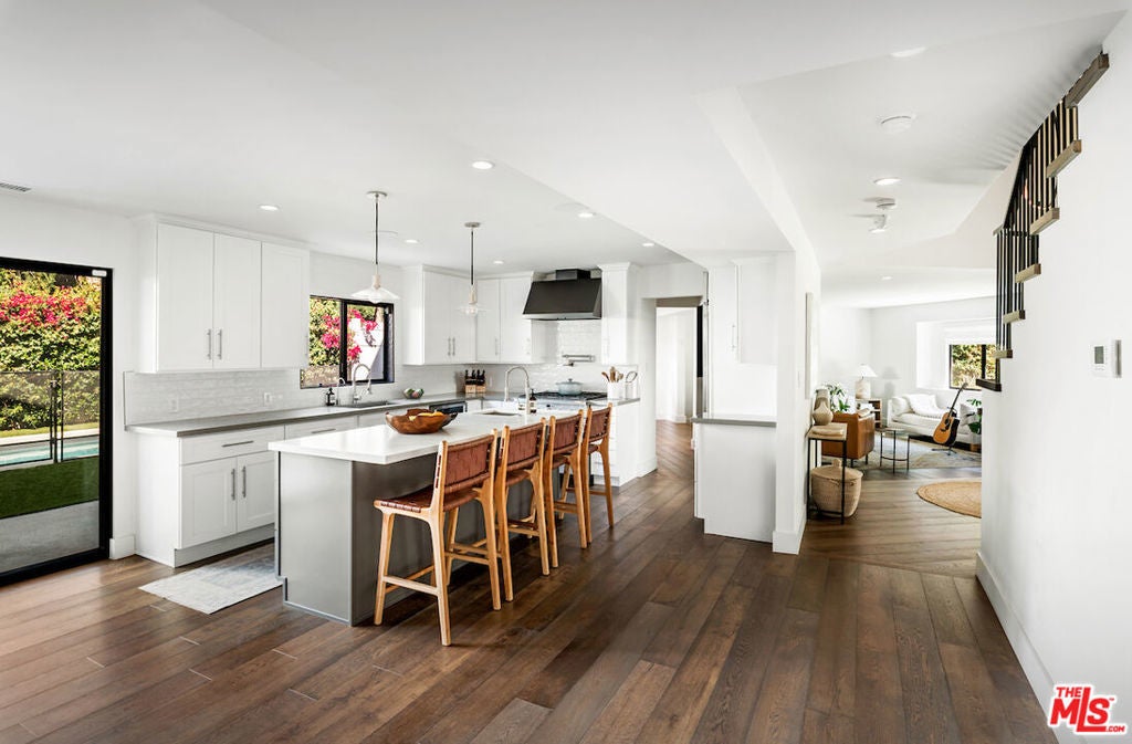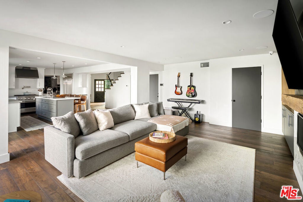Tucked behind tall hedges in Rancho Estates, this Encino home offers comfort, space, and privacy for everyday living. Recently redone with a modern vibe, the main level features an open floor plan with living, dining, and a family room centered around a lovely fireplace with built in storage. Each space showcases wood flooring. The kitchen includes quartz countertops, a large center island with a prep sink, and a full butler's pantry with a wine/beverage fridge and walk-in storage. Upstairs, the primary suite offers dual closets and a large bathroom with a soaking tub, multi-jet shower, and double sinks. Outside, you'll find a turf yard, BBQ area, fire pit, and pool/spa. Designed for comfort, style, and easy living, this home is set in one of Encino's most sought-after neighborhoods.