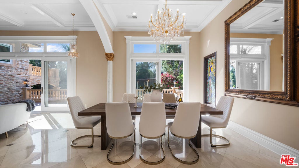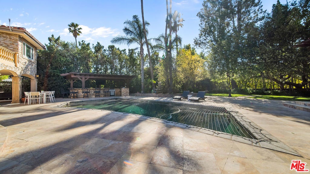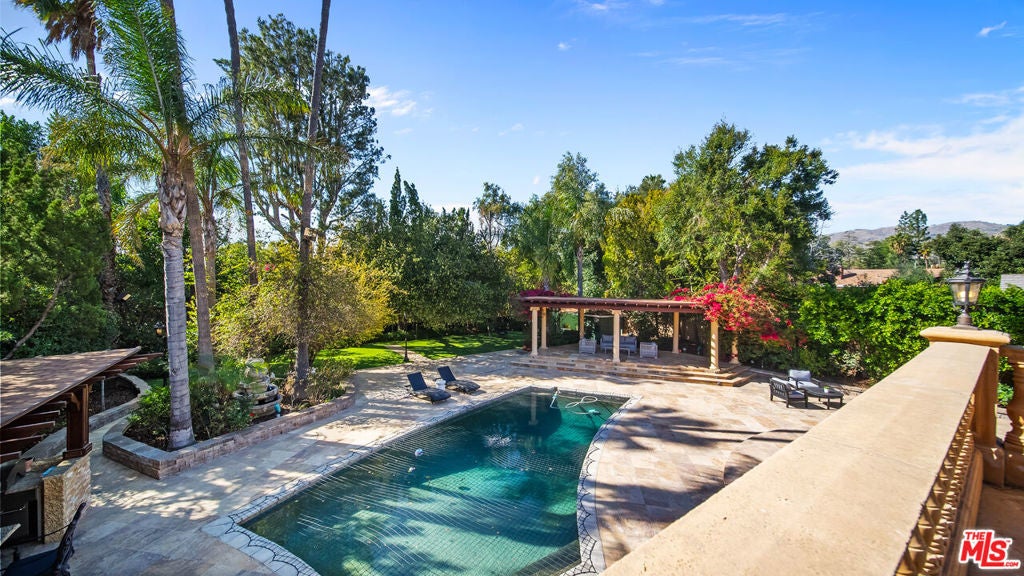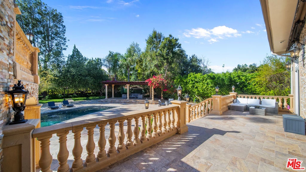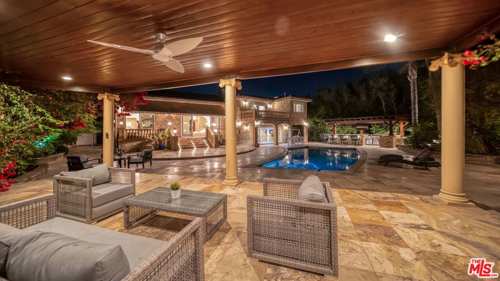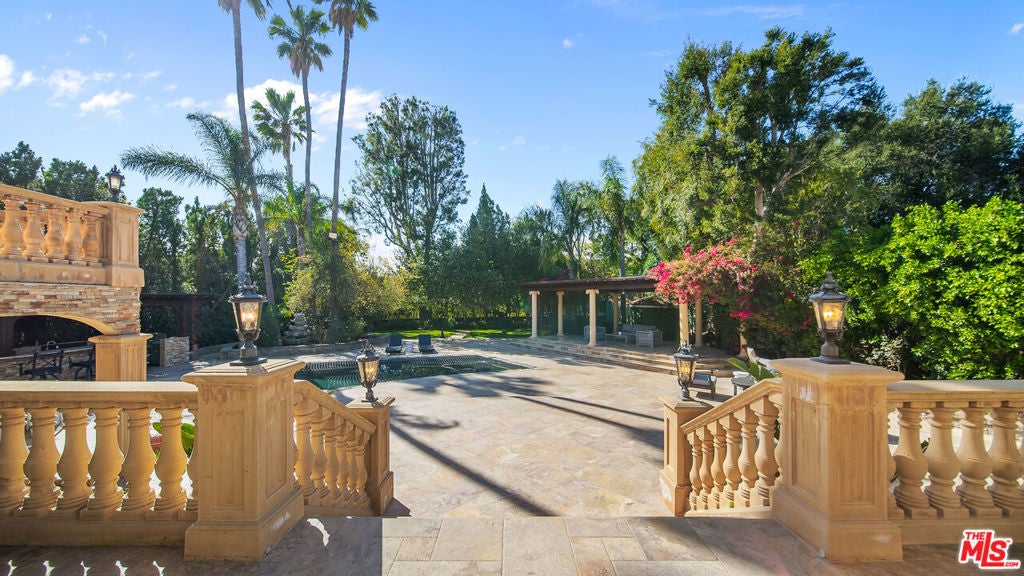 Exquisite Mediterranean Estate in Chatsworth! Welcome to this elegant, reimagined beauty in the heart of Chatsworth! Nestled on an expansive 18,000+ SQFT lot, this luxurious 5-bedroom, 4-bathroom residence offers nearly 4,300 SQFT of living space, showcasing high-end finishes and impeccable craftsmanship.From the moment you enter, you'll be captivated by soaring ceilings, stunning custom arches, and gleaming marble floors bathed in natural light. The state-of-the-art chef's kitchen is a true masterpiece, featuring a 6-burner gas Wolf range, built-in custom Sub-Zero refrigerator, oversized eat-in island, skylight, dramatic marble backsplash, and stainless steel farmhouse sink. Designed for grand entertaining, the formal living and dining areas boast coffered ceilings, Roman/Greek columns, dazzling chandeliers, and an elegant White Carrara marble fireplace. A second living room on the lower level offers a full wet bar, Italian-inspired fireplace, and custom sliding doors leading to the breathtaking backyard.Step outside to your private oasis, where travertine floors, an expansive patio, and a full outdoor kitchen create the ultimate indoor-outdoor living experience. Take a dip in the sparkling pool, surrounded by lush greenery and resort-style landscaping. The luxurious primary suite features a private balcony, generous walk-in closet, sunken jetted tub, glass-enclosed shower, and dual vanities with a makeup counter. With two additional bedrooms upstairs and two on the lower level, this home offers ample privacy and space for family and guests. Owned Solar! A custom 3-car garage with a workbench and storage completes this extraordinary home. This estate truly has it all elegance, space, and resort-style living! Don't miss this rare opportunity! Schedule your private showing today! CLICK ON THE VIRTUAL TOUR LINK FOR A FULL VIDEO.