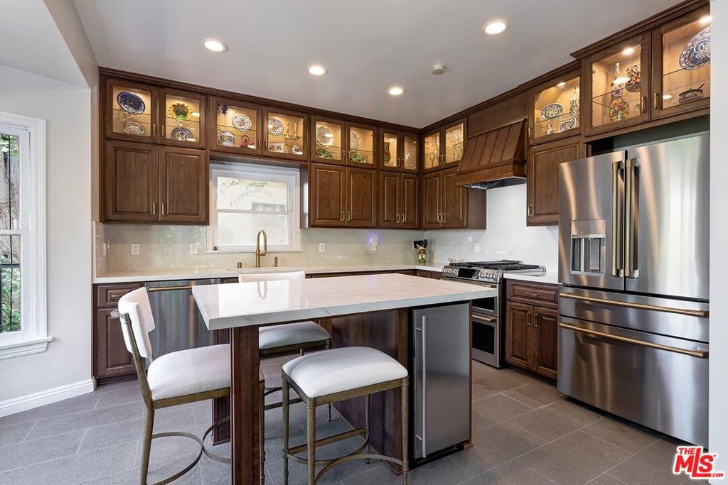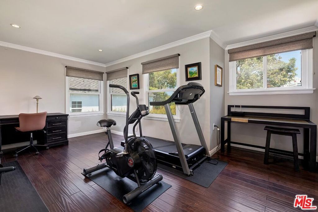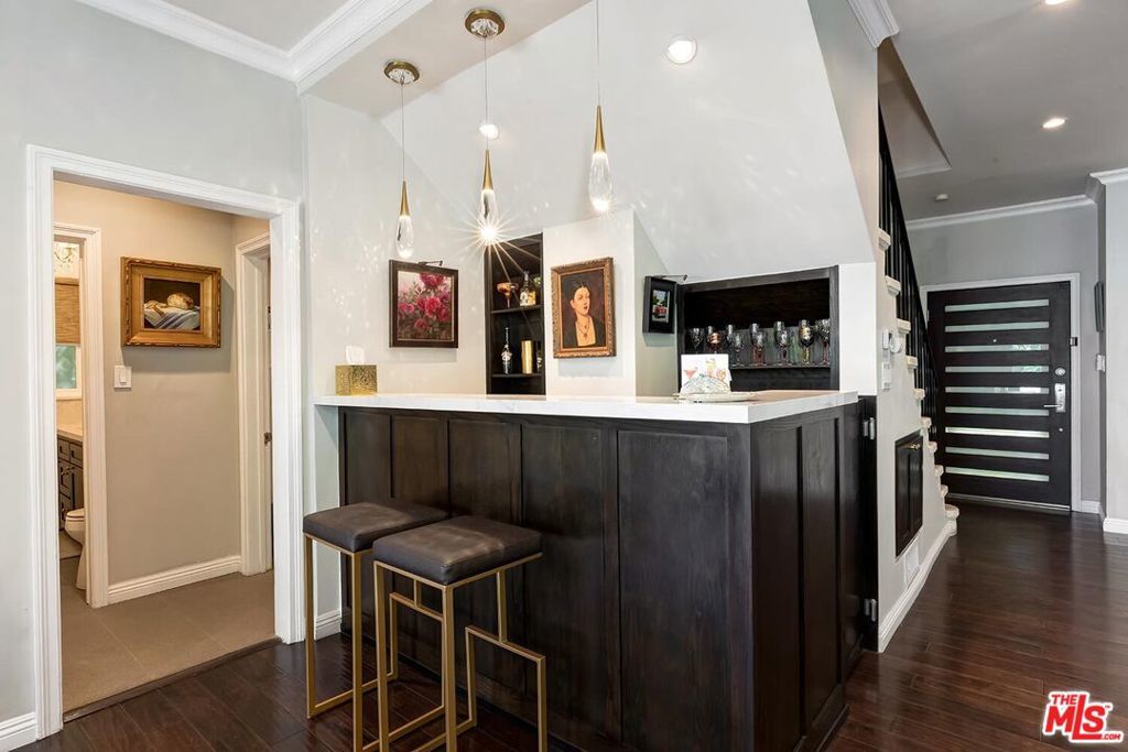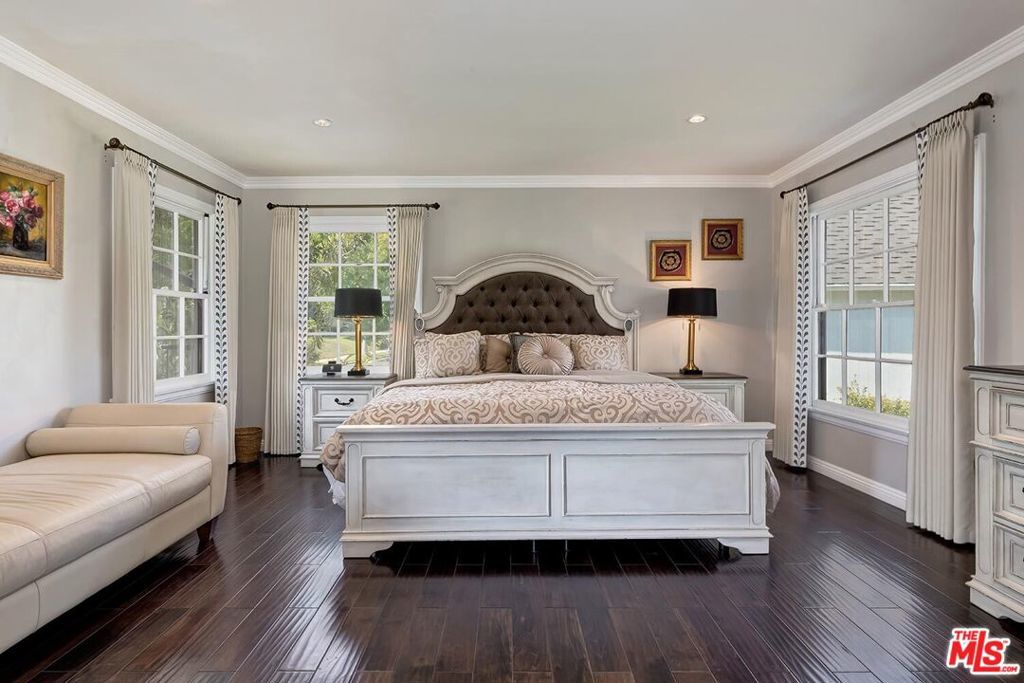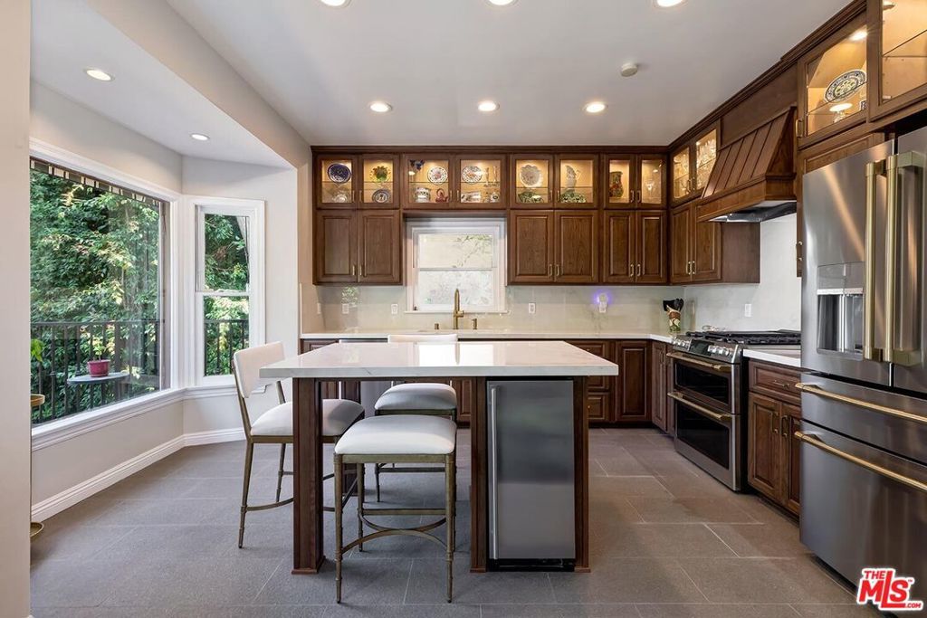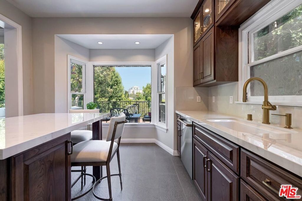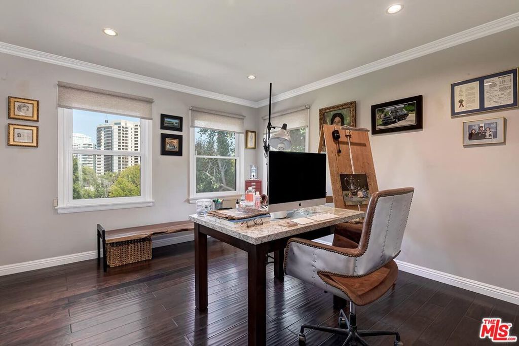 Situated in Premier location in the esteemed Little Holmby neighborhood, this updated Monterey Traditional features a coveted modern open floorplan combined with all its original warmth and character with dark wood flooring and crown moldings throughout. Entering the home through a gated front garden reveals streams of light cascading in from every angle through a myriad of new large windows. The floorplan boasts a breathtaking great room flowing seamlessly from a gracious formal living room with a baronial marble fireplace to a comforting family room with second fireplace to a large open dining area with wet bar creating the perfect setting for large scale entertaining or causal relaxation with the family. Adjoining the dining area is a gourmet eat-in kitchen with large center island, stone countertops, high-end stainless appliances and copious amounts of storage ready for the seasoned chef or aspiring cook. The rear of the main level opens through multiple French doors to an expansive redone deck area with motorized awnings offering multiple seating areas and sweeping treetop, mountain and city light views. In addition, there is a convenient powder room and large laundry room. All four bedrooms are upstairs including gracious master suite with dual closets, sumptuous full marble accented bath, and front balcony, plus a large second bedroom with en suite bath and two additional bedrooms with a shared hallway full bath giving an unlimited number of options for families or professional work at home executives. The house also includes a bonus lower level, 546 sqft not included in total, accessible by steps down from the main deck featuring a sizable multi-purpose room with bath, perfect for media room, gym or game room plus a private patio and enchanting extra-large spa calling for a long dip to unwind after a long day or workout, all overlooking a romantic landscaped garden with fountain beyond. Additional improvements over the last 10 years include newer HVAC and roof, updated electrical and plumbing, and EV charger in the two-car garage. Coupled with its modern and classic features, the home is mere moments from the relaxing atmosphere of Holmby Park, the world-class shopping at Westfield Century City, the glamour of Beverly Hills, and the cultural offerings of UCLA and Westwood. It also allows access to the prestigious, award-winning Warner Avenue Elementary School. This is an amazing opportunity to enjoy all the best of what Little Holmby offers.