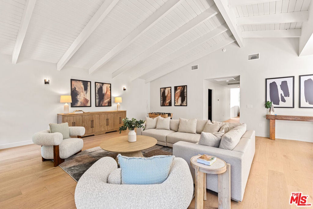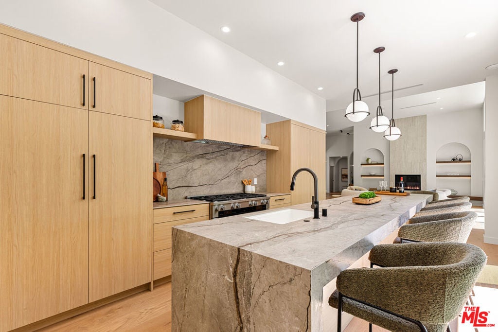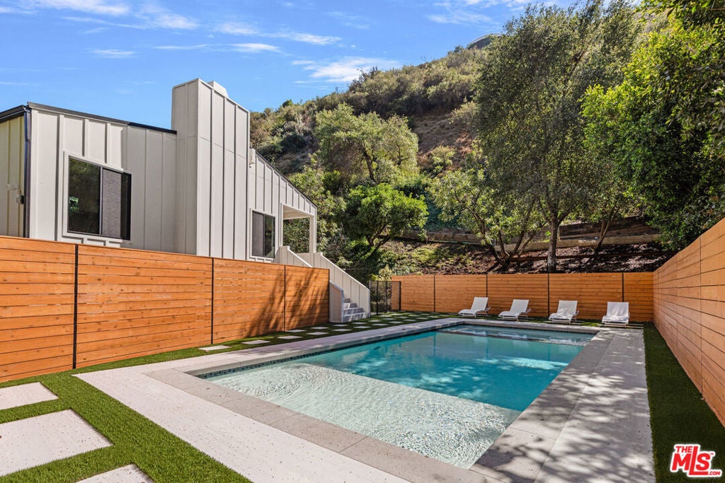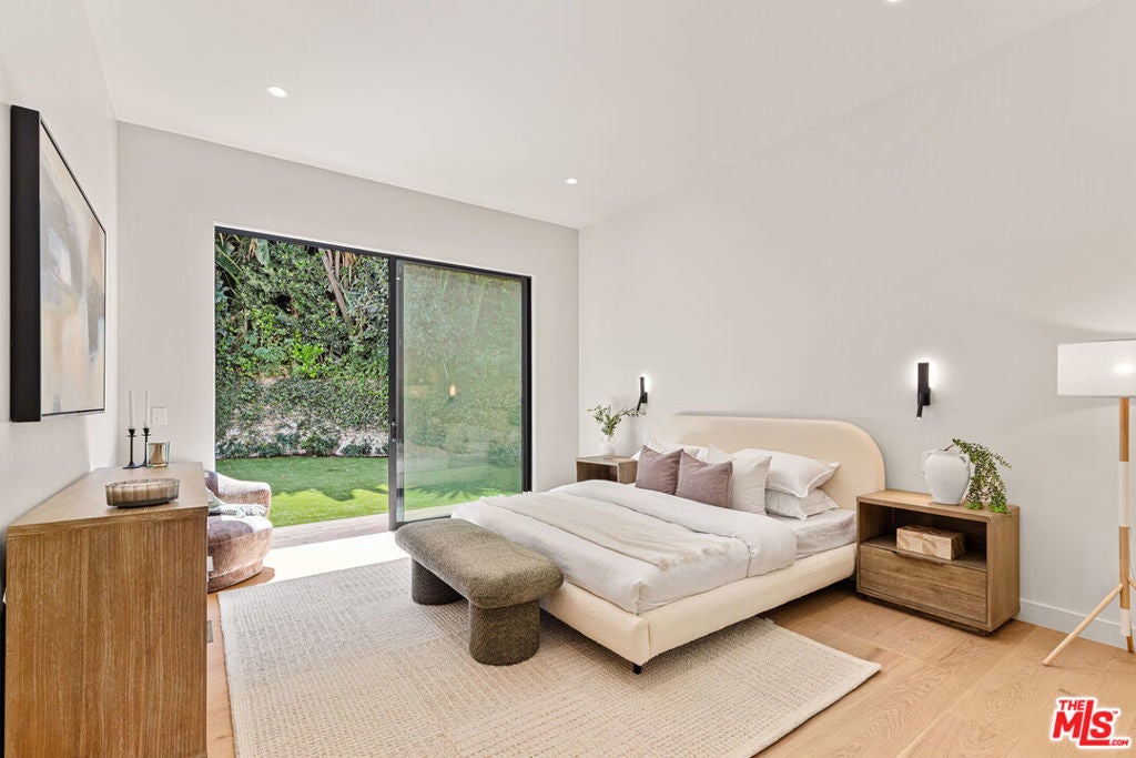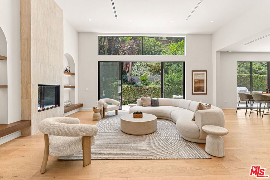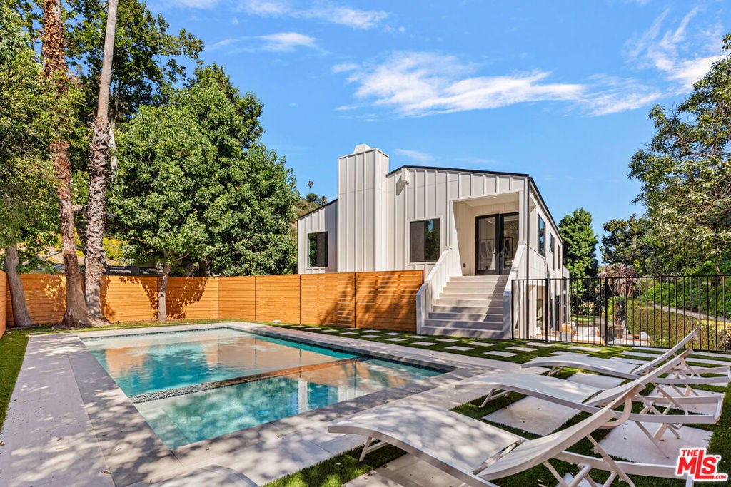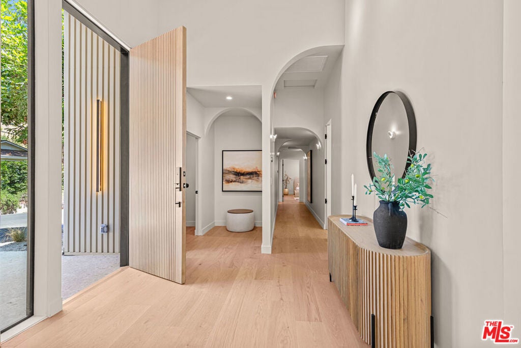 Located on a quiet street in one of Brentwood's most desirable pockets, this beautifully reimagined 4-bedroom, 6-bath modern residence offers the perfect blend of high-end design and everyday comfort. A dramatic 10-foot entry door sets the tone for the spacious interior, featuring soaring 14-foot ceilings, wide-plank hardwood floors, and seamless indoor-outdoor living. The open-concept layout includes a chef's kitchen with premium appliances, a generous dining area, and expansive living spaces framed by black aluminum sliding doors that open to a private backyard oasis with a newly built pool, spa, and alfresco dining area perfect for entertaining. The luxurious primary suite features a spa-style bath with dual vanities, a freestanding soaking tub, and a custom walk-in closet. Two elegant powder rooms, a newly added theater, and a large entertainment lounge with a fireplace enhance the home's livability and style. Additional upgrades include a fire-resistant standing seam metal roof, all-new electrical and plumbing systems, and a spacious 3-car garage with ample storage.