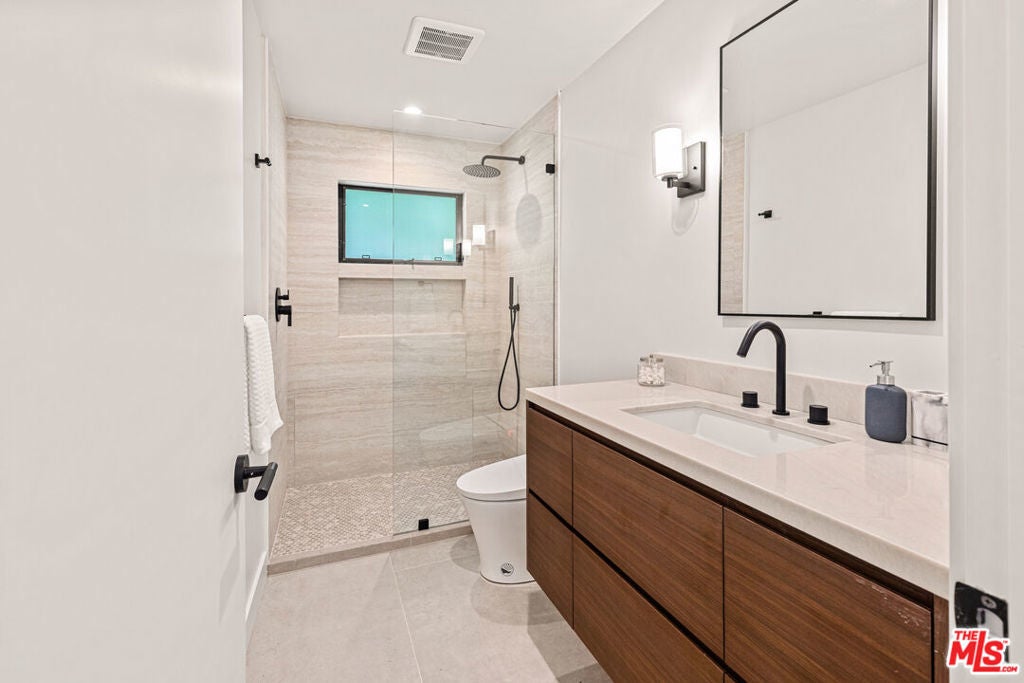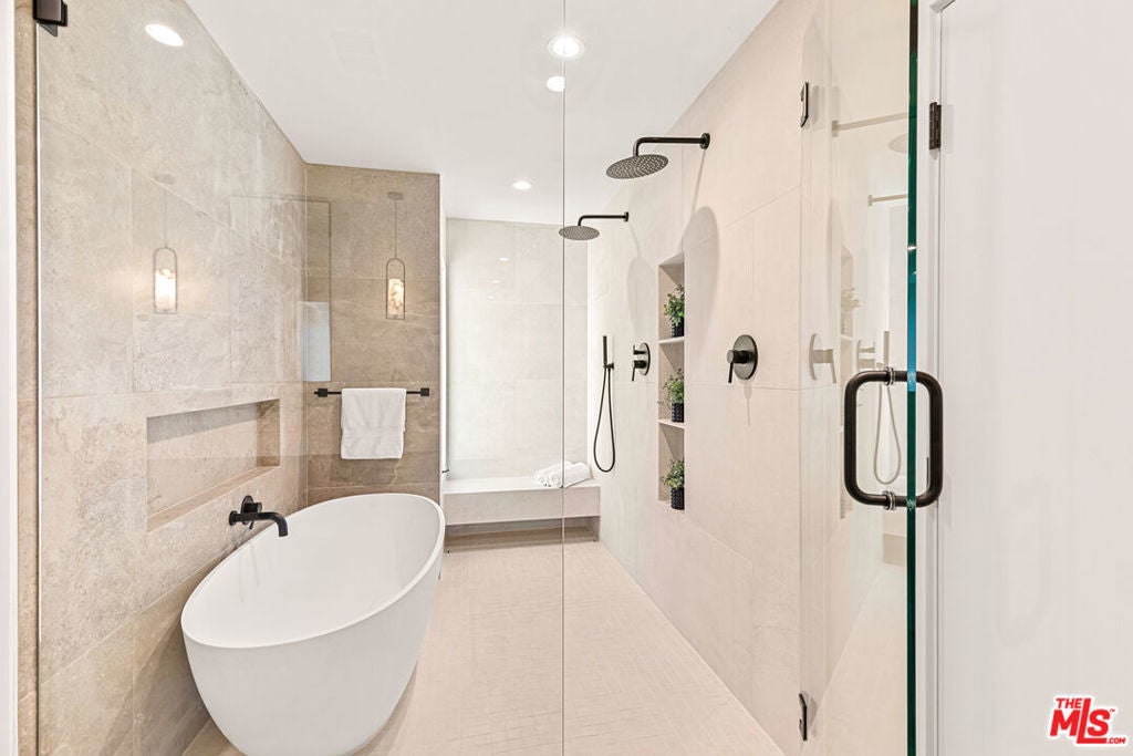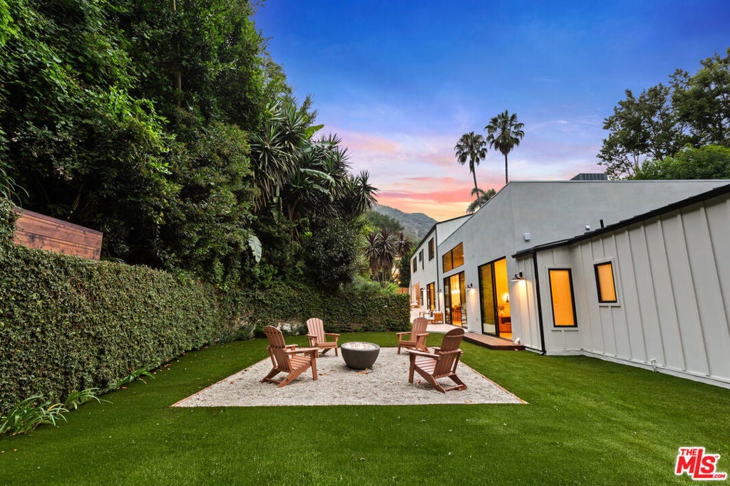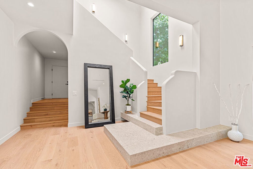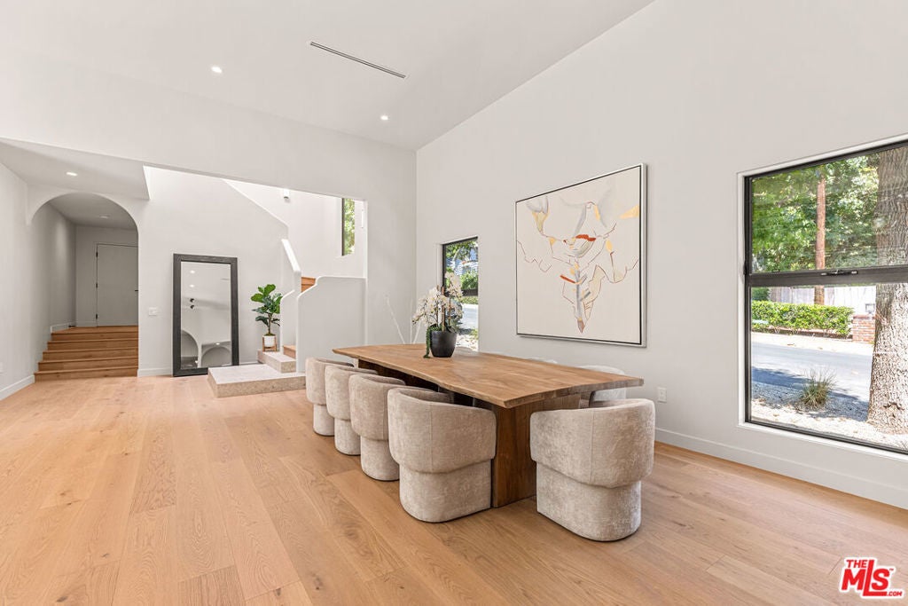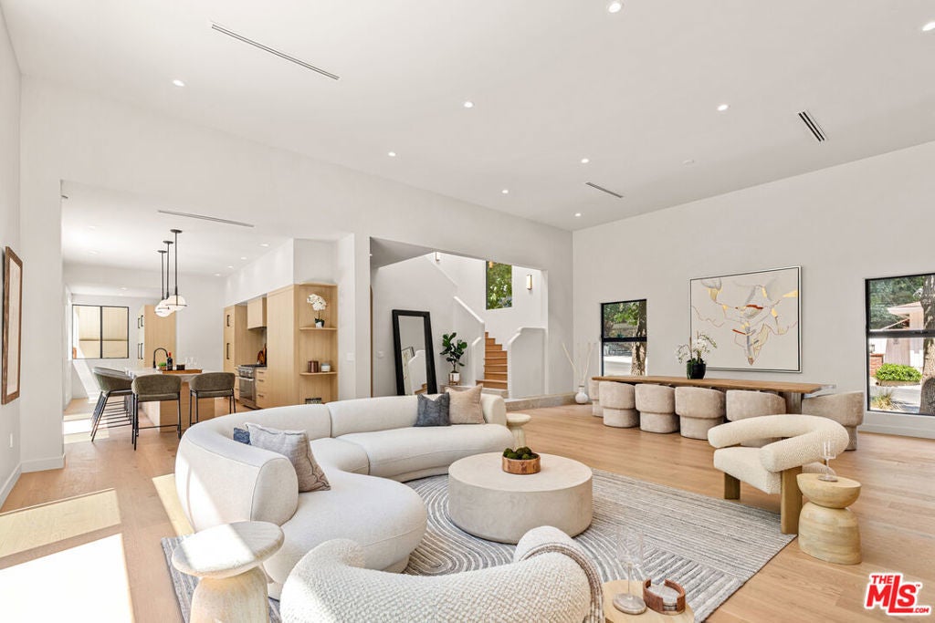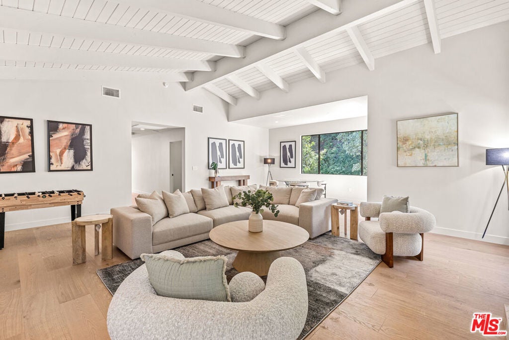 Located on a quiet street in one of Brentwood's most desirable pockets, this beautifully reimagined 4-bedroom, 6-bath modern residence offers the perfect blend of high-end design and everyday comfort. A dramatic 10-foot entry door sets the tone for the spacious interior, featuring soaring 14-foot ceilings, wide-plank hardwood floors, and seamless indoor-outdoor living. The open-concept layout includes a chef's kitchen with premium appliances, a generous dining area, and expansive living spaces framed by black aluminum sliding doors that open to a private backyard oasis with a newly built pool, spa, and alfresco dining area perfect for entertaining. The luxurious primary suite features a spa-style bath with dual vanities, a freestanding soaking tub, and a custom walk-in closet. Two elegant powder rooms, a newly added theater, and a large entertainment lounge with a fireplace enhance the home's livability and style. Additional upgrades include a fire-resistant standing seam metal roof, all-new electrical and plumbing systems, and a spacious 3-car garage with ample storage.