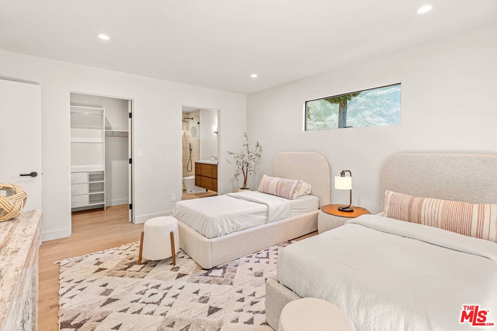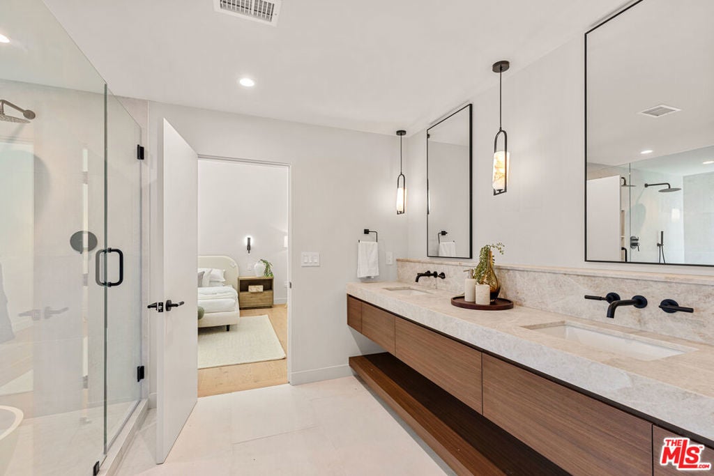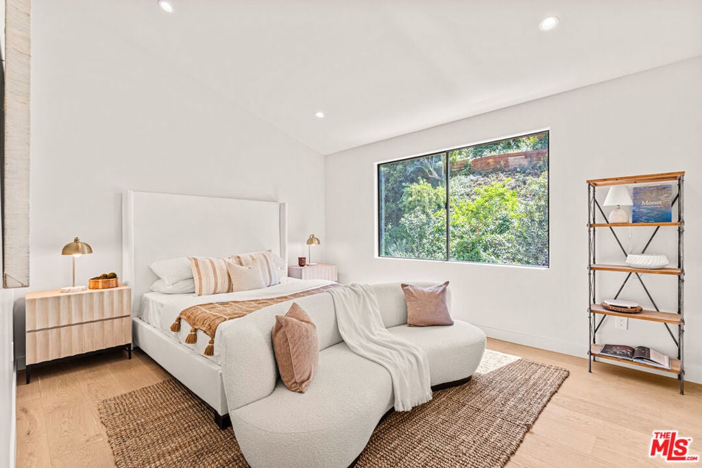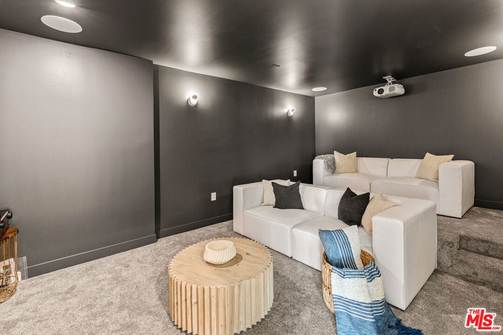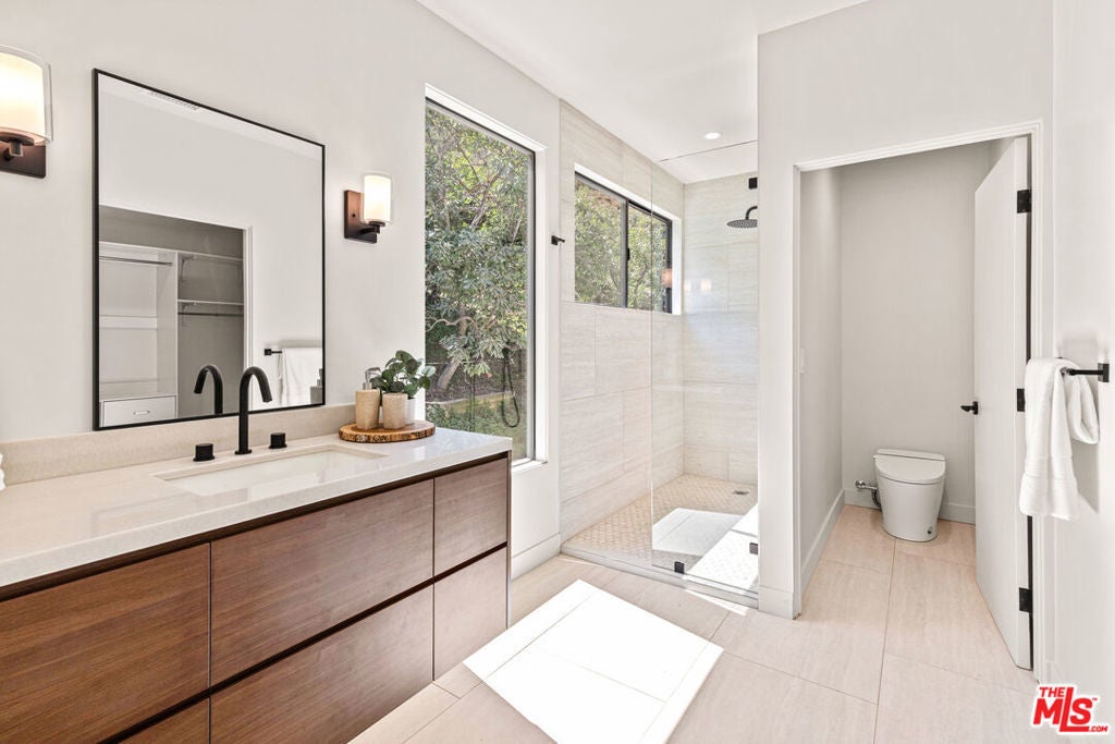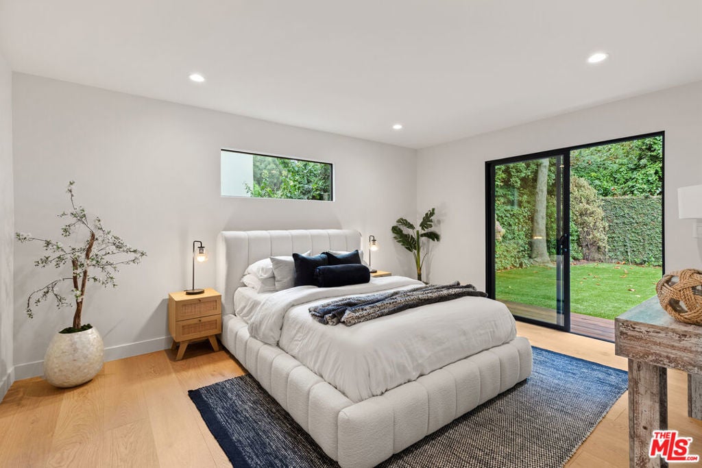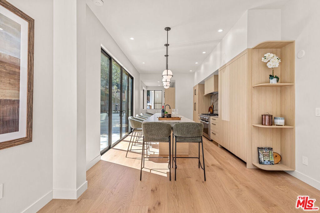 Located on a quiet street in one of Brentwood's most desirable pockets, this beautifully reimagined 4-bedroom, 6-bath modern residence offers the perfect blend of high-end design and everyday comfort. A dramatic 10-foot entry door sets the tone for the spacious interior, featuring soaring 14-foot ceilings, wide-plank hardwood floors, and seamless indoor-outdoor living. The open-concept layout includes a chef's kitchen with premium appliances, a generous dining area, and expansive living spaces framed by black aluminum sliding doors that open to a private backyard oasis with a newly built pool, spa, and alfresco dining area perfect for entertaining. The luxurious primary suite features a spa-style bath with dual vanities, a freestanding soaking tub, and a custom walk-in closet. Two elegant powder rooms, a newly added theater, and a large entertainment lounge with a fireplace enhance the home's livability and style. Additional upgrades include a fire-resistant standing seam metal roof, all-new electrical and plumbing systems, and a spacious 3-car garage with ample storage.