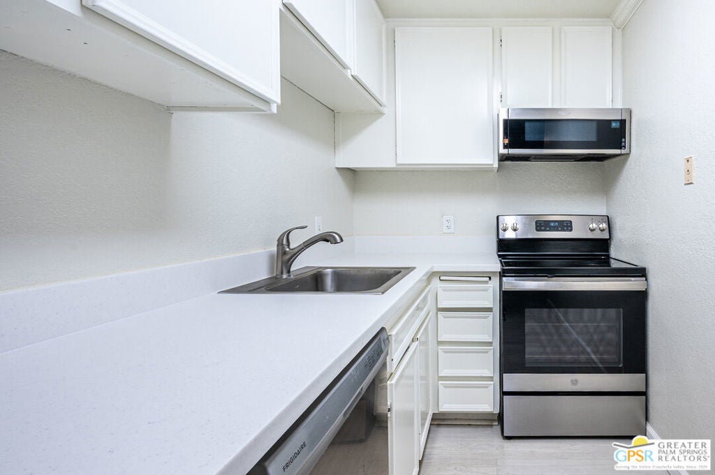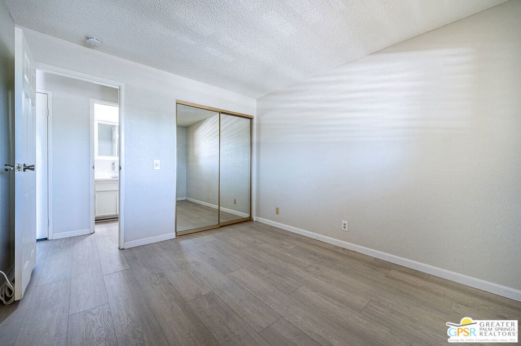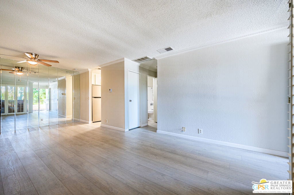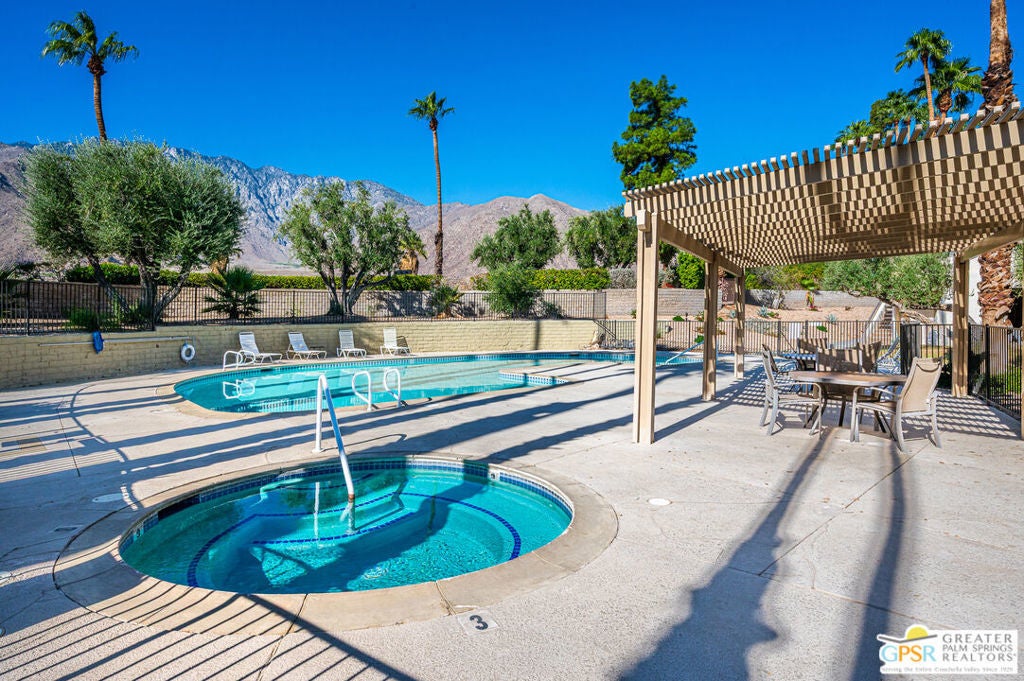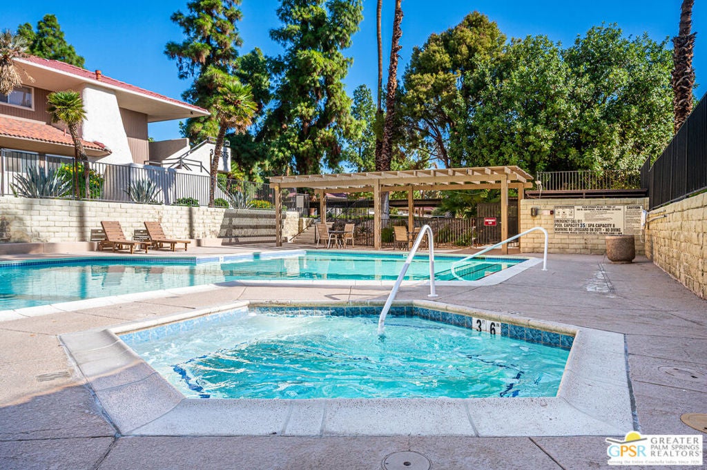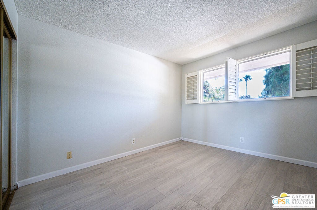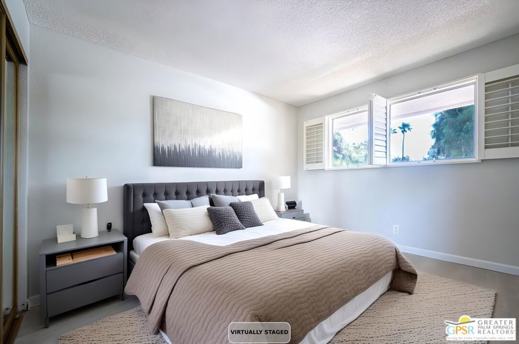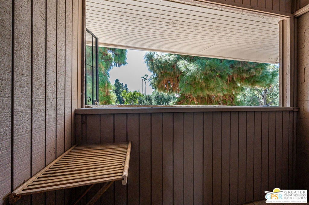 Aggressively priced to sell!! This 1 bedroom 1 bath condo features updated granite counter tops, updated stainless steel appliances, updated wood laminate flooring throughout, and a 2 ton package unit A/C system installed in 2024. This second floor unit provides a private balcony off the living room which opens to the dining for maximum light and views. Interior window shutters provide excellent privacy and room darkening as needed on all windows. The unit is in the center of the building but the neighboring unit is offset allowing for the living/dining wall to be unattached. One of many community pool/spas is just steps from this unit. Also, enjoy the private community tennis courts as well as covered and uncovered parking right outside the unit. Located minutes from downtown Palm Springs this unit is perfect for enjoying the shopping, dining, festivals and events the Coachella Valley has to offer.