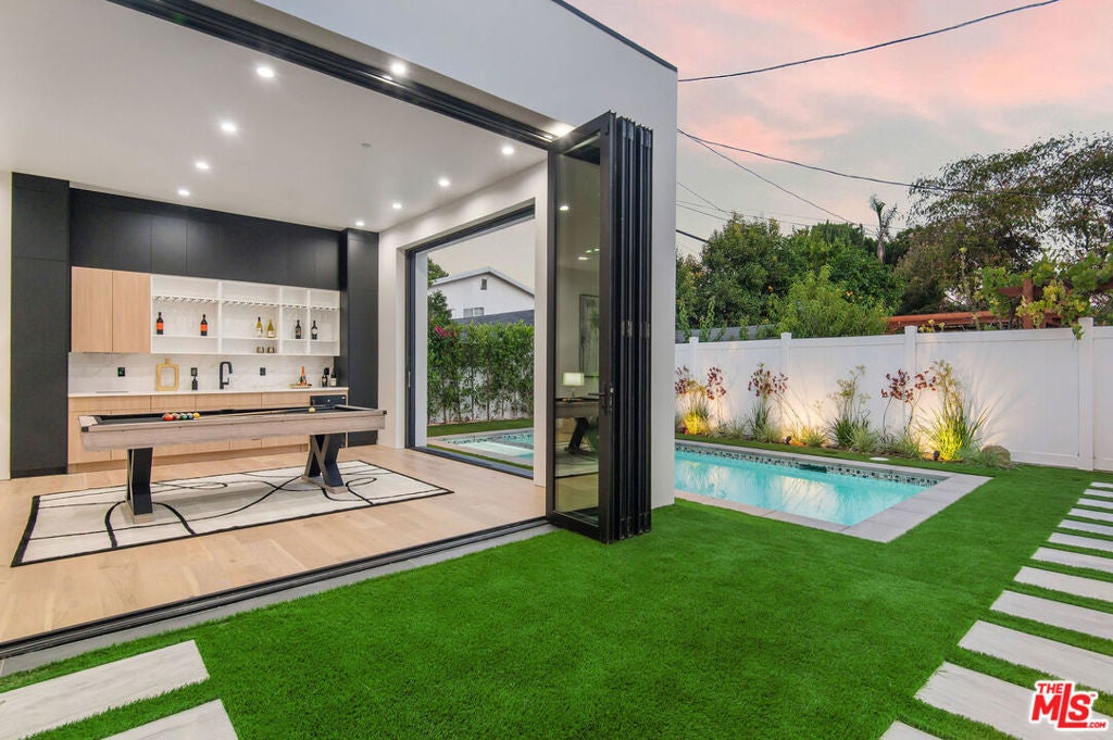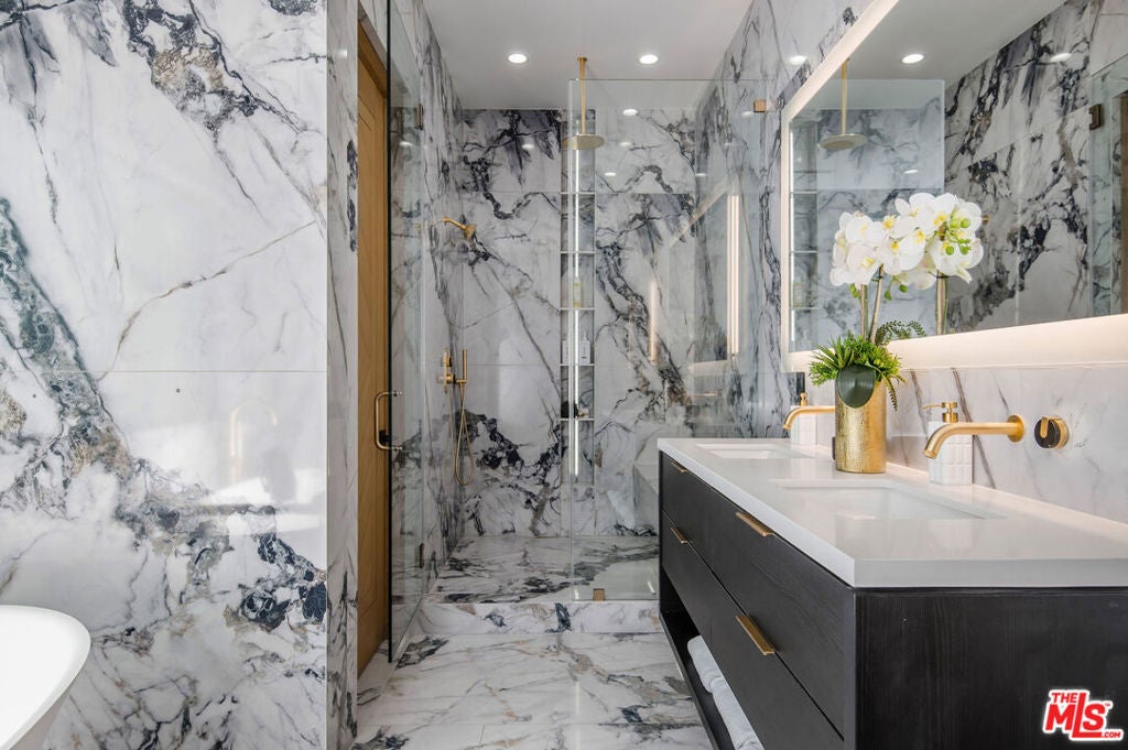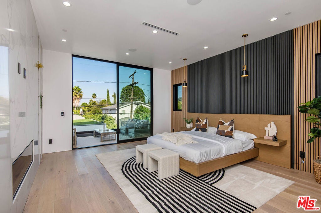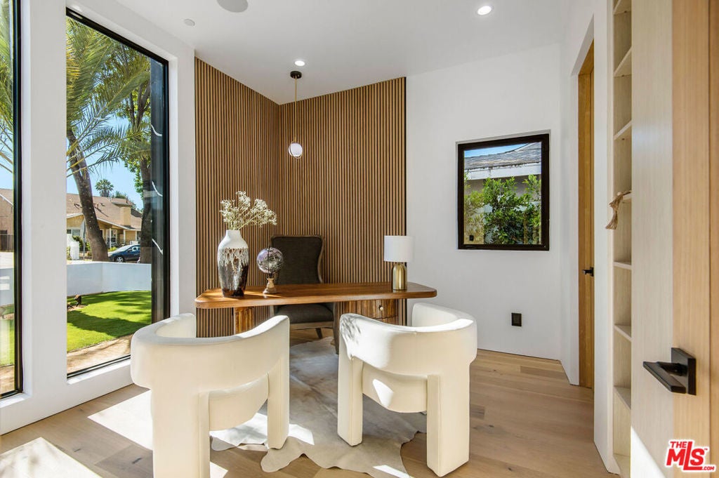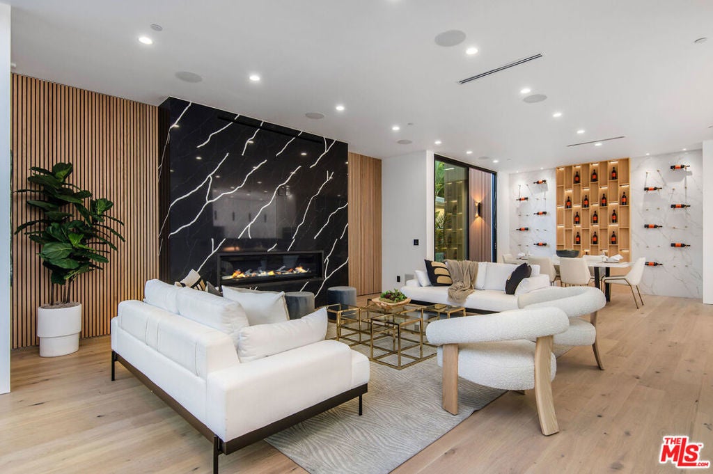 Wonderfully expansive contemporary home uniquely sited south of Ventura Boulevard, close to El Caballero Country Club in an enviable part of Encino. Two stories, with an architectural entry, 5132 Lindley Avenue boasts vast entertainment spaces, many with wood paneled walls and grand moonstone quartz that emulates the impressive exterior entrance. The living room is anchored with a custom-built floor-to-ceiling black and white fireplace, elegant paneling, and banks of modern bespoke doors offering backyard vistas to the pool and family room, a dining area, wine wall, and a beautifully appointed modern chef's kitchen with Miele appliances, 60" dual oven range and a generous marble pull-up waterfall island. This bright 5-bedroom, 6-bathroom home, completed in 2024, features a cohesive neutral color palette with unmatched quality throughout, including meticulous stonework, beaded wood panels, bespoke cabinetry, and large windows, complemented by wide-plank light oak flooring. All bathrooms feature intricate marble work and brass fixtures; the primary suite boasts a glass-fronted gas fireplace, marble shelving, a walk-in closet, and a stand-alone bathtub. A second ground-floor vocational space features a private additional living area. Oversized pocket doors lead to the outdoor heated pool and spa, and are surrounded by manicured gardens. Other amenities include wired speakers, a comprehensive security system, and WiFi extenders throughout the home, Apple iPad tablets to control home systems, and two AC units for optimal climate control.