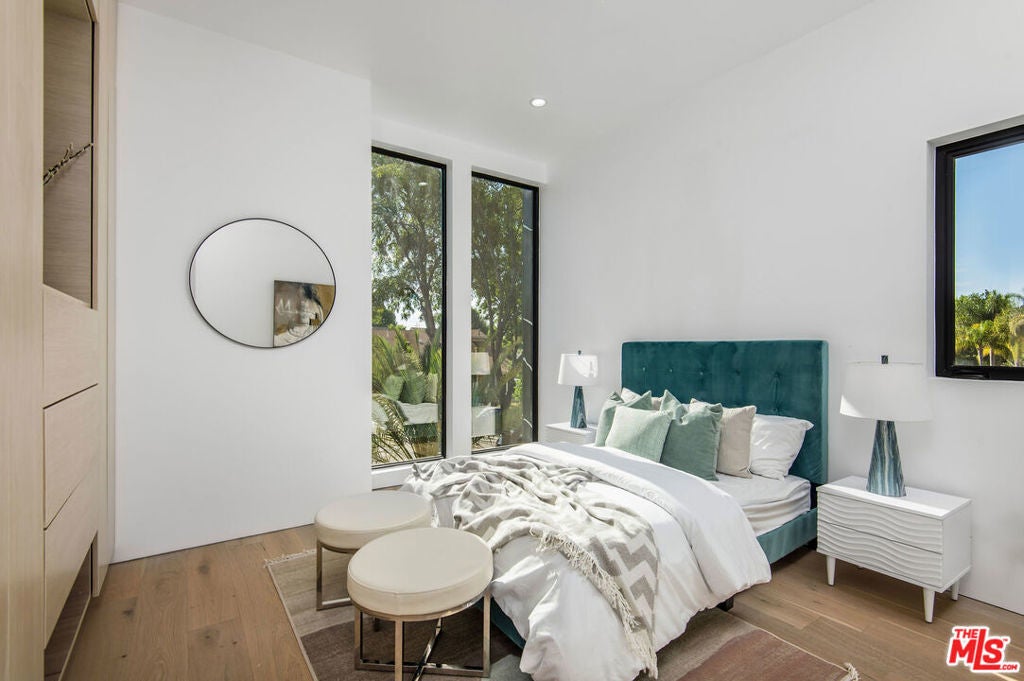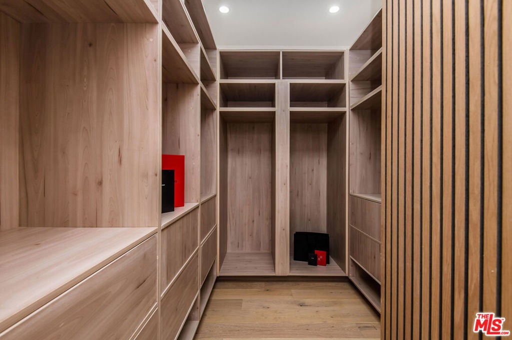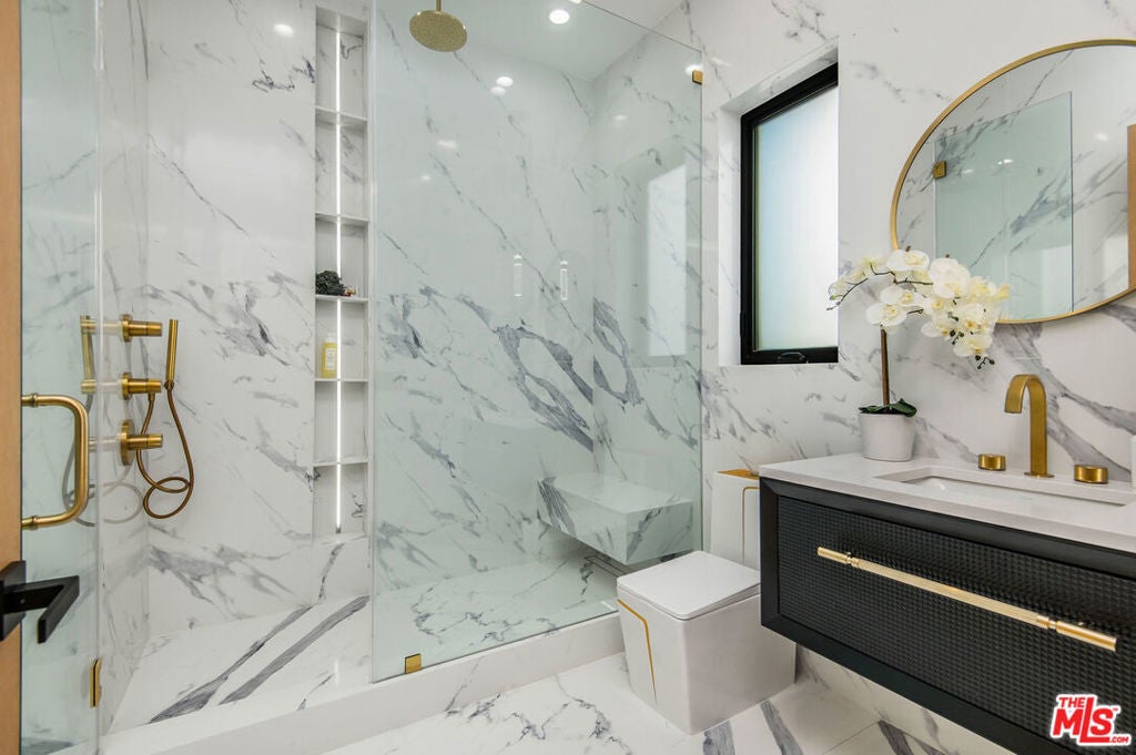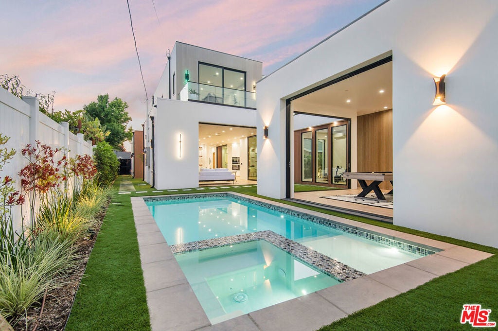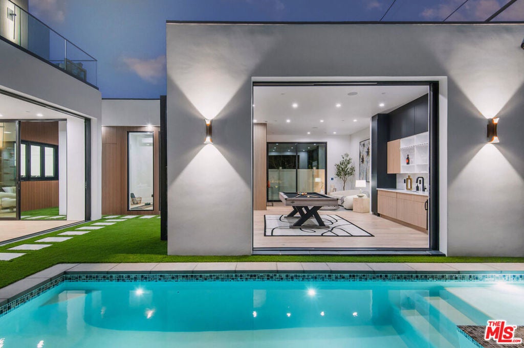 Wonderfully expansive contemporary home uniquely sited south of Ventura Boulevard, close to El Caballero Country Club in an enviable part of Encino. Two stories, with an architectural entry, 5132 Lindley Avenue boasts vast entertainment spaces, many with wood paneled walls and grand moonstone quartz that emulates the impressive exterior entrance. The living room is anchored with a custom-built floor-to-ceiling black and white fireplace, elegant paneling, and banks of modern bespoke doors offering backyard vistas to the pool and family room, a dining area, wine wall, and a beautifully appointed modern chef's kitchen with Miele appliances, 60" dual oven range and a generous marble pull-up waterfall island. This bright 5-bedroom, 6-bathroom home, completed in 2024, features a cohesive neutral color palette with unmatched quality throughout, including meticulous stonework, beaded wood panels, bespoke cabinetry, and large windows, complemented by wide-plank light oak flooring. All bathrooms feature intricate marble work and brass fixtures; the primary suite boasts a glass-fronted gas fireplace, marble shelving, a walk-in closet, and a stand-alone bathtub. A second ground-floor vocational space features a private additional living area. Oversized pocket doors lead to the outdoor heated pool and spa, and are surrounded by manicured gardens. Other amenities include wired speakers, a comprehensive security system, and WiFi extenders throughout the home, Apple iPad tablets to control home systems, and two AC units for optimal climate control.