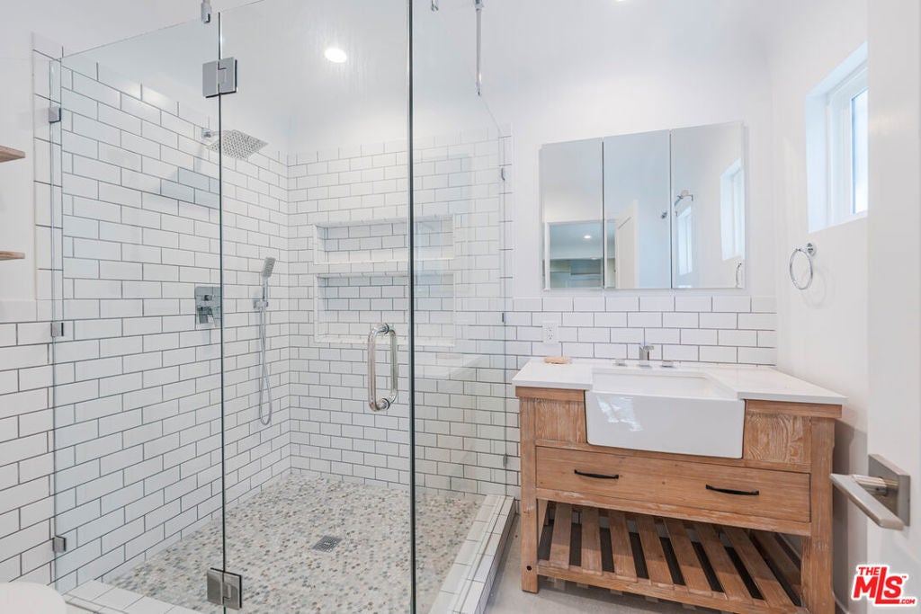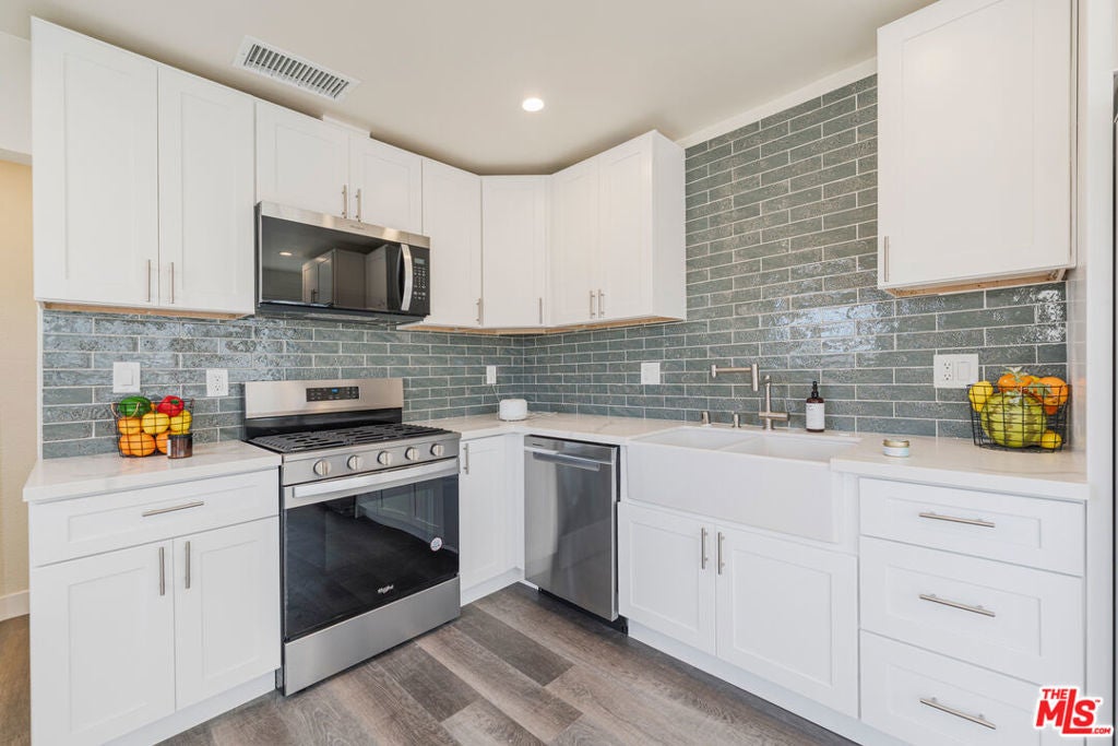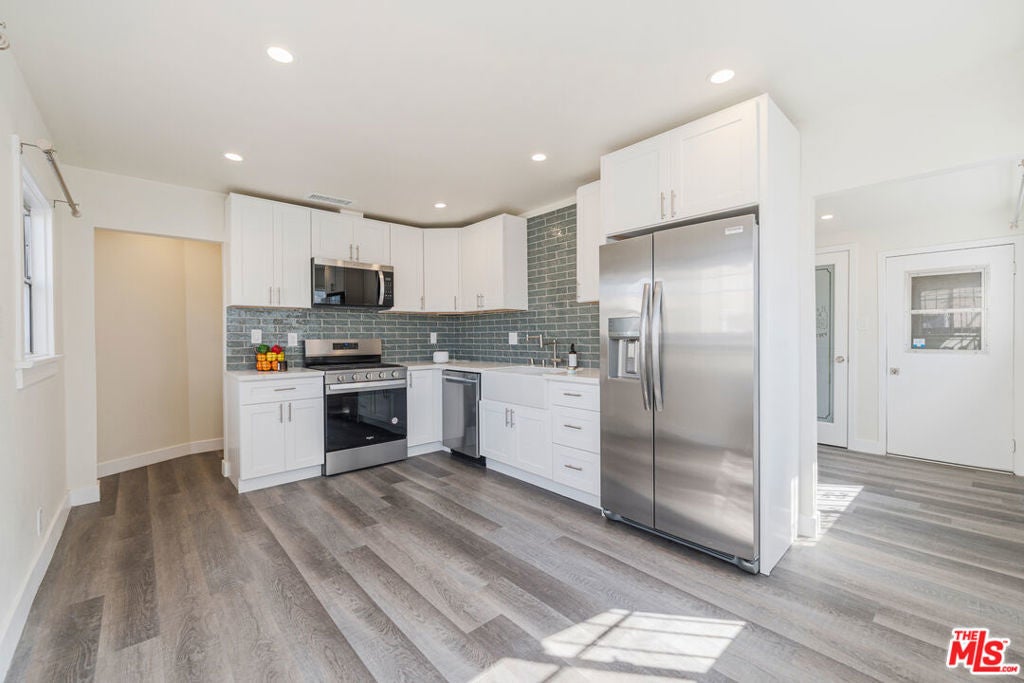 Welcome to 1628 W 80th St, a fully remodeled residence offering high-end finishes, privacy, and modern comfort just minutes from SoFi Stadium, The Forum, and the new Clippers Arena. Tucked on a quiet back lot with private driveway parking, this spacious 2-bedroom, 2-bath home was thoughtfully redesigned from top to bottom. Step inside to an open-concept living space that flows seamlessly into a stunning kitchen featuring white shaker cabinets, quartz countertops, deluxe subway tile backsplash, and Whirlpool stainless-steel appliances. The kitchen also includes custom touches like pull-out spice racks, roll-out drawers, LED upper and lower cabinet lighting, and a herringbone butcher block pantry with additional custom storage. A brand-new stackable washer and dryer complete the space for everyday convenience. Throughout the home, enjoy luxury vinyl wood plank flooring and modern 24x24 concrete tiles in both bathrooms. The primary suite features a spa-like bathroom with a 42-inch farmhouse vanity, a designer dual diverter valve that allows both rainfall and handheld shower functions, and a custom white oak shelf with quartz countertop. The hallway bath offers a 72-inch farmhouse vanity with built-in electrical outlets for styling tools, oversized recessed medicine cabinets, and classic subway tile walls with double shampoo niches.Additional features include central air and heat controlled by a Nest 4th-generation thermostat, energy-efficient lighting, and double-pane windows. The home has been designed with attention to detail, creating a bright, welcoming atmosphere throughout.The exterior includes new vinyl privacy screens, artificial turf for low maintenance, landscape lighting, and a drip irrigation system to keep the outdoor areas lush year-round. The property is gated and offers ample driveway parking. Located in a prime area of Los Angeles, this home provides easy access to major freeways, LAX, and nearby destinations for shopping, dining, and entertainment. The combination of thoughtful design, high-end finishes, and modern amenities makes this a truly unique leasing opportunity. Offered at $4,495/month, this move-in-ready home is easy to show and perfect for tenants seeking a balance of quality, comfort, and convenience in one of Los Angeles's most up-and-coming neighborhoods. Don't miss your chance to make this stunning property your next home!