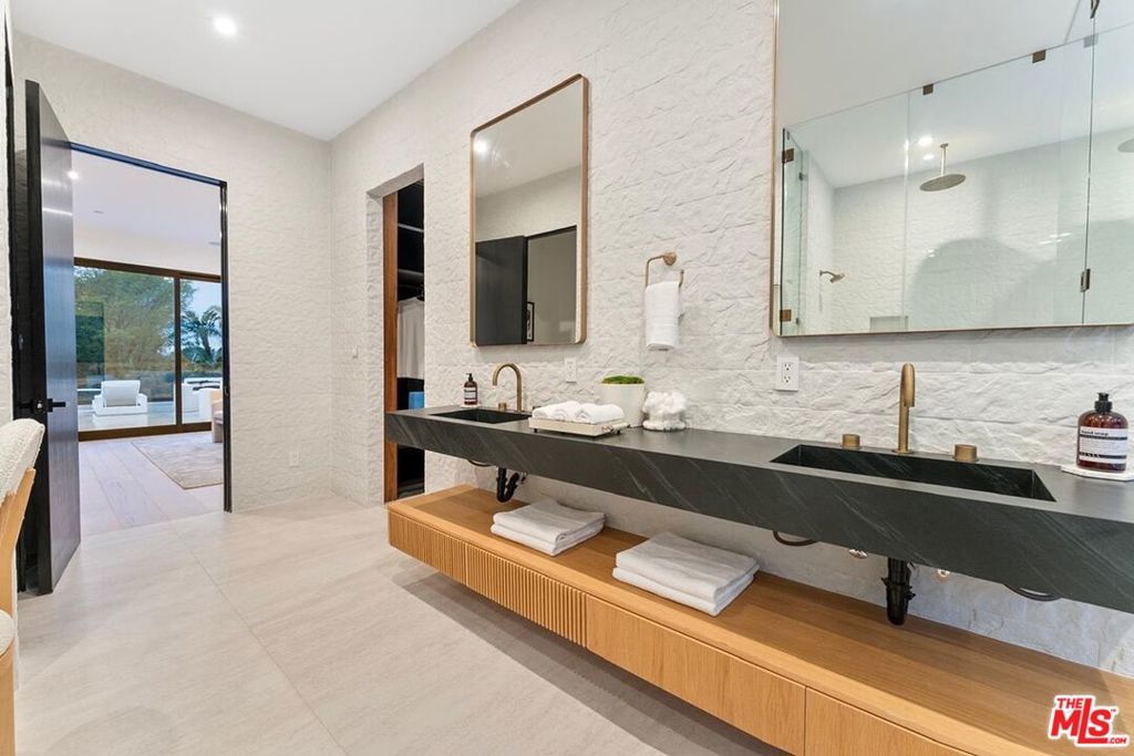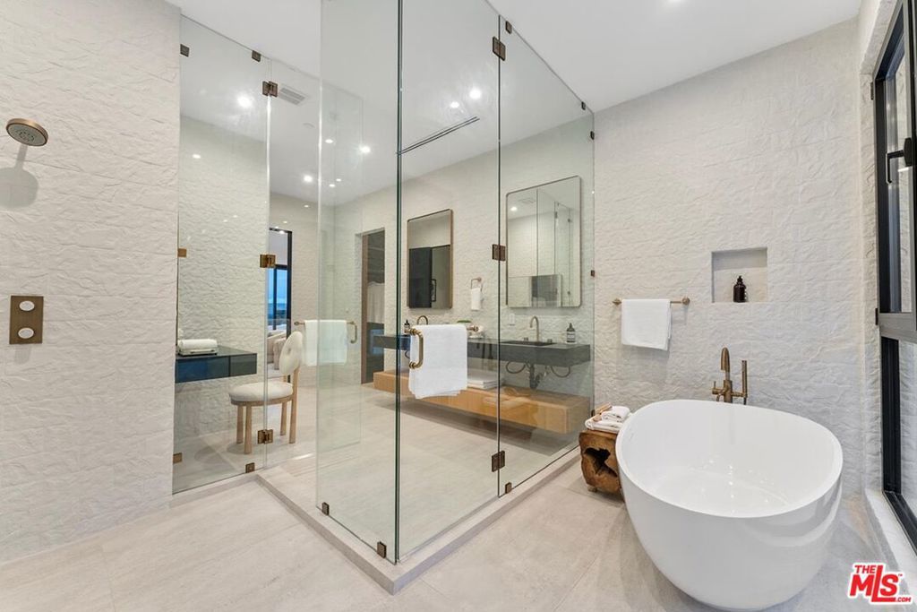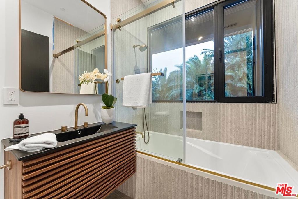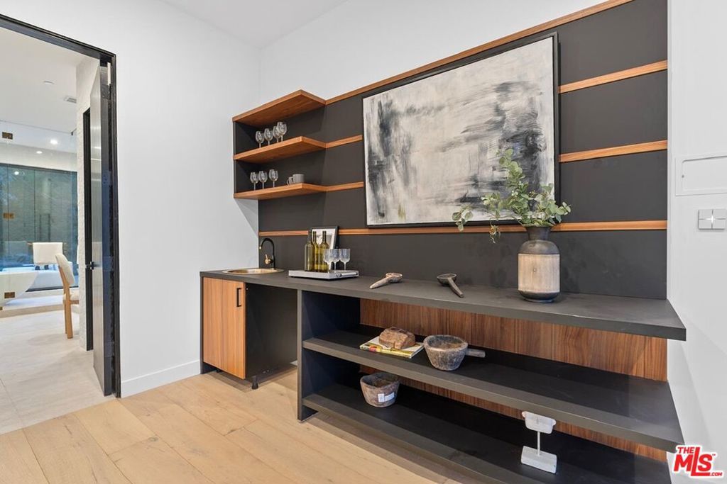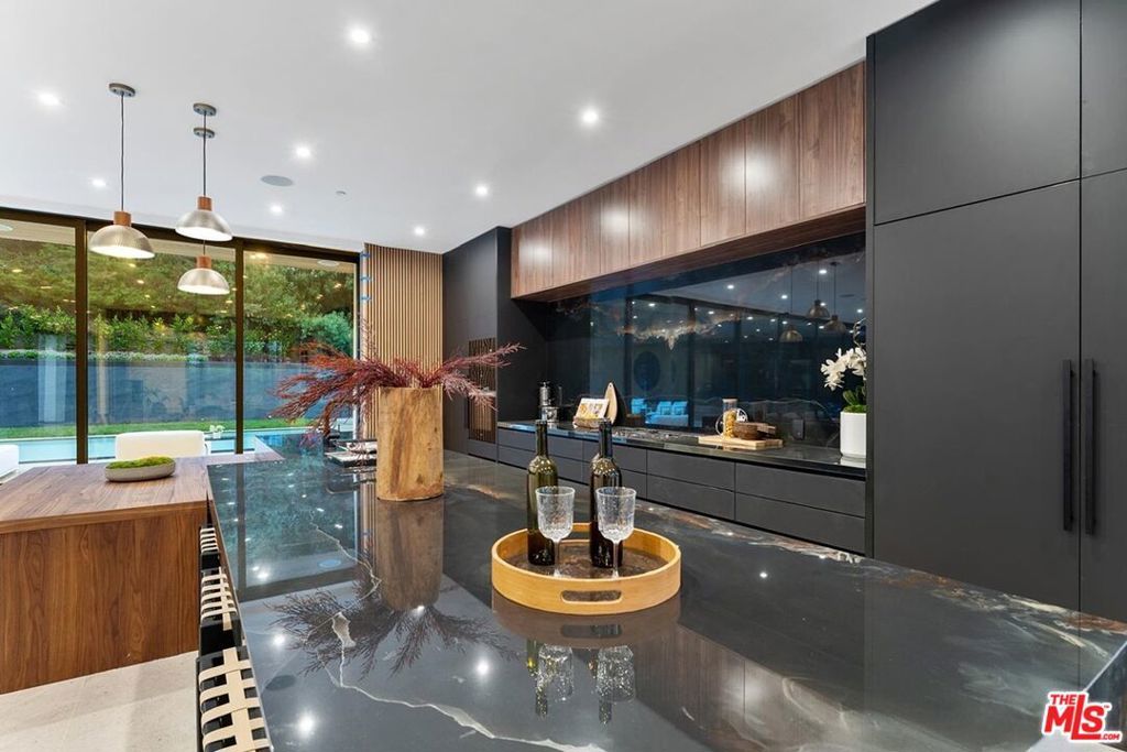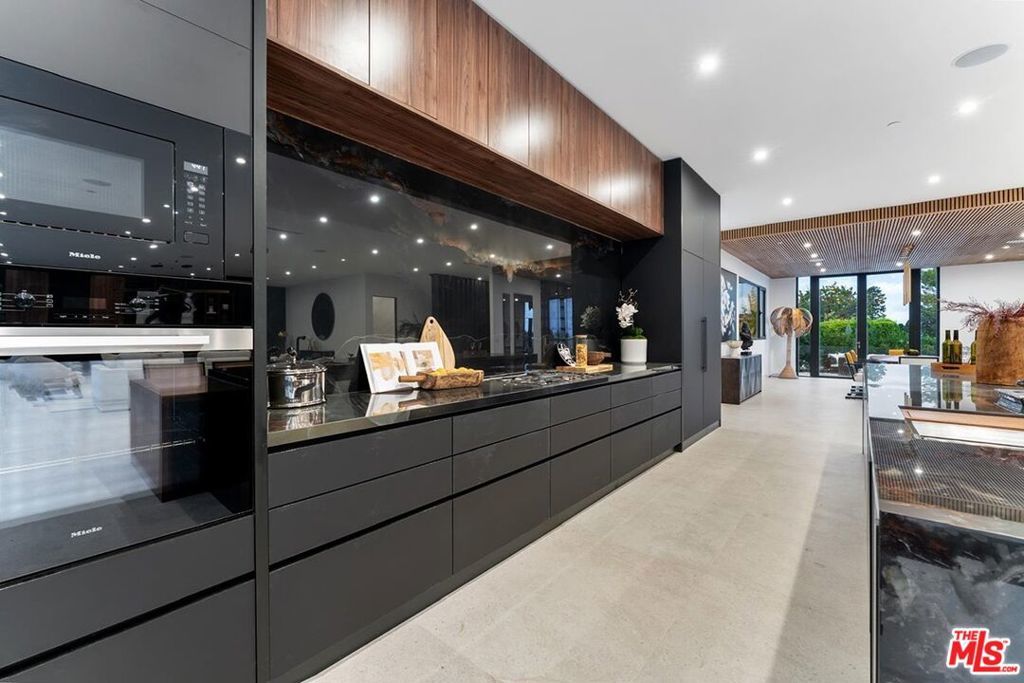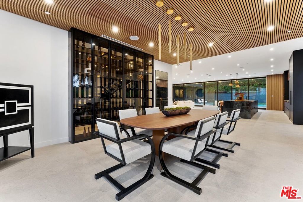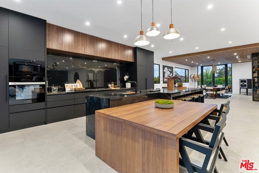 Fully furnished and turnkey! Exhibit your sense of style in this fashionably designed and impeccably appointed, modern 5 bedroom Beverly Hills entertainer's dream. Step past the gates and front door into the open plan living space with its large gourmet kitchen, formal dining area and great room. The kitchen features a large island with multiple seating areas and custom cabinetry. The formal dining area is trimmed with a hardwood ceiling and large glass storage wall. The great room includes a fireplace, cabinet wall, modern chandelier, and nearly full width floor to ceiling retractable glass wall for whole house access to the rear deck and copious amounts of natural light. The main level outdoor deck includes multiple seating areas, a large pool and spa, lush privacy landscaping, and lawn with its seamless connection to the living areas make an impressively large indoor outdoor entertaining area. The entire living space is dynamically furnished and trimmed in black and natural wood, a theme that carries over to the outside of the detached ADU guest house. The upper level features four guest rooms, highlighted by the sparkling primary suite with its large walk-in closet with custom shelving, and spa-like bath with dual basins and large walk-in wet area with multiple shower heads and soaking tub behind glass. A 180-degree wrap around balcony and garage-top deck add outdoor lounge amenities to the upper level. A 2 story guest house includes a kitchenette, living area, and powder room on the main floor and sleeping chamber, bath, and office on the upper level, which can be converted into a 6th bedroom. Newly remodeled ground up and ideally situated in the exclusive Trousdale Estates enclave, you will be minutes away from the Golden Triangle and West Hollywood and all the best dining, shopping, and entertainment the city has to offer