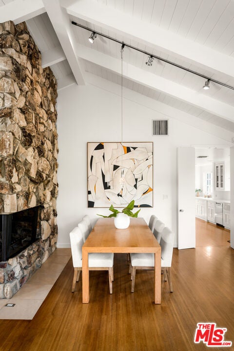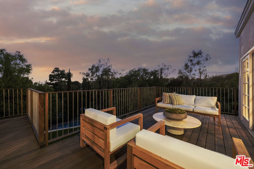 Set in the coveted Nichols Canyon enclave, this 5-bedroom, 3.5-bath, California contemporary offers privacy, character, and sweeping views with a large flat yard and pool. A discreet gated courtyard opens to double-entry doors and a sunlit great room with soaring beamed ceilings, a stone fireplace, and walls of glass that frame wraparound decks. From here, the views stretch across canyon hillsides to city lights, with the ocean and Catalina Island visible on clear days. The home's versatile two-level layout, with views from nearly every room, lends itself to both quiet retreat and creative work. Off the kitchen, a dining deck sets the stage for meals or conversation with dramatic views as a backdrop. The main floor features two bedrooms, including a serene primary suite with a private deck and direct access to patios below. The lower level adds three bedrooms, two bathrooms, and a generous family room with wood burning fireplace, custom built-ins, and French doors that connect to the expansive flat, sun-drenched lawn, bordered by mature Sycamore and fruit trees. A solar-heated pool with Saltillo-tiled deck anchors the outdoor space, and offers a private setting to gather, entertain, or unwind. With multiple decks, a flexible floor plan, and a peaceful natural setting, this exceptionally private home captures the essence of Los Angeles indoor-outdoor living just minutes from Runyon Canyon, West Hollywood, Beverly Hills, and the Valley.