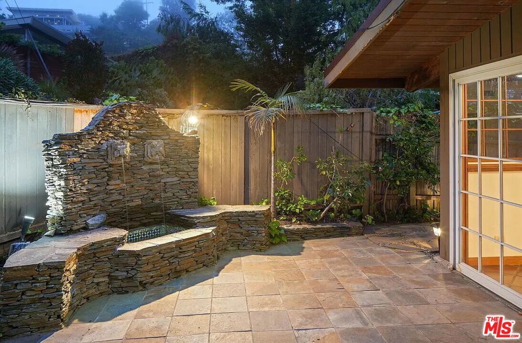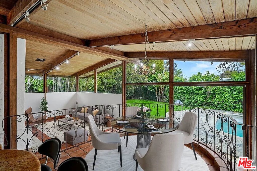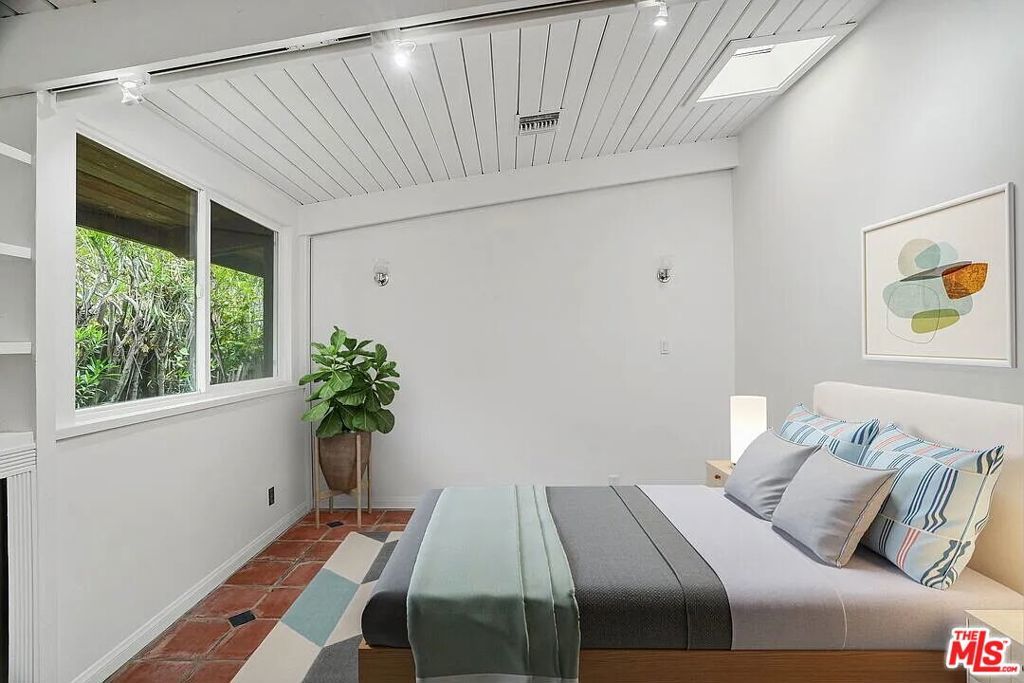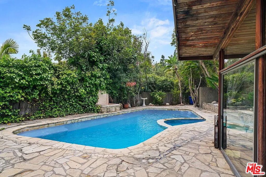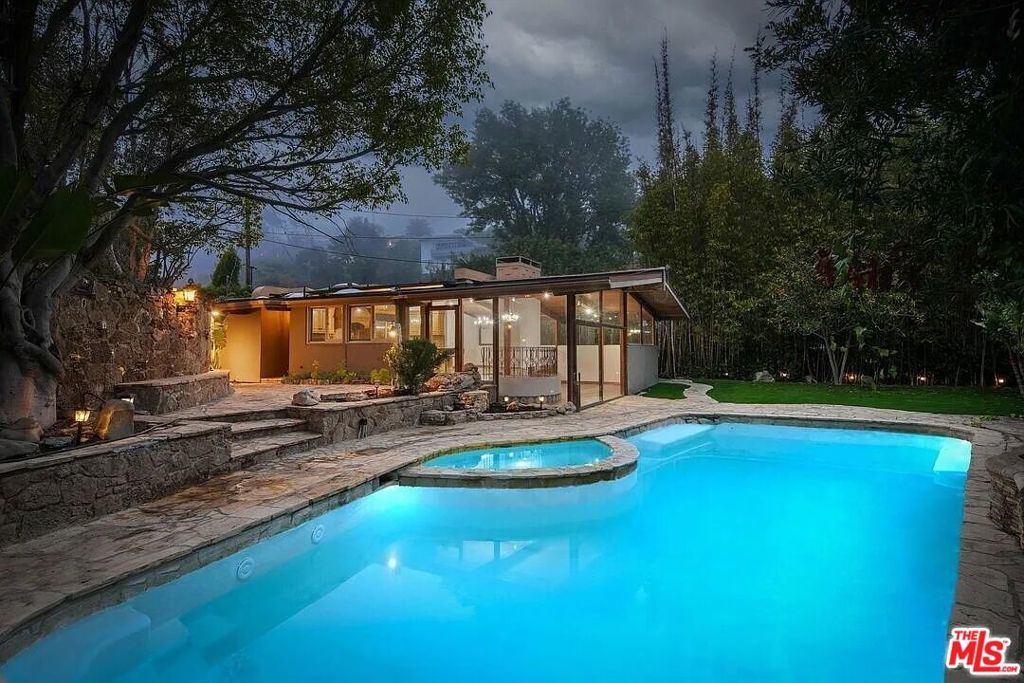 Privately tucked behind fencing on a quiet cul-de-sac, this stunning Mid-Century residence showcases 3 bedrooms, 3 bathrooms, and a tranquil backyard oasis with pool and spa. Walls of glass and skylights fill the open floor plan with sunlight, highlighting vaulted wood ceilings and terracotta tile floors. The chef's kitchen features stone countertops, premium stainless steel appliances, a seated island, and breakfast nook overlooking the lush backyard. Nearby, the dining area flows into a sunken living room centered around a dramatic floor to ceiling fireplace. Two secondary bedrooms enjoy abundant light and skylights with an en suite bath while the expansive primary suite offers sliding glass doors, a built in reading nook, ample storage, and a spa like bath with dual vanities and a jetted tub. Enveloped by mature bamboo and greenery, the backyard is a private haven with a sparkling pool and spa, stone patio, and turf lawn ideal for year round relaxation. A two car garage with washer/dryer and storage completes this timeless Los Angeles retreat, blending MidCentury design with modern comfort in a serene, convenient location.