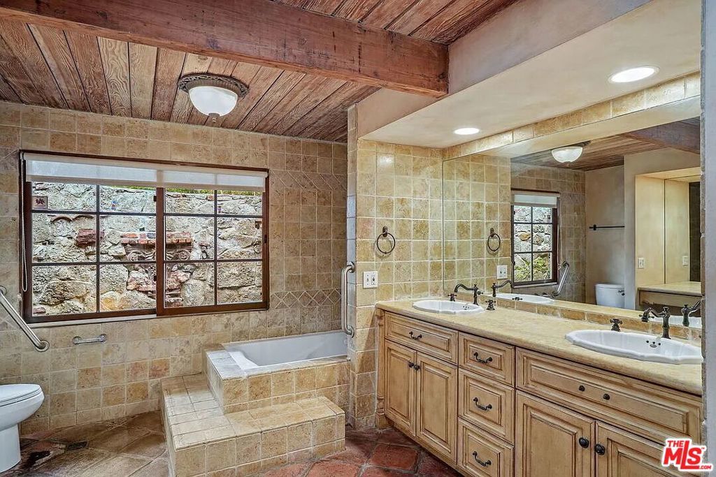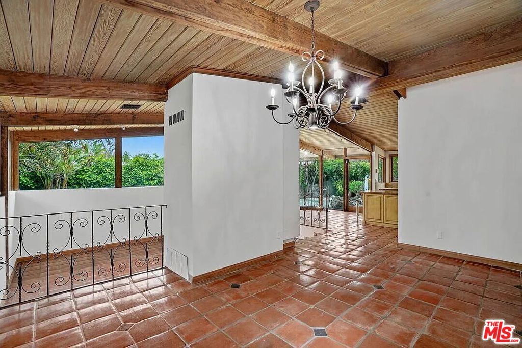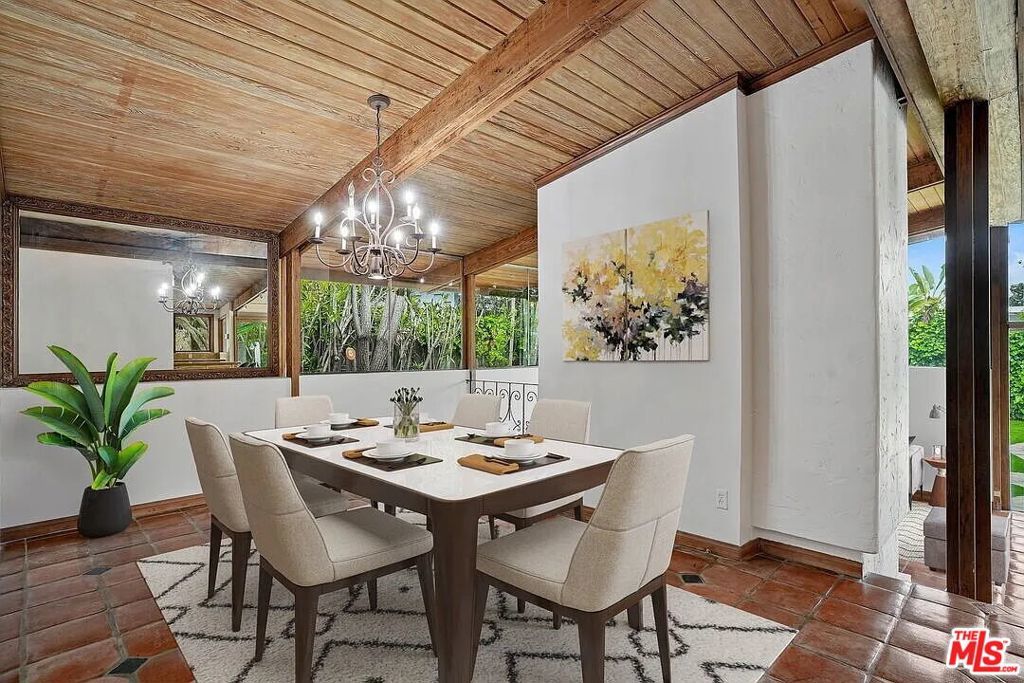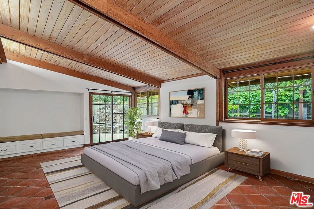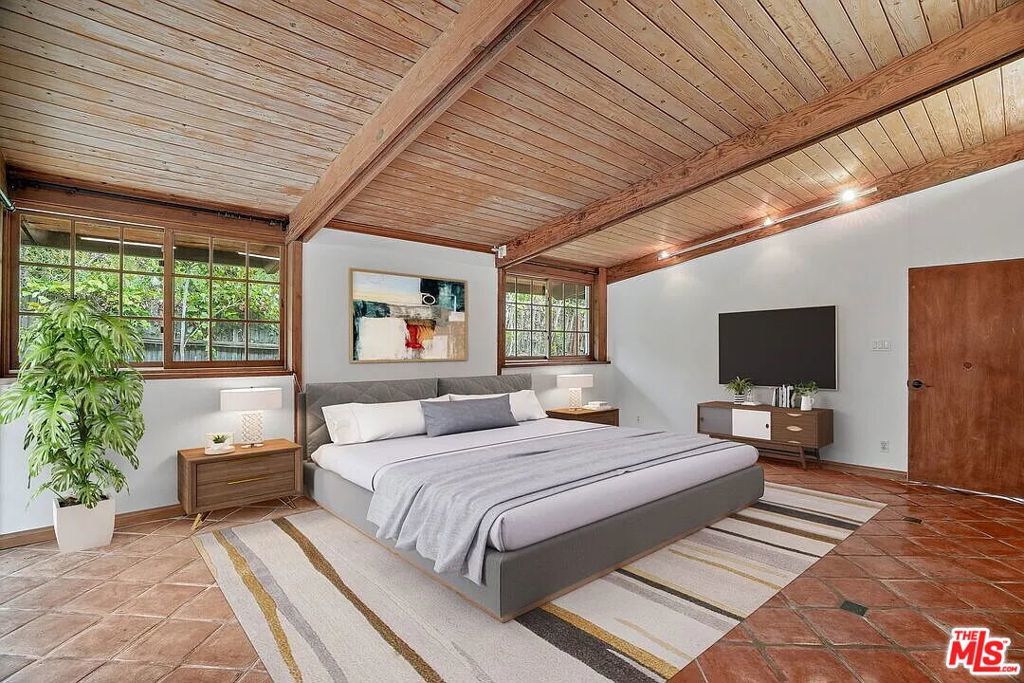 Privately tucked behind fencing on a quiet cul-de-sac, this stunning Mid-Century residence showcases 3 bedrooms, 3 bathrooms, and a tranquil backyard oasis with pool and spa. Walls of glass and skylights fill the open floor plan with sunlight, highlighting vaulted wood ceilings and terracotta tile floors. The chef's kitchen features stone countertops, premium stainless steel appliances, a seated island, and breakfast nook overlooking the lush backyard. Nearby, the dining area flows into a sunken living room centered around a dramatic floor to ceiling fireplace. Two secondary bedrooms enjoy abundant light and skylights with an en suite bath while the expansive primary suite offers sliding glass doors, a built in reading nook, ample storage, and a spa like bath with dual vanities and a jetted tub. Enveloped by mature bamboo and greenery, the backyard is a private haven with a sparkling pool and spa, stone patio, and turf lawn ideal for year round relaxation. A two car garage with washer/dryer and storage completes this timeless Los Angeles retreat, blending MidCentury design with modern comfort in a serene, convenient location.