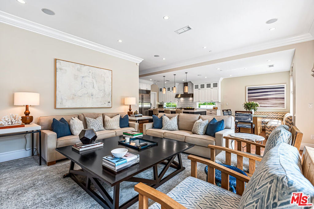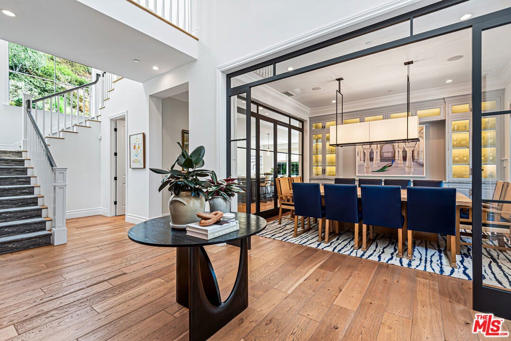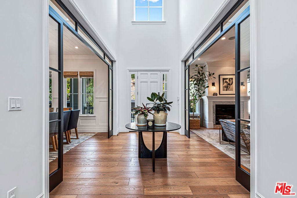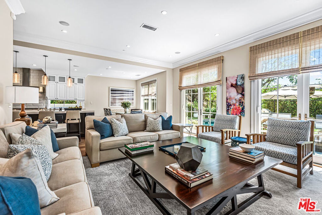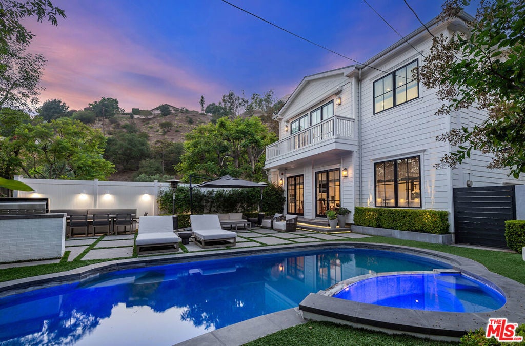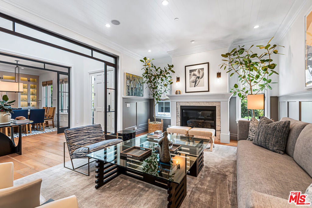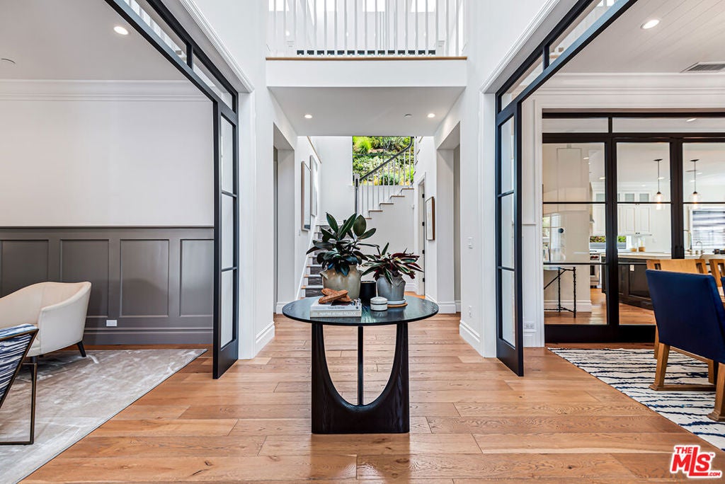 Spectacular newer built Hamptons Traditional offering nearly 4600 square feet of beautifully customized living space. Designed with exceptional flair and high end finishes, this 5 bedroom residence with office and versatile media or playroom combines timeless elegance with modern comfort. A dramatic two story foyer welcomes you into light filled interiors with an inviting open flow, soaring ten foot ceilings, and abundant natural light. The main level showcases a warm and gracious layout perfect for both gatherings and entertaining, featuring living, dining, and great rooms. The gourmet kitchen is a chef's dream, appointed with stainless steel appliances, butler's pantry, and custom French Oak hardwood flooring. The primary suite is a true retreat with a pitched ceiling, crafted woodwork, two oversized custom closets, and a luxurious spa inspired bath. Three additional upstairs bedrooms each include ensuite baths, while a spacious sunlit landing doubles as a play area or den. Additional amenities include a downstairs guest suite, private office, practical upstairs laundry, and an expansive media or playroom complete with a built-in wine fridge. Outdoor living shines with a sparkling pool and spa, built in barbecue bar, and a completely reimagined backyard designed for relaxation and entertaining. Olive trees with dramatic focal lighting, custom coyote fencing, and a remote operated irrigation system enhance the serene setting. Thoughtful upgrades abound, from Phillip Jeffries and Kelly Wearstler wall coverings to Waterworks bath fixtures, custom cabinetry and bookcases, glass panels and doors, a bespoke mudroom, garage storage, and exterior cameras. This Brentwood gem sits on a peaceful tree lined street with inviting curb appeal and front porch charm, blending luxury, practicality, and modern sophistication in one exceptional home.