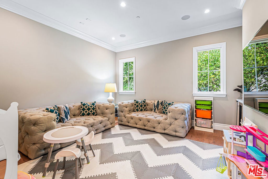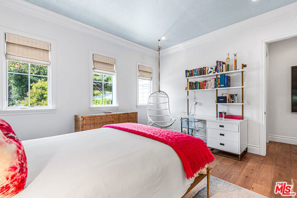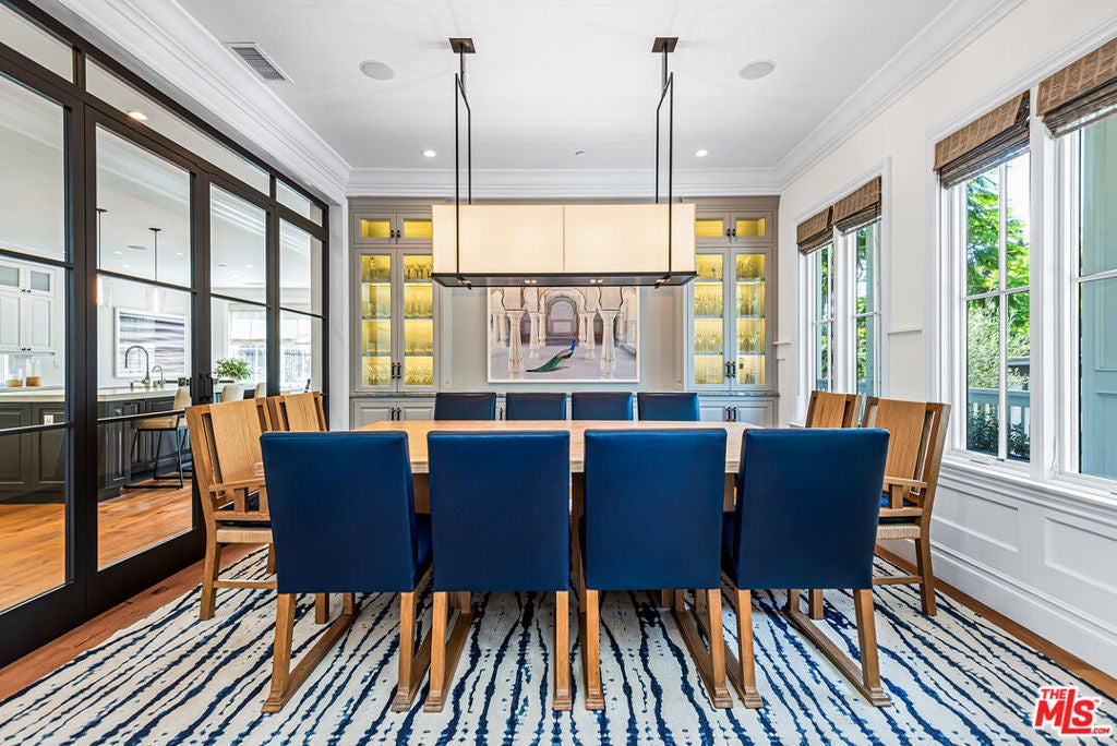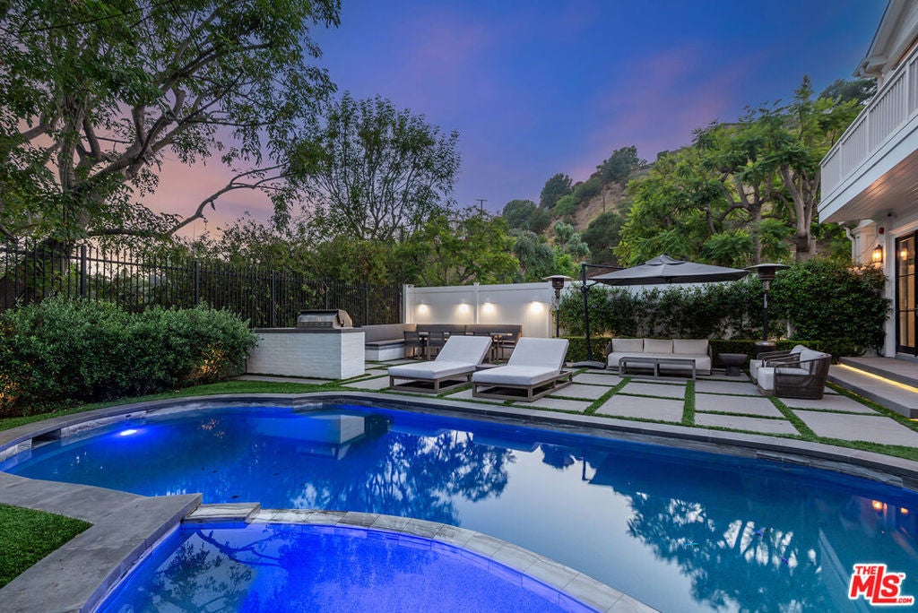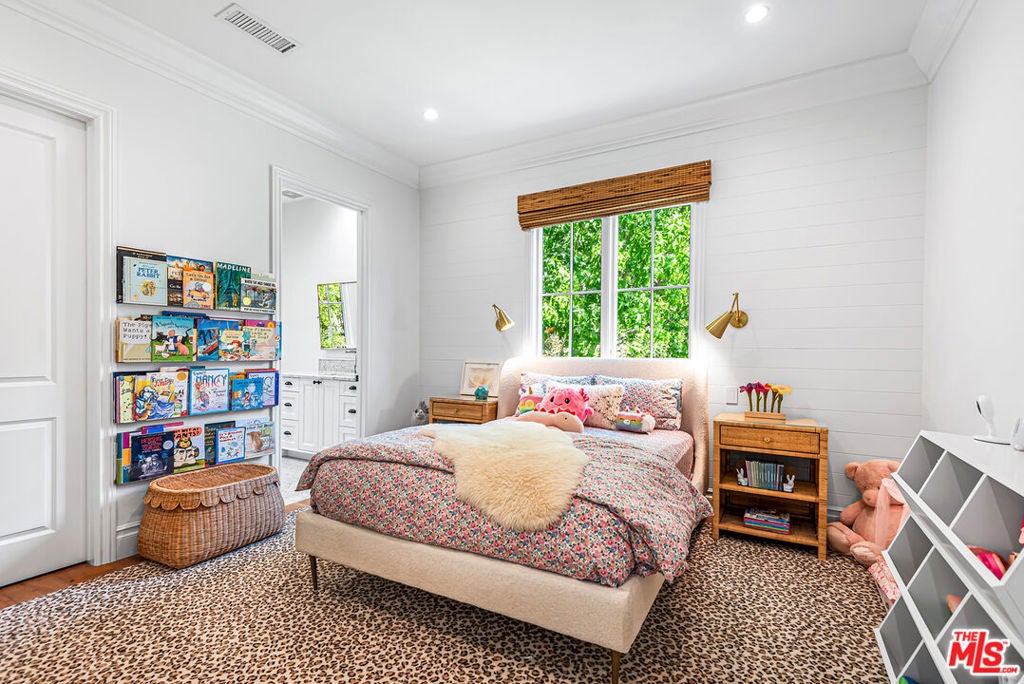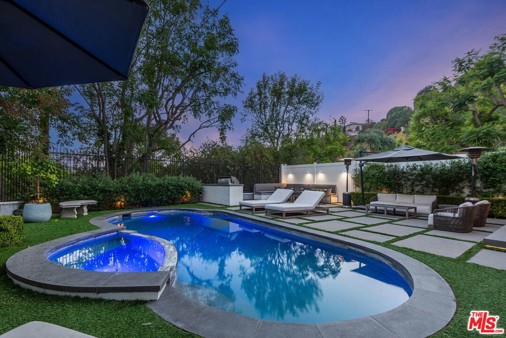 Spectacular newer built Hamptons Traditional offering nearly 4600 square feet of beautifully customized living space. Designed with exceptional flair and high end finishes, this 5 bedroom residence with office and versatile media or playroom combines timeless elegance with modern comfort. A dramatic two story foyer welcomes you into light filled interiors with an inviting open flow, soaring ten foot ceilings, and abundant natural light. The main level showcases a warm and gracious layout perfect for both gatherings and entertaining, featuring living, dining, and great rooms. The gourmet kitchen is a chef's dream, appointed with stainless steel appliances, butler's pantry, and custom French Oak hardwood flooring. The primary suite is a true retreat with a pitched ceiling, crafted woodwork, two oversized custom closets, and a luxurious spa inspired bath. Three additional upstairs bedrooms each include ensuite baths, while a spacious sunlit landing doubles as a play area or den. Additional amenities include a downstairs guest suite, private office, practical upstairs laundry, and an expansive media or playroom complete with a built-in wine fridge. Outdoor living shines with a sparkling pool and spa, built in barbecue bar, and a completely reimagined backyard designed for relaxation and entertaining. Olive trees with dramatic focal lighting, custom coyote fencing, and a remote operated irrigation system enhance the serene setting. Thoughtful upgrades abound, from Phillip Jeffries and Kelly Wearstler wall coverings to Waterworks bath fixtures, custom cabinetry and bookcases, glass panels and doors, a bespoke mudroom, garage storage, and exterior cameras. This Brentwood gem sits on a peaceful tree lined street with inviting curb appeal and front porch charm, blending luxury, practicality, and modern sophistication in one exceptional home.