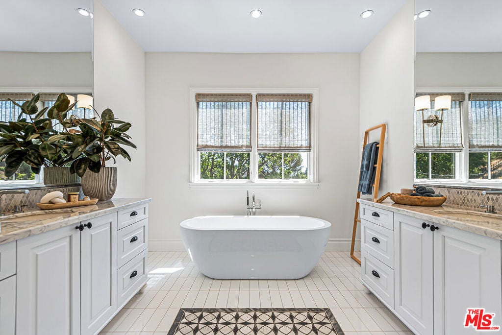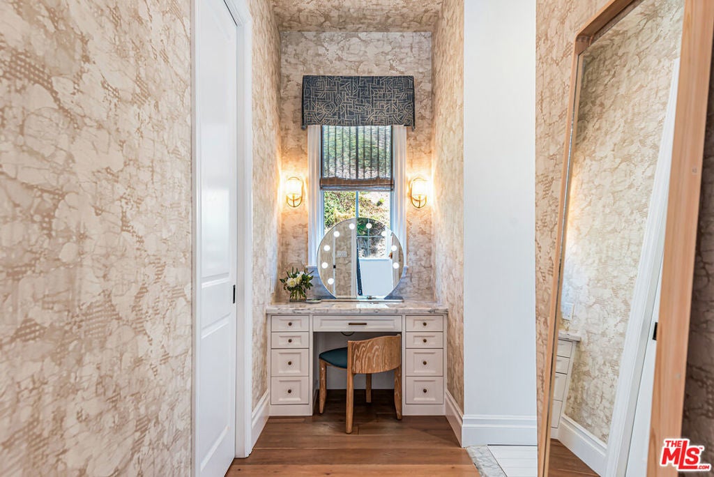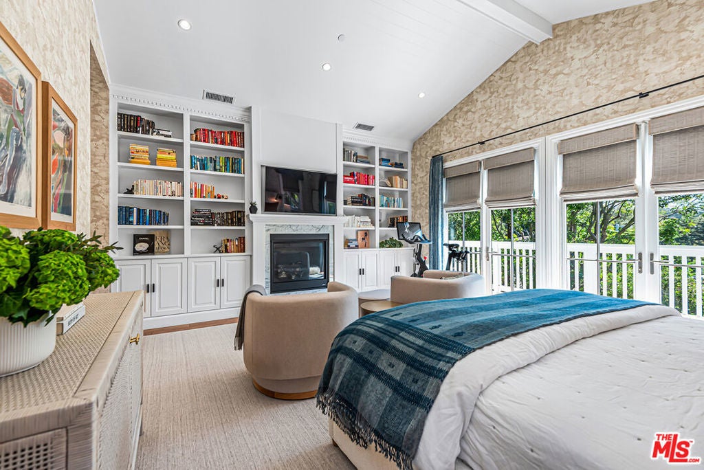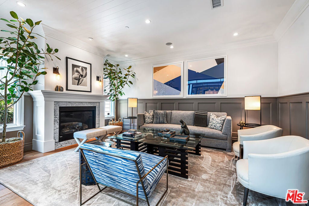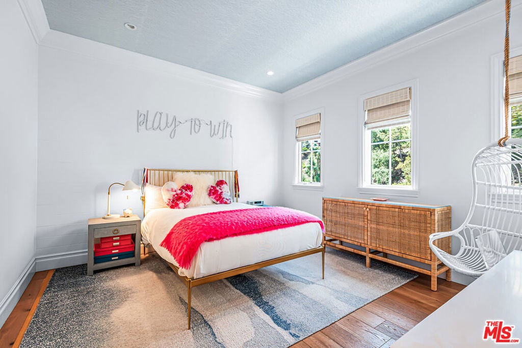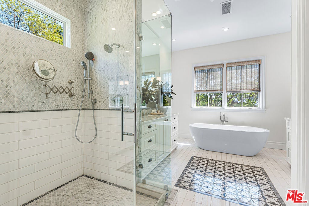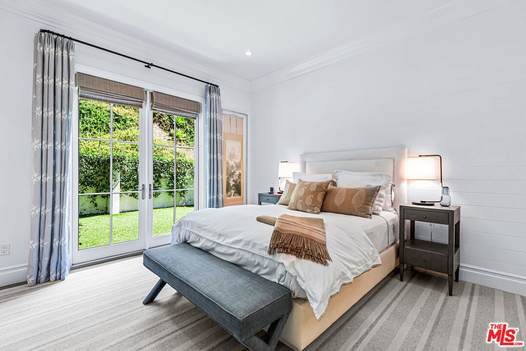 Spectacular newer built Hamptons Traditional offering nearly 4600 square feet of beautifully customized living space. Designed with exceptional flair and high end finishes, this 5 bedroom residence with office and versatile media or playroom combines timeless elegance with modern comfort. A dramatic two story foyer welcomes you into light filled interiors with an inviting open flow, soaring ten foot ceilings, and abundant natural light. The main level showcases a warm and gracious layout perfect for both gatherings and entertaining, featuring living, dining, and great rooms. The gourmet kitchen is a chef's dream, appointed with stainless steel appliances, butler's pantry, and custom French Oak hardwood flooring. The primary suite is a true retreat with a pitched ceiling, crafted woodwork, two oversized custom closets, and a luxurious spa inspired bath. Three additional upstairs bedrooms each include ensuite baths, while a spacious sunlit landing doubles as a play area or den. Additional amenities include a downstairs guest suite, private office, practical upstairs laundry, and an expansive media or playroom complete with a built-in wine fridge. Outdoor living shines with a sparkling pool and spa, built in barbecue bar, and a completely reimagined backyard designed for relaxation and entertaining. Olive trees with dramatic focal lighting, custom coyote fencing, and a remote operated irrigation system enhance the serene setting. Thoughtful upgrades abound, from Phillip Jeffries and Kelly Wearstler wall coverings to Waterworks bath fixtures, custom cabinetry and bookcases, glass panels and doors, a bespoke mudroom, garage storage, and exterior cameras. This Brentwood gem sits on a peaceful tree lined street with inviting curb appeal and front porch charm, blending luxury, practicality, and modern sophistication in one exceptional home.