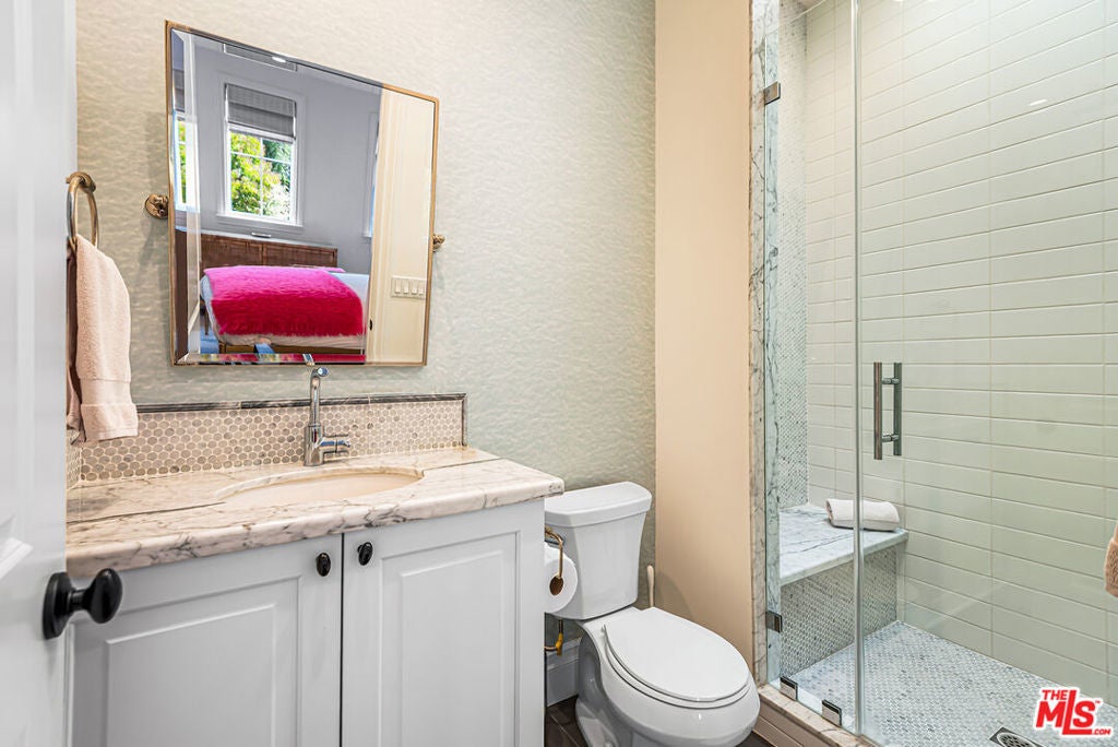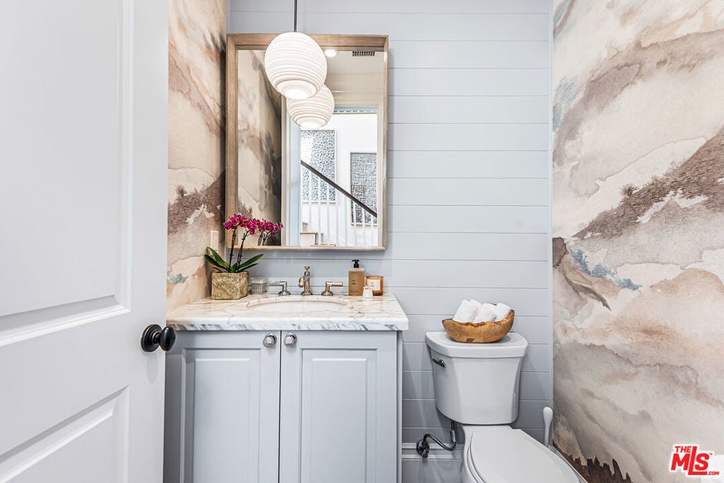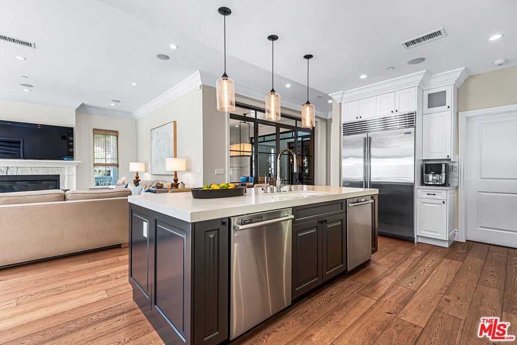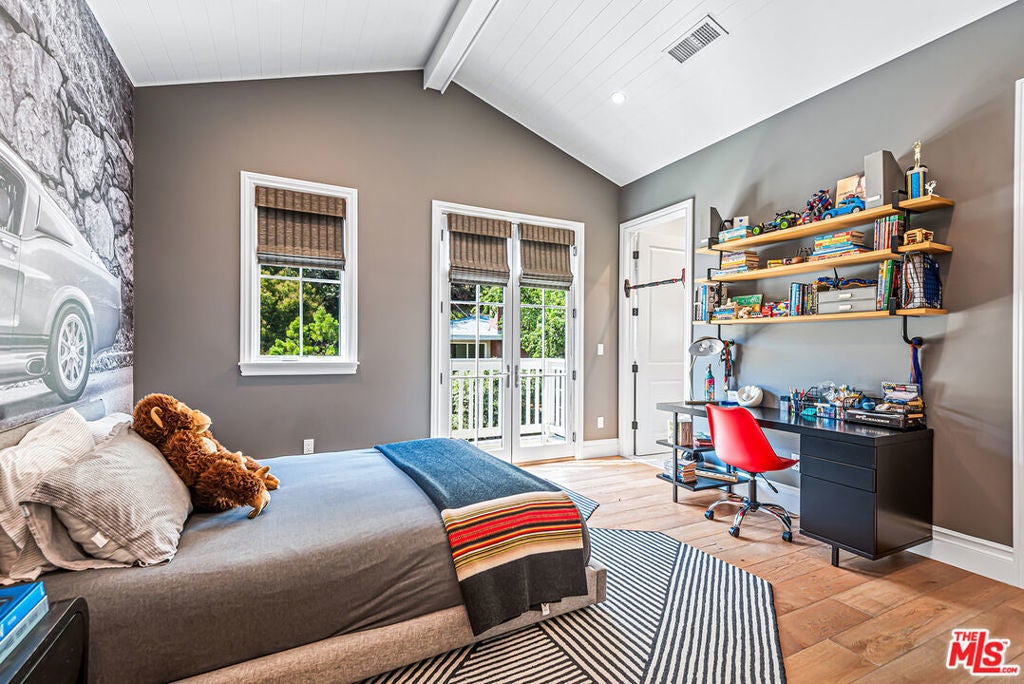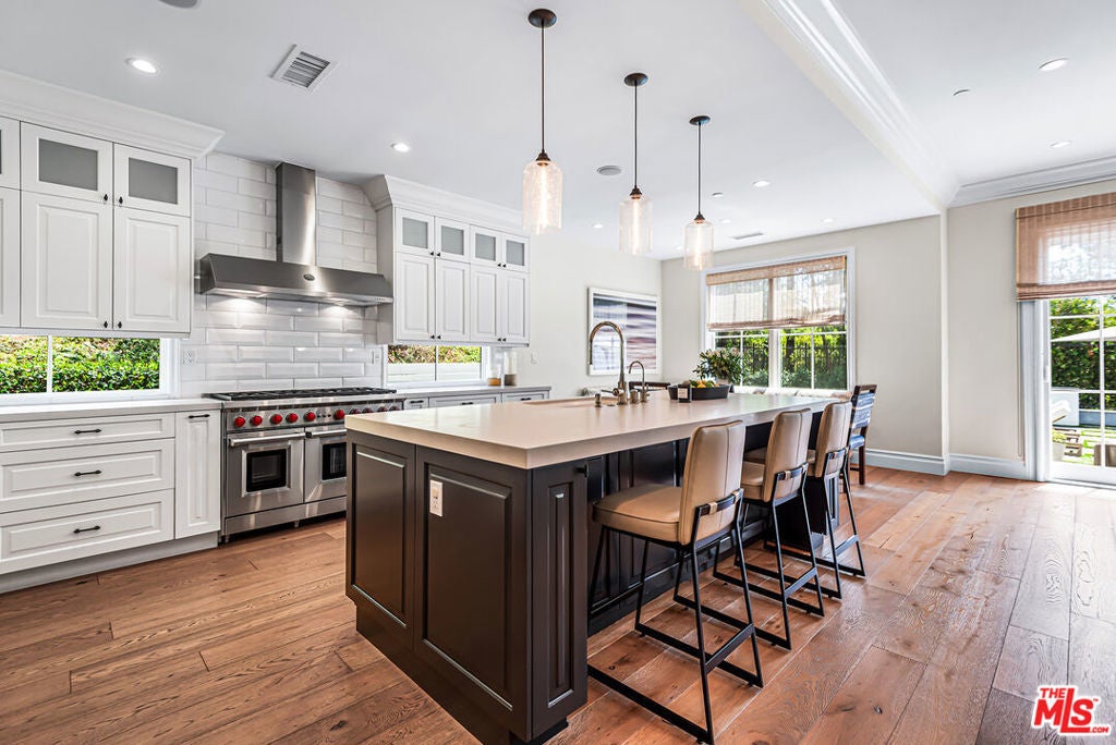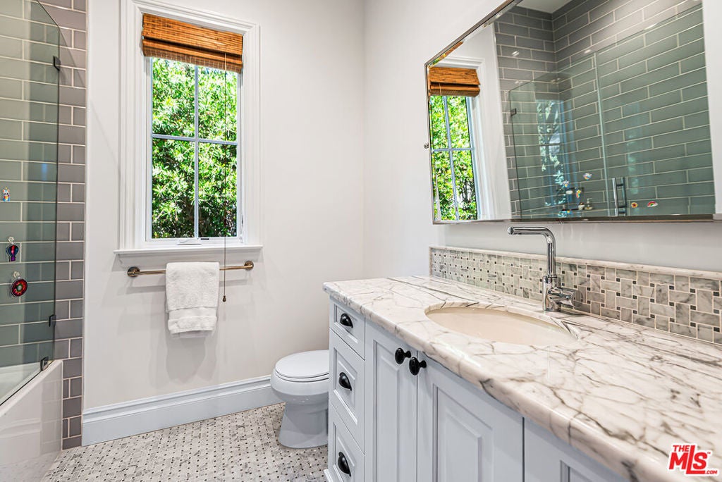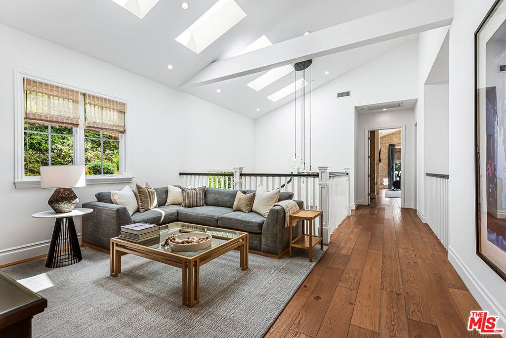 Spectacular newer built Hamptons Traditional offering nearly 4600 square feet of beautifully customized living space. Designed with exceptional flair and high end finishes, this 5 bedroom residence with office and versatile media or playroom combines timeless elegance with modern comfort. A dramatic two story foyer welcomes you into light filled interiors with an inviting open flow, soaring ten foot ceilings, and abundant natural light. The main level showcases a warm and gracious layout perfect for both gatherings and entertaining, featuring living, dining, and great rooms. The gourmet kitchen is a chef's dream, appointed with stainless steel appliances, butler's pantry, and custom French Oak hardwood flooring. The primary suite is a true retreat with a pitched ceiling, crafted woodwork, two oversized custom closets, and a luxurious spa inspired bath. Three additional upstairs bedrooms each include ensuite baths, while a spacious sunlit landing doubles as a play area or den. Additional amenities include a downstairs guest suite, private office, practical upstairs laundry, and an expansive media or playroom complete with a built-in wine fridge. Outdoor living shines with a sparkling pool and spa, built in barbecue bar, and a completely reimagined backyard designed for relaxation and entertaining. Olive trees with dramatic focal lighting, custom coyote fencing, and a remote operated irrigation system enhance the serene setting. Thoughtful upgrades abound, from Phillip Jeffries and Kelly Wearstler wall coverings to Waterworks bath fixtures, custom cabinetry and bookcases, glass panels and doors, a bespoke mudroom, garage storage, and exterior cameras. This Brentwood gem sits on a peaceful tree lined street with inviting curb appeal and front porch charm, blending luxury, practicality, and modern sophistication in one exceptional home.
