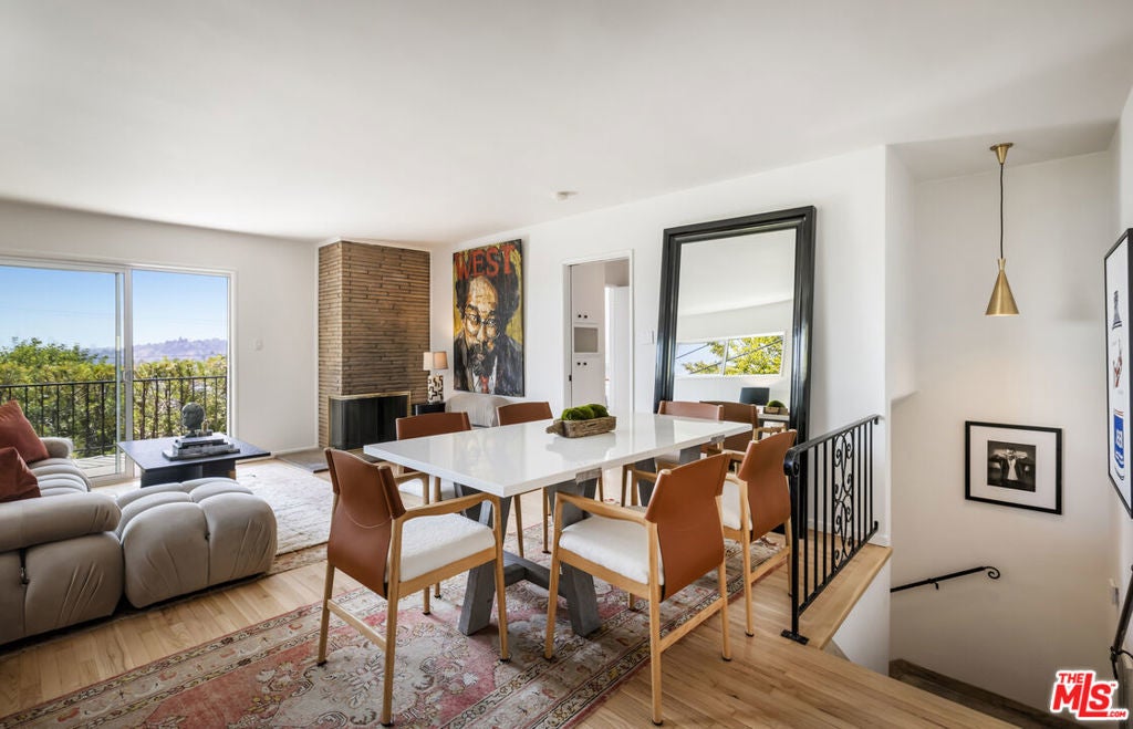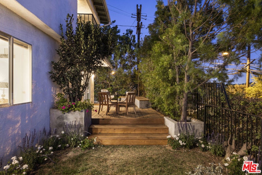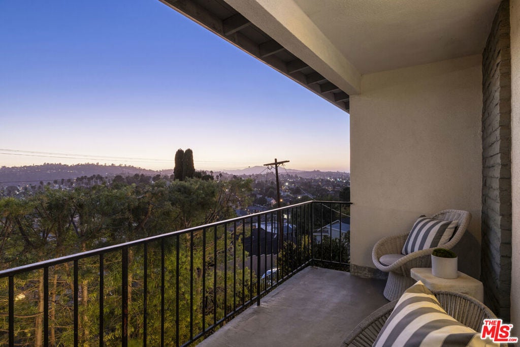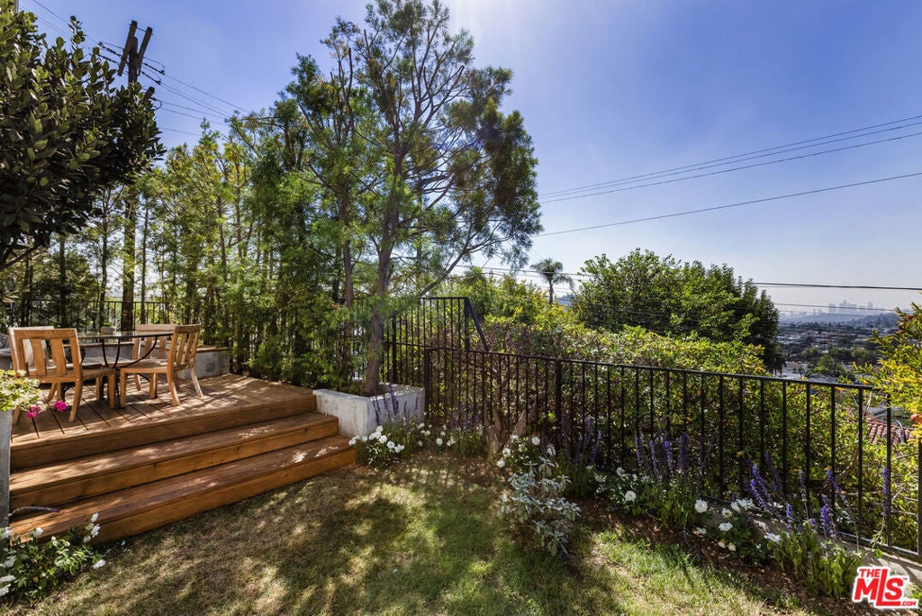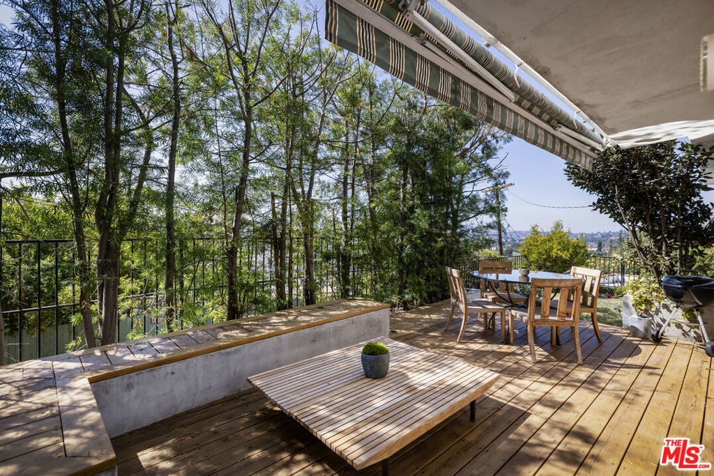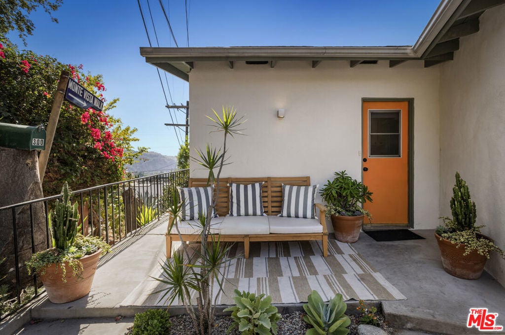Located at the top of Mount Angelus, one of Highland Park's most coveted enclaves, this captivating c1957 Mid-Century modern home offers superb original details, endless natural sunlight, spectacular downtown skyline views, and total privacy; ensconced among tall trees on a street to street lot and feels like you have no neighbors. Enter the property from the end of the cul-de-sac at the peak of the hill on Wayland St, where there is a 2 car garage and two entrances at street level. (La Follette Drive is below the property.) Front walkway leads to main entrance and large living room with stunning character fireplace and hearth, original hardwood floors, ample dining area and spacious walk-out balcony with panoramic 180 views of greenery, architecture, and the hills-- capped by the downtown LA skyscape. Kitchen with separate entrance offers new cork floors, new appliances and cool vintage cabinetry. Featuring hardwood floors and large windows framing breathtaking views, the primary suite is spacious and private. The lower level features a large family room with abundant custom shelving from HP's Matters of Space, and two exterior entrances: one entrance to the side stairs; plus sliders opening to large deck and yard/garden--perfect for outdoor entertaining. Built-ins; ironwork, magnesite stairs, original doors and many other details give this beautiful home a true classic feel. Large laundry and utility room also opens to the outside. Explore endless local eateries like Bub and Grandmas and Joy; and walk to rec center, music venues and theaters. Feel space, privacy and nature with the city at your fingertips: centrally located to downtown, Pasadena and Glendale.