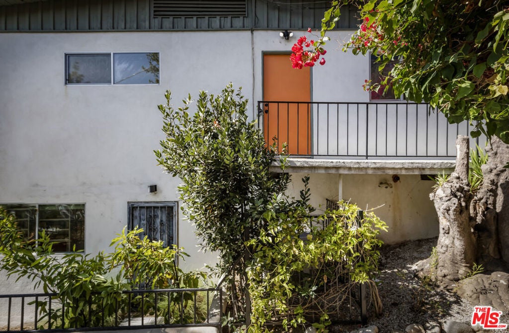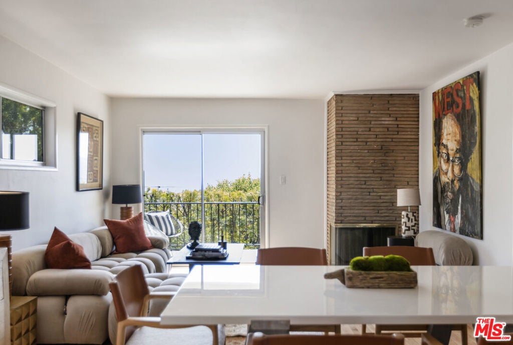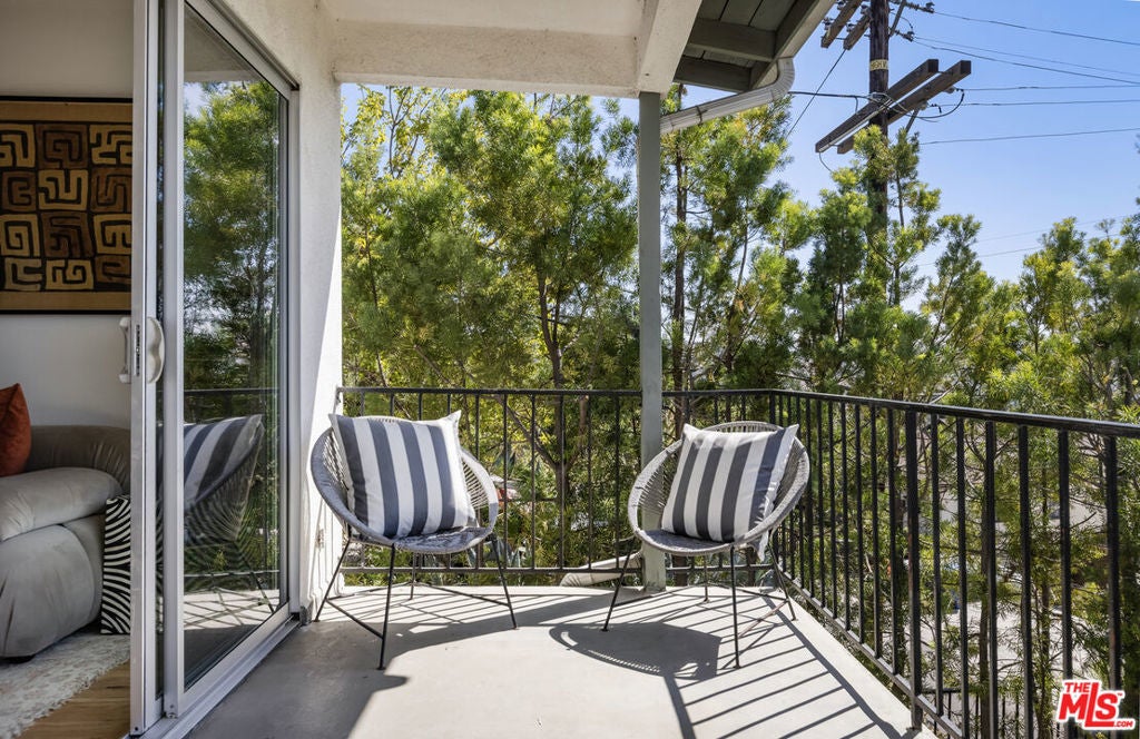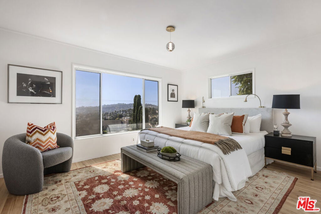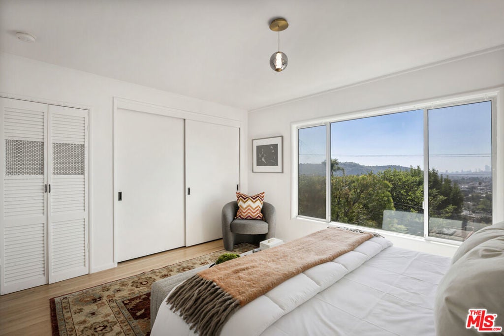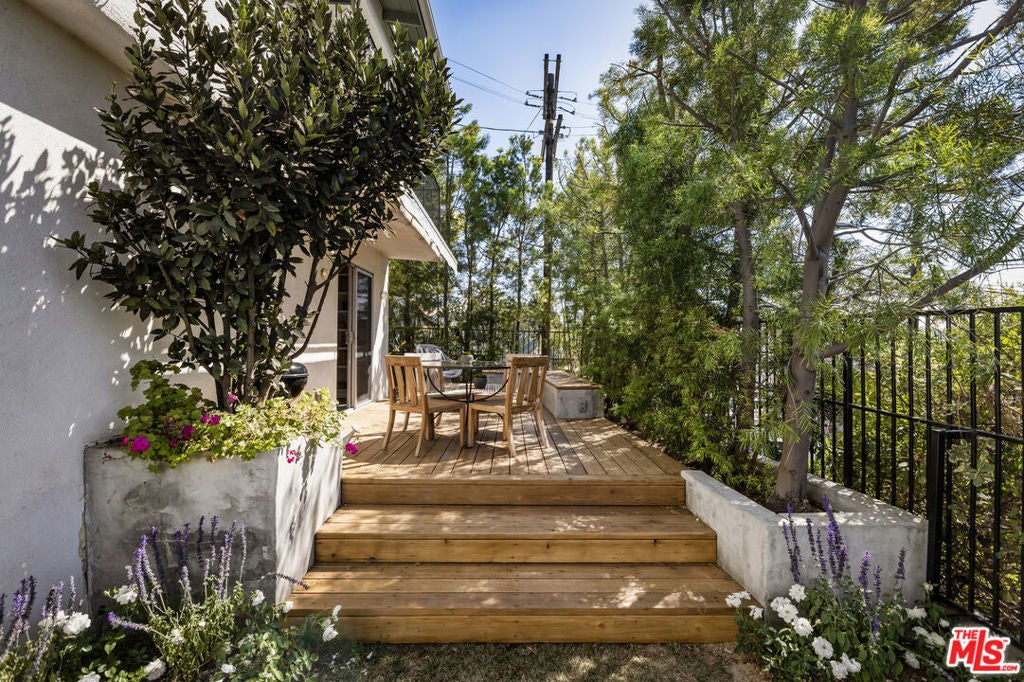Located at the top of Mount Angelus, one of Highland Park's most coveted enclaves, this captivating c1957 Mid-Century modern home offers superb original details, endless natural sunlight, spectacular downtown skyline views, and total privacy; ensconced among tall trees on a street to street lot and feels like you have no neighbors. Enter the property from the end of the cul-de-sac at the peak of the hill on Wayland St, where there is a 2 car garage and two entrances at street level. (La Follette Drive is below the property.) Front walkway leads to main entrance and large living room with stunning character fireplace and hearth, original hardwood floors, ample dining area and spacious walk-out balcony with panoramic 180 views of greenery, architecture, and the hills-- capped by the downtown LA skyscape. Kitchen with separate entrance offers new cork floors, new appliances and cool vintage cabinetry. Featuring hardwood floors and large windows framing breathtaking views, the primary suite is spacious and private. The lower level features a large family room with abundant custom shelving from HP's Matters of Space, and two exterior entrances: one entrance to the side stairs; plus sliders opening to large deck and yard/garden--perfect for outdoor entertaining. Built-ins; ironwork, magnesite stairs, original doors and many other details give this beautiful home a true classic feel. Large laundry and utility room also opens to the outside. Explore endless local eateries like Bub and Grandmas and Joy; and walk to rec center, music venues and theaters. Feel space, privacy and nature with the city at your fingertips: centrally located to downtown, Pasadena and Glendale.