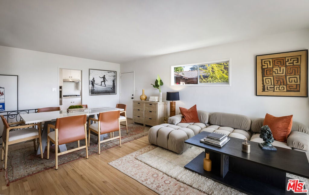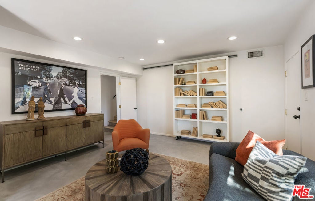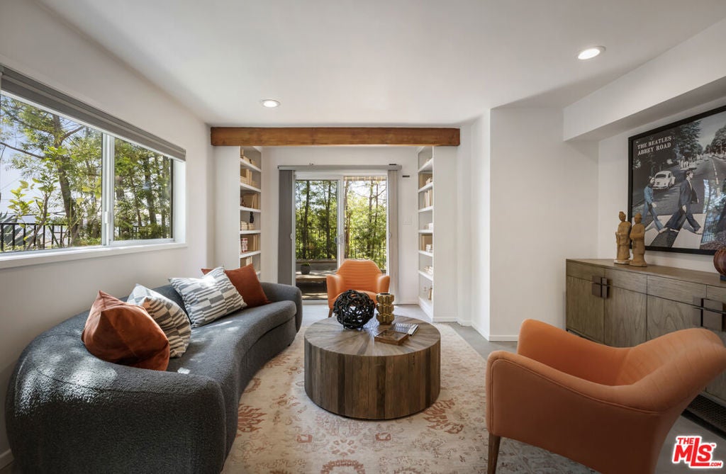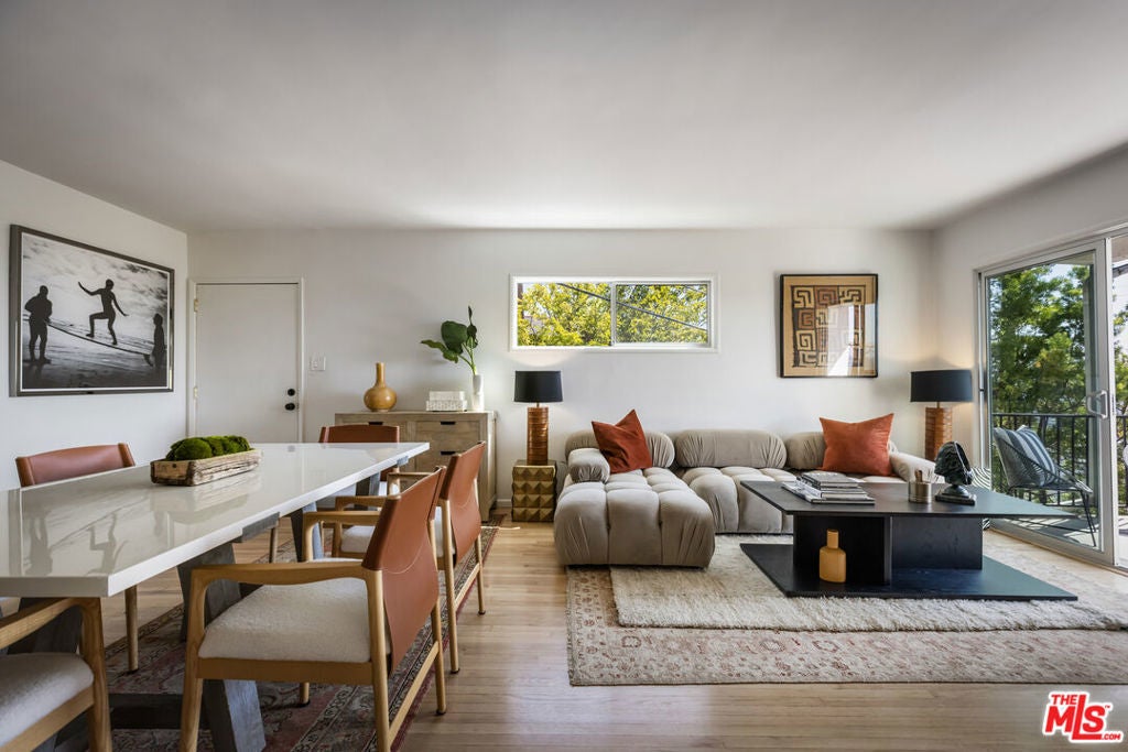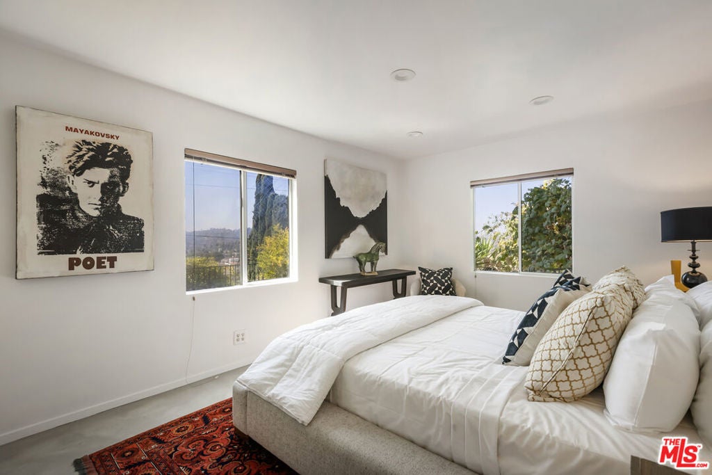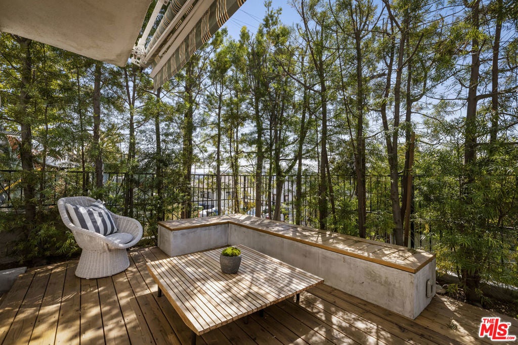 Located at the top of Mount Angelus, one of Highland Park's most coveted enclaves, this captivating c1957 Mid-Century modern home offers superb original details, endless natural sunlight, spectacular downtown skyline views, and total privacy; ensconced among tall trees on a street to street lot and feels like you have no neighbors. Enter the property from the end of the cul-de-sac at the peak of the hill on Wayland St, where there is a 2 car garage and two entrances at street level. (La Follette Drive is below the property.) Front walkway leads to main entrance and large living room with stunning character fireplace and hearth, original hardwood floors, ample dining area and spacious walk-out balcony with panoramic 180 views of greenery, architecture, and the hills-- capped by the downtown LA skyscape. Kitchen with separate entrance offers new cork floors, new appliances and cool vintage cabinetry. Featuring hardwood floors and large windows framing breathtaking views, the primary suite is spacious and private. The lower level features a large family room with abundant custom shelving from HP's Matters of Space, and two exterior entrances: one entrance to the side stairs; plus sliders opening to large deck and yard/garden--perfect for outdoor entertaining. Built-ins; ironwork, magnesite stairs, original doors and many other details give this beautiful home a true classic feel. Large laundry and utility room also opens to the outside. Explore endless local eateries like Bub and Grandmas and Joy; and walk to rec center, music venues and theaters. Feel space, privacy and nature with the city at your fingertips: centrally located to downtown, Pasadena and Glendale.