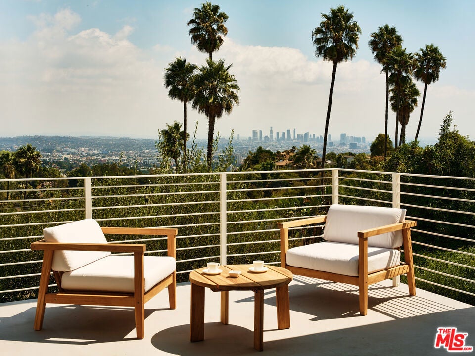 Tucked away in the prestigious Outpost Estates, this extraordinary residence offers a unique blend of organic modern style, breathtaking views, and ample privacy. Perched above the street behind gates and up a long driveway, this chic and understated home sits on an oversized lot enveloped by lush landscaping, creating a secluded sanctuary just moments from both the Westside and the San Fernando Valley. Expansive accordion-style walls of floor-to-ceiling glass frame sweeping city and canyon vistas, filling the interiors with natural light and a sense of openness. The seamless indoor-outdoor flow is enhanced by abundant outdoor living areas and a resort-like pool with hot tub, perfect for both intimate relaxation and large-scale entertaining. The open floor plan unites the family room, dining room, and chef's kitchen, where a generous island with bar seating and a pass-through window connects directly to a poolside bar. Folding glass doors on both sides of the main living areas create a remarkable sense of continuity between indoors and out. Each of the four bedrooms is a private retreat, complete with en-suite baths and direct access to outdoor spaces. The luxurious primary suite boasts a spa-like bathroom with soaking tub, dual rain shower, and an ample walk-in closet. Additional amenities include a state-of-the-art professional music studio, glass-enclosed wine cellar, and multiple fireplaces and firepits. Modern, elegant, and designed for effortless California living, this is a rare offering in one of Los Angeles' most coveted neighborhoods.