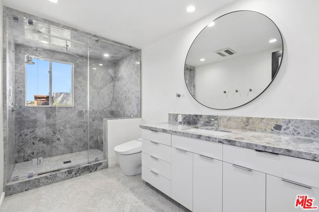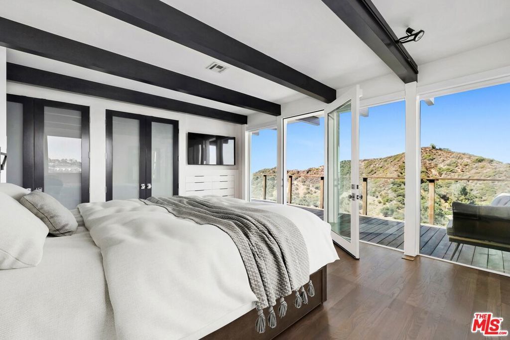 Available immediately! Be the first to live in this newly renovated view home in Beverly Hills Post Office, sited at the end of a long private cul-de-sac drive with 180-degree panoramas of the canyon, mountains, city, and ocean, from Palos Verdes to Catalina Island. Experience striking vistas from the large Brazilian Ipe viewing deck spanning the entire width of the home, accessed by both the primary suite and living room, with its floor-to-ceiling picture windows, sleek exposed beams, wood-burning fireplace, wet bar, and built-in reading nook. Rich wood floors flow into the bright kitchen with marble countertops, breakfast bar, recipe station, and stainless-steel appliances including Wolf range with hood. The owner's bedroom is a serene and relaxing retreat, complete with en-suite spa-inspired bath with beautiful stone work, oversized full-slab steam and rainwater shower with bench, and smart toilet. The light-filled secondary bedroom and bathroom are also smartly appointed with modern finishes, including a modern two-person whirlpool tub. Entertain guests, dine al-fresco, and gather around the fire pit under California skies in the expansive open-air patio, concealed and gated from the street. For convenience, there is a one-car garage plus carport with 30-amp plug for EV fast-charging capability as well as low-maintenance, drought-tolerant landscaping. The home is also wired for high-speed fiber optic internet from AT&T. Originally built by Stone-Fisher, highly regarded architects of the time, the home was extensively remodeled in 2023. Welcome to this excellent central location, tucked away from the city yet just moments to the high fashion of Rodeo Drive, the Sunset Strip, Century City, and the greater Westside. The Valley and Hollywood studios are also just a quick canyon drive away. Also available for sale.