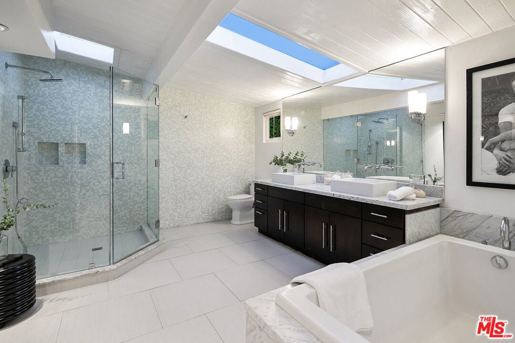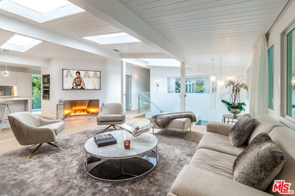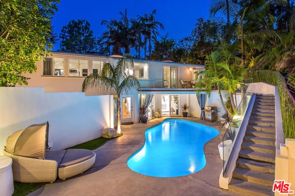 A very special "one of a kind" Mid-Century Oasis, and former of several A-List celebrities. Nestled in a small cul de sac just 2.5 minutes behind The Beverly Hills Hotel, close to Sunset Blvd. This home has an wonderful "vibe", featuring an open floor-plan with excellent indoor/ outdoor flow. An abundance of natural light fills the home, including 9 sky-lights, and 3 oversized fireplaces. Large sumptuous Primary Suite w/ spa like bathroom, and 2nd bedroom both feature walls of glass which open out to a dramatic 50 ft. Waterfall, pond, lush yard & Fire Pit with hilltop yoga area. Updated newer Kitchen w/ porcelain counters, custom cabinetry, & top of the line MIELE appliances. Spacious, light-filled living & dining area set atop the trees. Downstairs features a private 3rd bedroom w/ separate gated entrance, perfect for guests, teenager, office or live-in. Media Den with Bar and fantastic sunken "conversation pit", around a fireplace, perfect for movie nights or gatherings. Heated pool with new equipment glows from every room at night. Private and Tranquil with only 2 homes on street and ample parking rarely found in the hills. Private, walled and gated entry, ready to move in! Recent 5 year rental average has been $20,150. This contemporary gem is an incomparable property and rare offering. Open to month to month, 3 months, or 6 month lease as well. Can be furnished or non.