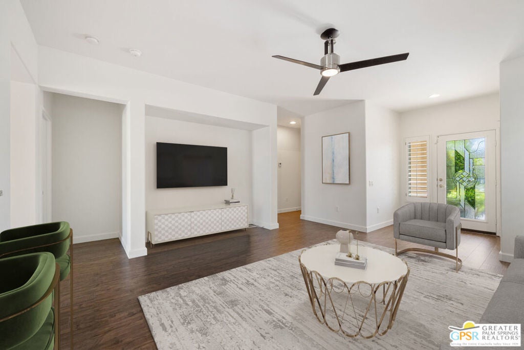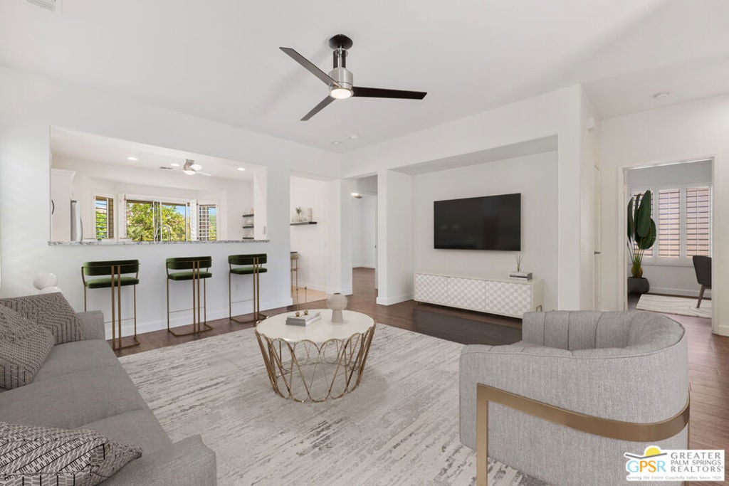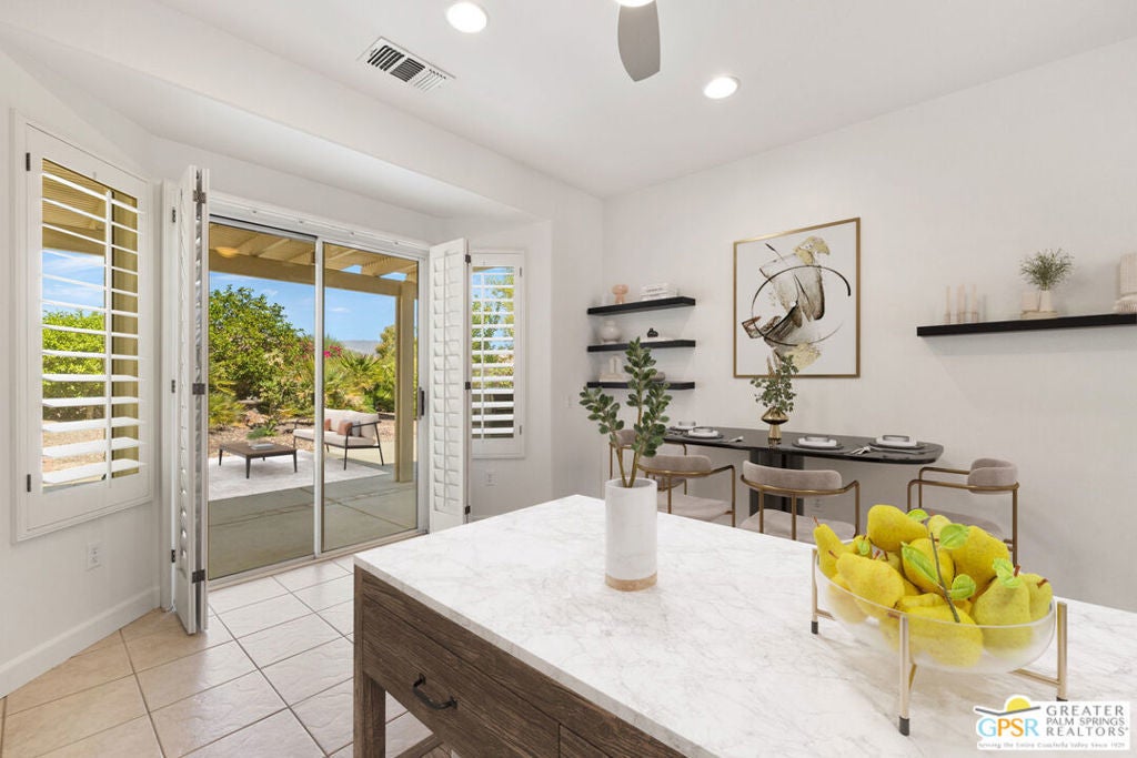 Move-in Ready! Freshly painted! Sought-after Pasadena model at Sun City Palm Desert offers 2 bedrooms and 2 baths in a bright, open-concept layout designed for easy living. Attractive curb appeal, low-maintenance landscaping, and a peaceful location on a quiet street that ends in a cul-de-sac (without being on it) make this home especially appealing. You'll also love the convenient proximity to the owners-only gate for easy access to Starbucks and grocery shopping - everyday life made simple. Ask about the nearby "secret" golf cart gate! Recent updates include fresh interior paint and slab granite countertops in the kitchen and baths. The kitchen features a reverse-osmosis water filter, stainless steel appliances, and a charming breakfast nook framed by a bay window and slider to the patio. Solid vinyl plank flooring flows through the main areas and bedrooms, complemented by plantation shutters and a custom glass front door. The Primary Suite offers a custom-fitted closet with upgraded cabinetry including built-ins, drawers, and shelving. The Guest Bedroom, located across from the second bath, includes a convenient Murphy bed. The finished 2-car garage features epoxy flooring, cabinetry, utility sink, and shelving for extra storage. Exterior highlights include a Restora overlay on the walkway and driveway. Enjoy a north-facing backyard with desert-wise landscaping, established citrus trees, an Alumawood patio cover, and an extended concrete terrace perfect for entertaining. Sun City Palm Desert is a 55+ resort-style community named by Money Magazine as one of the "Eight Best Places to Retire in America." Amenities include two 18-hole golf courses, an 18-hole putting course, multiple pools including exclusive use of a neighborhood pool, two fitness centers, tennis, pickleball, bocce, softball, dog parks, two restaurants, and more than 80 clubs and activities. Low HOA fees include cable and internet.