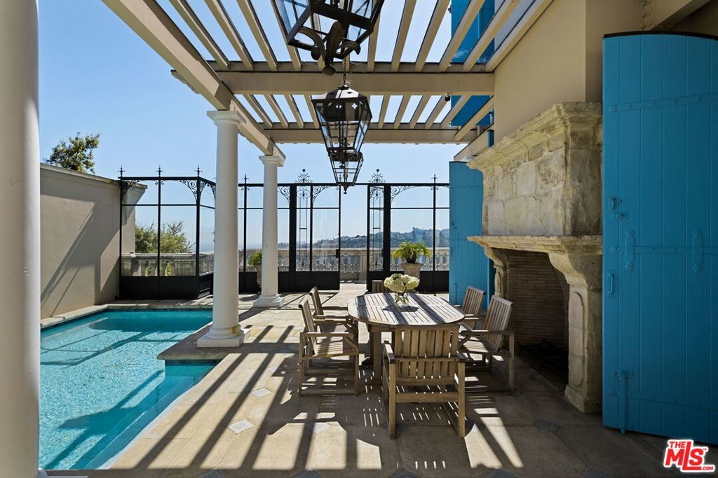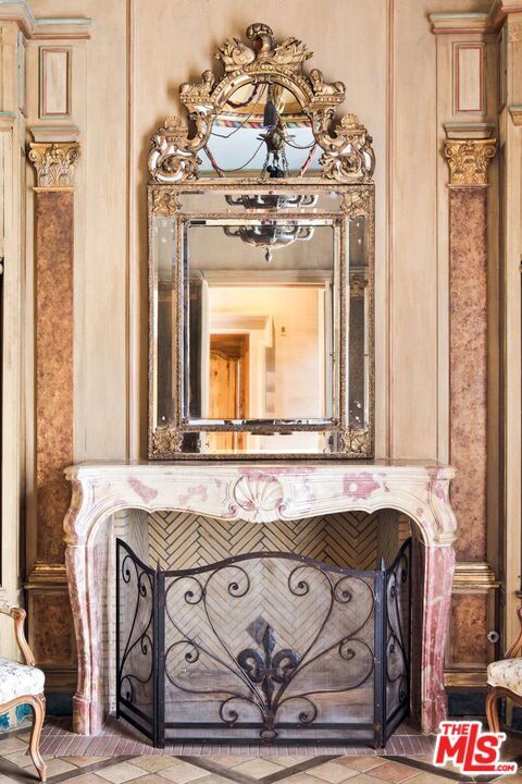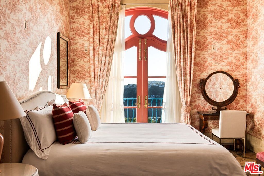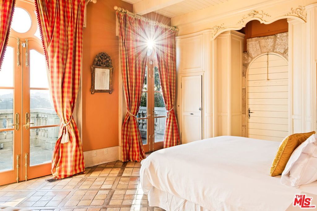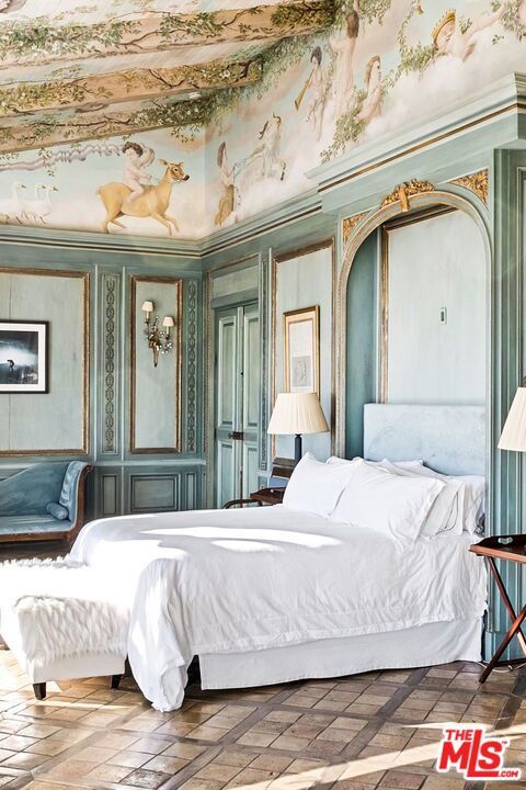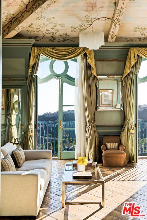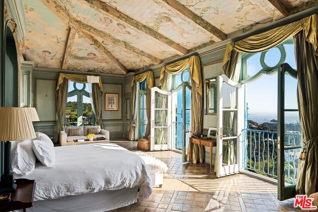 Step into the romance of the French countryside right in the heart of the Hollywood Hills. This fully furnished French Renaissance inspired chateau, perched high above Mulholland Drive, offers sweeping city, canyon, and ocean views that define California luxury. Cloaked in ivy, the residence's facade evokes centuries of history, adorned with authentic 15th-century hand-carved stone angels and gargoyles imported from France. Beyond the grand entrance, time seems to stand still. Inside, exquisite craftsmanship and timeless elegance abound. A stately 16th-century marble staircase ascends to the upper level, where three sumptuous bedrooms await. The grand primary suite serves as a true sanctuary, complete with an en-suite salon featuring a painted and gilded boiserie masterpiece. A fourth guest suite, with a private entrance, lies downstairs. Designed for effortless entertaining and refined living, the home seamlessly blends indoor and outdoor spaces. French doors flood the interiors with natural light, while the painted stone walls and graceful architectural details exude old-world charm. Expansive terraces provide inviting spaces for lounging or al fresco dining, all framed by panoramic vistas that stretch from the canyon to the glittering skyline and out to the ocean beyond.