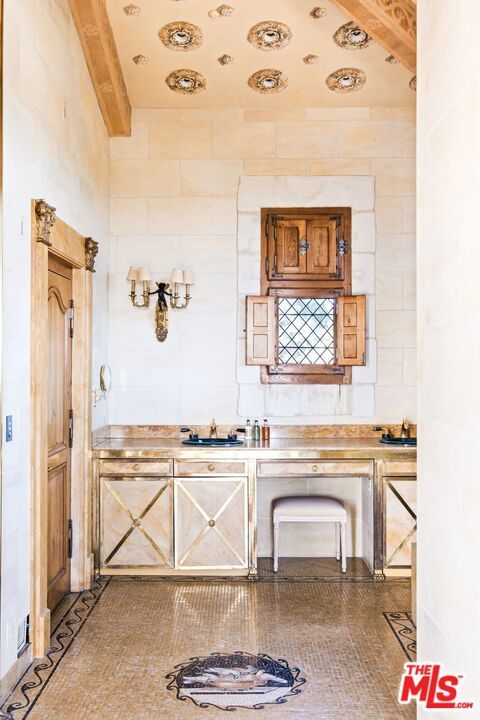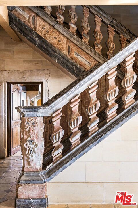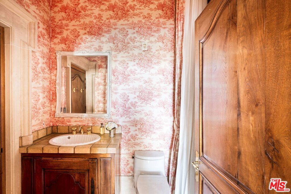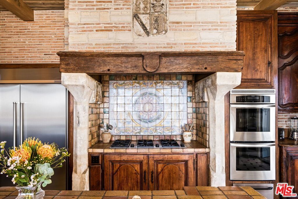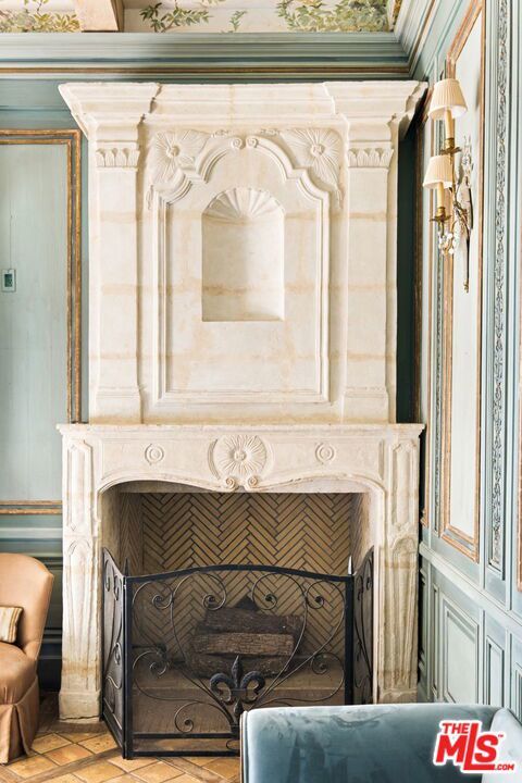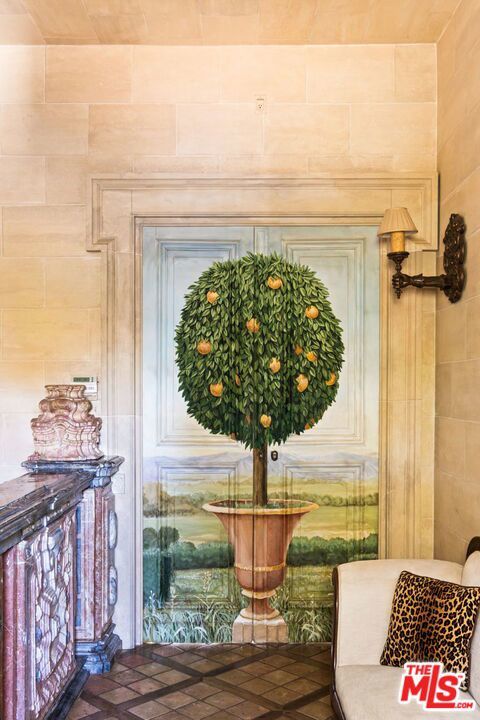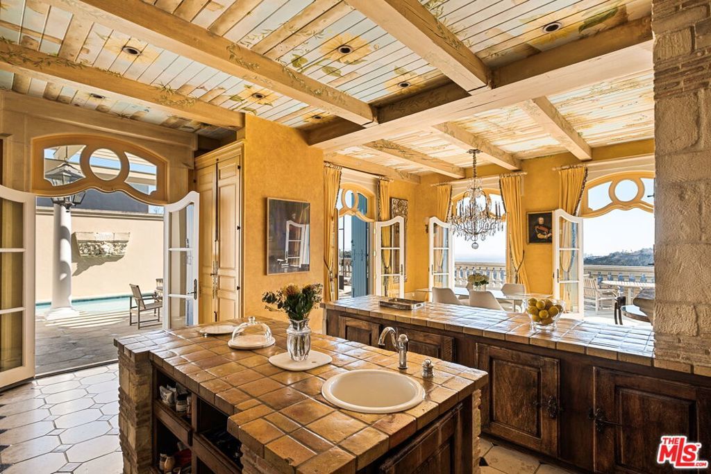 Step into the romance of the French countryside right in the heart of the Hollywood Hills. This fully furnished French Renaissance inspired chateau, perched high above Mulholland Drive, offers sweeping city, canyon, and ocean views that define California luxury. Cloaked in ivy, the residence's facade evokes centuries of history, adorned with authentic 15th-century hand-carved stone angels and gargoyles imported from France. Beyond the grand entrance, time seems to stand still. Inside, exquisite craftsmanship and timeless elegance abound. A stately 16th-century marble staircase ascends to the upper level, where three sumptuous bedrooms await. The grand primary suite serves as a true sanctuary, complete with an en-suite salon featuring a painted and gilded boiserie masterpiece. A fourth guest suite, with a private entrance, lies downstairs. Designed for effortless entertaining and refined living, the home seamlessly blends indoor and outdoor spaces. French doors flood the interiors with natural light, while the painted stone walls and graceful architectural details exude old-world charm. Expansive terraces provide inviting spaces for lounging or al fresco dining, all framed by panoramic vistas that stretch from the canyon to the glittering skyline and out to the ocean beyond.