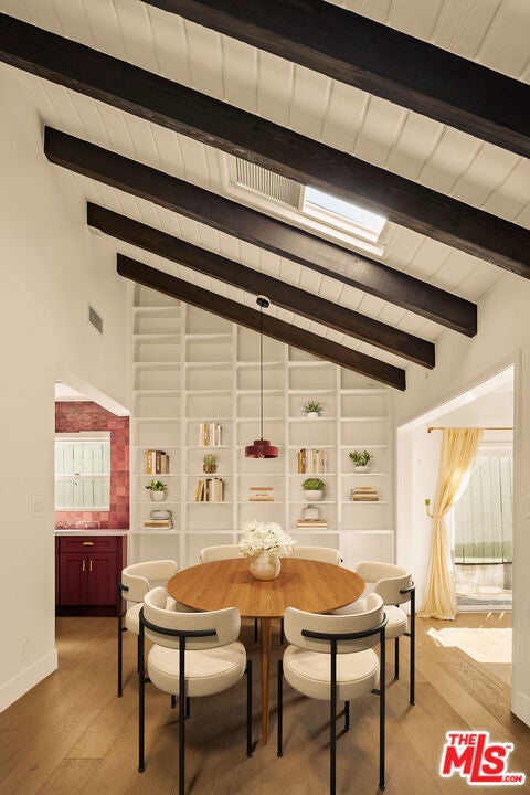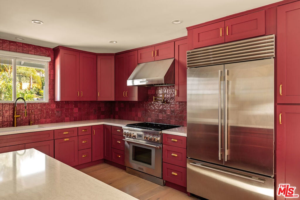 Set behind a gated entry, 4841 Don Pio Dr is a curated Woodland Hills residence that blends privacy, natural light, and refined design. This three-bedroom, two-bath home, plus a converted garage ideal for a studio, gym, or office, offers open-concept living enhanced by exposed beams, skylights, and thoughtful details throughout. A striking teal-tiled fireplace anchors the main living area, while the newly renovated kitchen features custom cabinetry, designer tile work, and stainless steel appliances. The spacious primary suite includes an en-suite bathroom, while two additional bedrooms offer flexibility. A secondary living room with double exposure open to a serene outdoor setting with a covered patio, turfed lawn, sauna, citrus trees, and lush garden beds. The property is equipped with solar panels, offering both sustainability and efficiency, and is securely gated with EV charging station. Ideally located near Ventura Blvd and The Commons at Calabasas, this gated home captures the essence of elevated California living with timeless style and comfort.