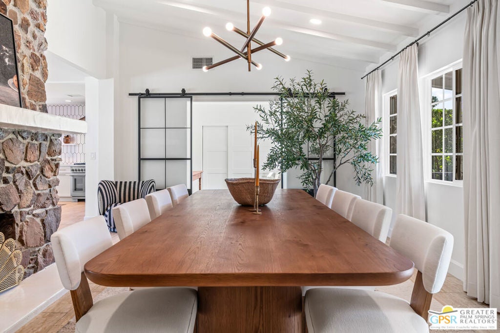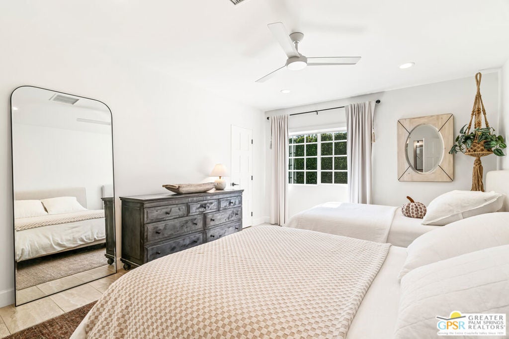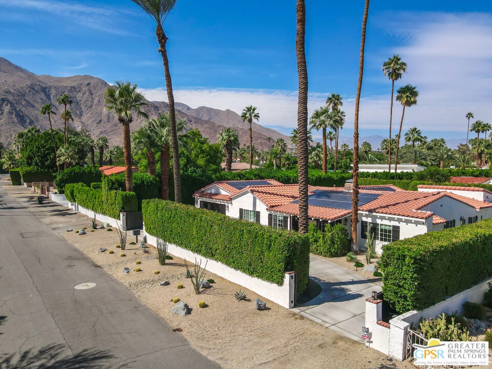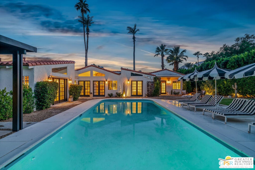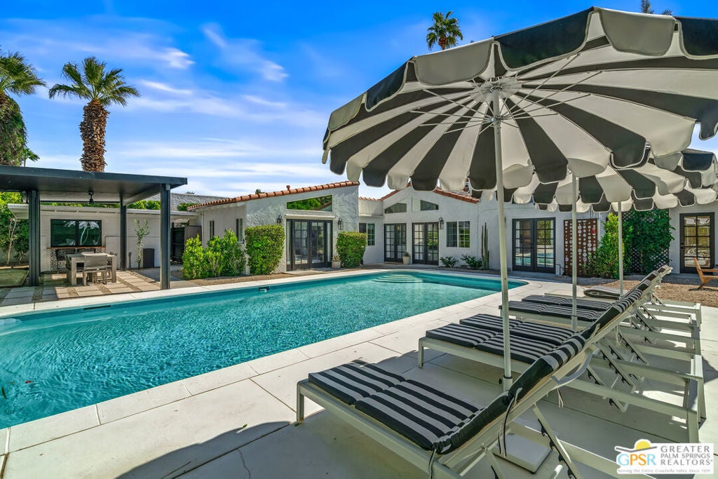 Located in the heart of the prestigious Movie Colony neighborhood, this beautifully updated single-level home offers both privacy and convenience, and a very short walking distance to downtown Palm Springs dining, shopping, and entertainment. Behind dual entry gates, the property features four bedrooms and three-and-a-half baths, including two primary suites with en suite baths. The open-concept living area includes beamed ceilings, a stone fireplace, and French doors leading to the backyard. The chef's kitchen is equipped with custom cabinetry, a Thermador 8-burner range, a Sub-Zero refrigerator, dual dishwashers, and a waterfall island, ideal for everyday living and entertaining. Outside, the private pool has unobstructed mountain views and new landscaping with accent lighting. Recent updates totaling over $100,000 include fresh exterior and interior paint, a remodeled guest bath, new fencing, gates, and a gas fire pit, along with a solar panel system and Ring security cameras. A two-car garage with epoxy flooring and ample guest parking completes the property. There is also an enclosed flex-space that could be used as a pool house, gym, or workshop. The home is on fee simple land (no land lease), and may be used as a vacation rental. This residence combines refined design, thoughtful updates, and an exceptional location in one of Palm Springs' most sought-after neighborhoods.