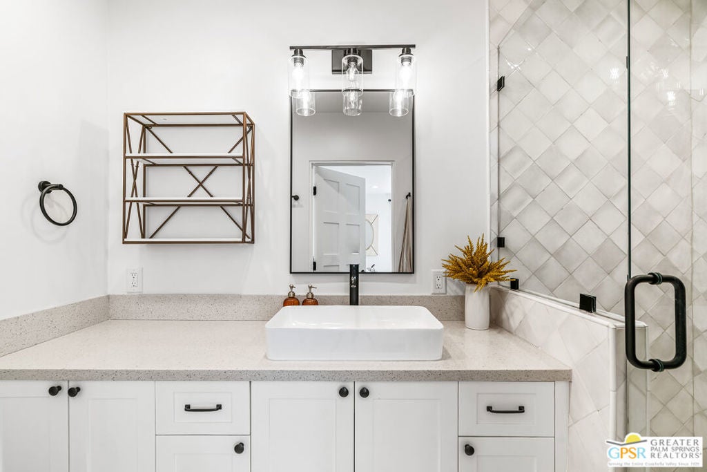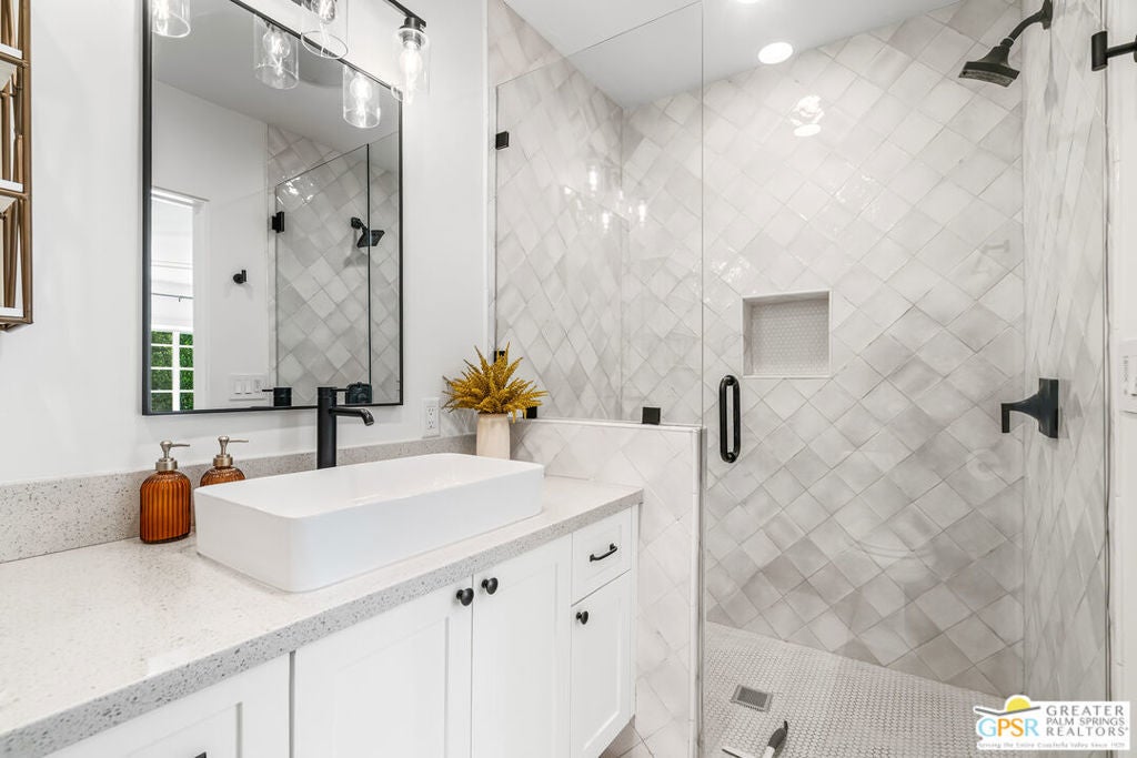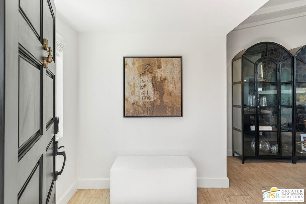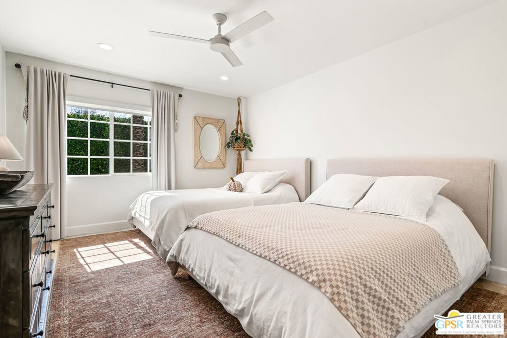 Located in the heart of the prestigious Movie Colony neighborhood, this beautifully updated single-level home offers both privacy and convenience, and a very short walking distance to downtown Palm Springs dining, shopping, and entertainment. Behind dual entry gates, the property features four bedrooms and three-and-a-half baths, including two primary suites with en suite baths. The open-concept living area includes beamed ceilings, a stone fireplace, and French doors leading to the backyard. The chef's kitchen is equipped with custom cabinetry, a Thermador 8-burner range, a Sub-Zero refrigerator, dual dishwashers, and a waterfall island, ideal for everyday living and entertaining. Outside, the private pool has unobstructed mountain views and new landscaping with accent lighting. Recent updates totaling over $100,000 include fresh exterior and interior paint, a remodeled guest bath, new fencing, gates, and a gas fire pit, along with a solar panel system and Ring security cameras. A two-car garage with epoxy flooring and ample guest parking completes the property. There is also an enclosed flex-space that could be used as a pool house, gym, or workshop. The home is on fee simple land (no land lease), and may be used as a vacation rental. This residence combines refined design, thoughtful updates, and an exceptional location in one of Palm Springs' most sought-after neighborhoods.
