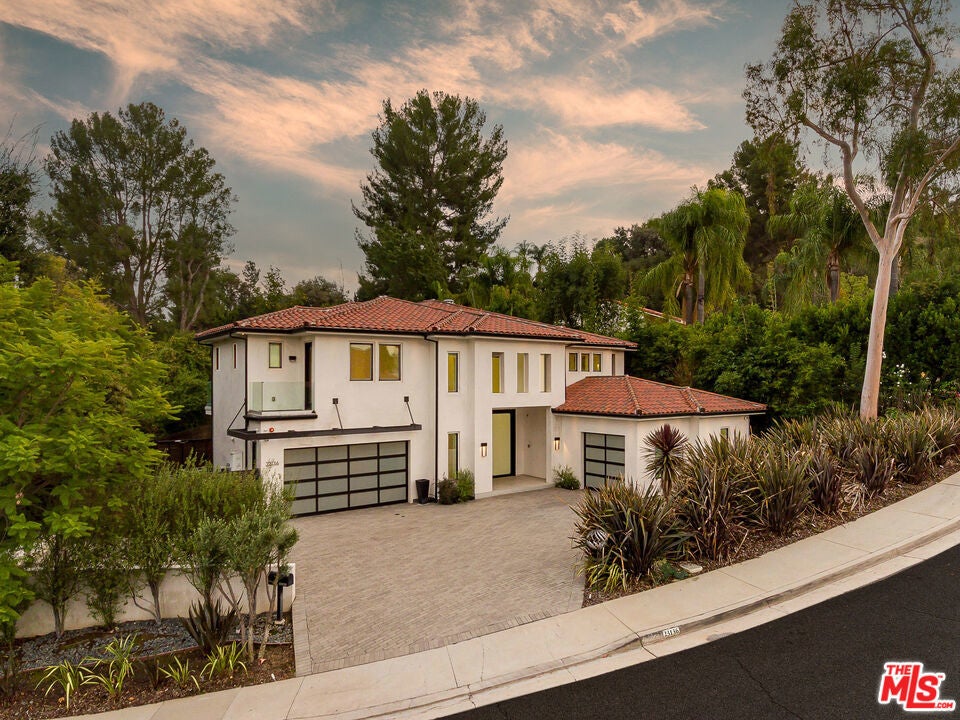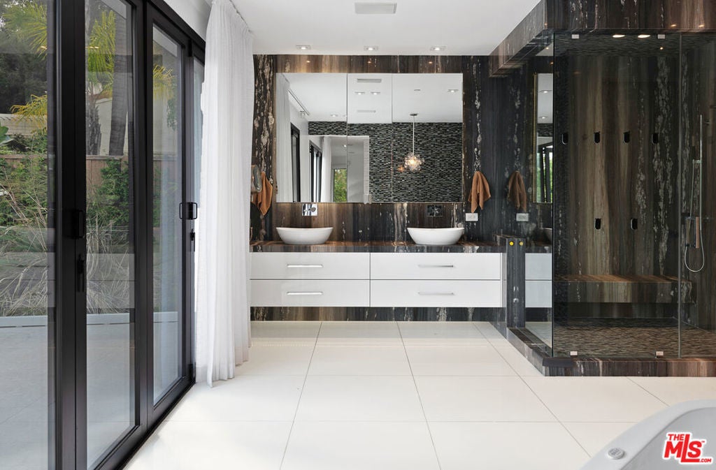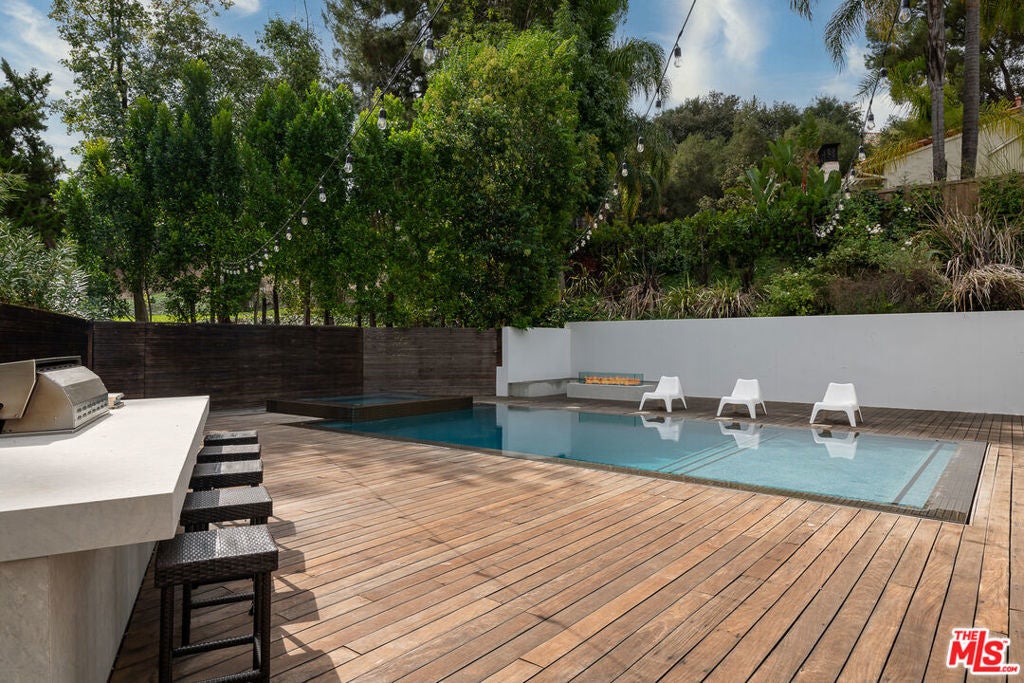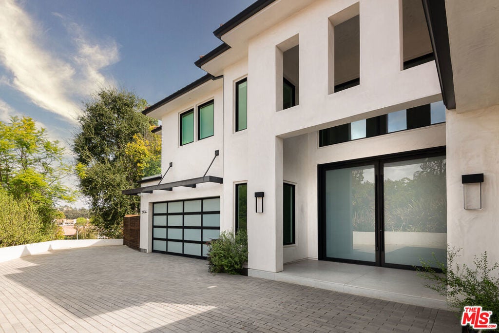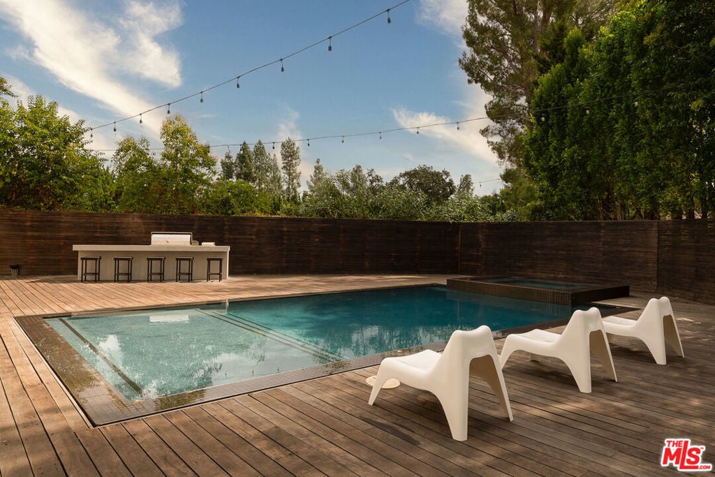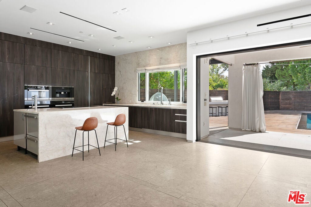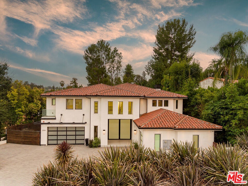 Sophistication meets modern luxury at this architecturally curated contemporary estate nestled in the prestigious enclave of Calabasas Park. Crafted with an extraordinary level of style and finish, this bespoke smart home offers over 5,000 sqft. featuring 5 bedrooms, 5 bathrooms, an additional office space and warm contemporary architecture and style. Beyond large double doors, a dramatic formal foyer features soaring ceilings and a striking stone accent wall. Expansive Fleetwood pocket doors stylishly fuse the line between indoor and outdoor living, leading to an entertainer's dream backyard featuring a zero-edge pool and spa, a fully outfitted outdoor kitchen, cozy fire pit, and a covered patio with built-in heaters and ceiling fans for year-round enjoyment. The kitchen is a culinary masterpiece with stainless steel Miele appliances, sleek built-in cabinetry, a dramatic waterfall center island, and a 192-bottle glass-enclosed wine wall. The open-concept dining area is highlighted by a built-in floating buffet bar topped with exquisite backlit Onyx countertops. Interior finishes are second to none, with stunning Batik Blue slab floors on the lower level and wide-planked hardwood throughout the upper level. The home features five en-suite bedrooms, each with private balconies, offering peaceful retreats with luxurious details. A downstairs office provides dedicated workspace, while the primary suite is a true sanctuary featuring Fleetwood accordion doors, a double-sided fireplace, steam shower with waterfall faucet, and a show-stopping walk-in closet. Designed for comfort, style, and cutting-edge convenience, the estate also includes full home automation, an advanced security system, water purifier, home gym, and a 3-car garage with epoxy flooring. Bold yet refined, this Calabasas estate offers a rare opportunity to experience elevated living in one of the area's most desirable communities. Located just minutes from premier shopping, dining, and with direct gated access to Lake Calabasas, this showpiece is a true statement of elegance and innovation.