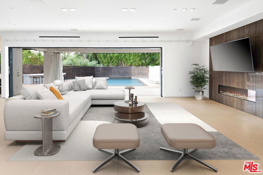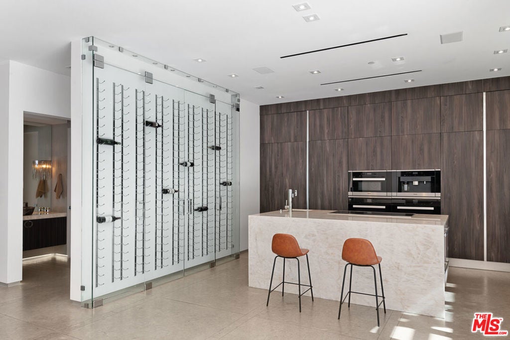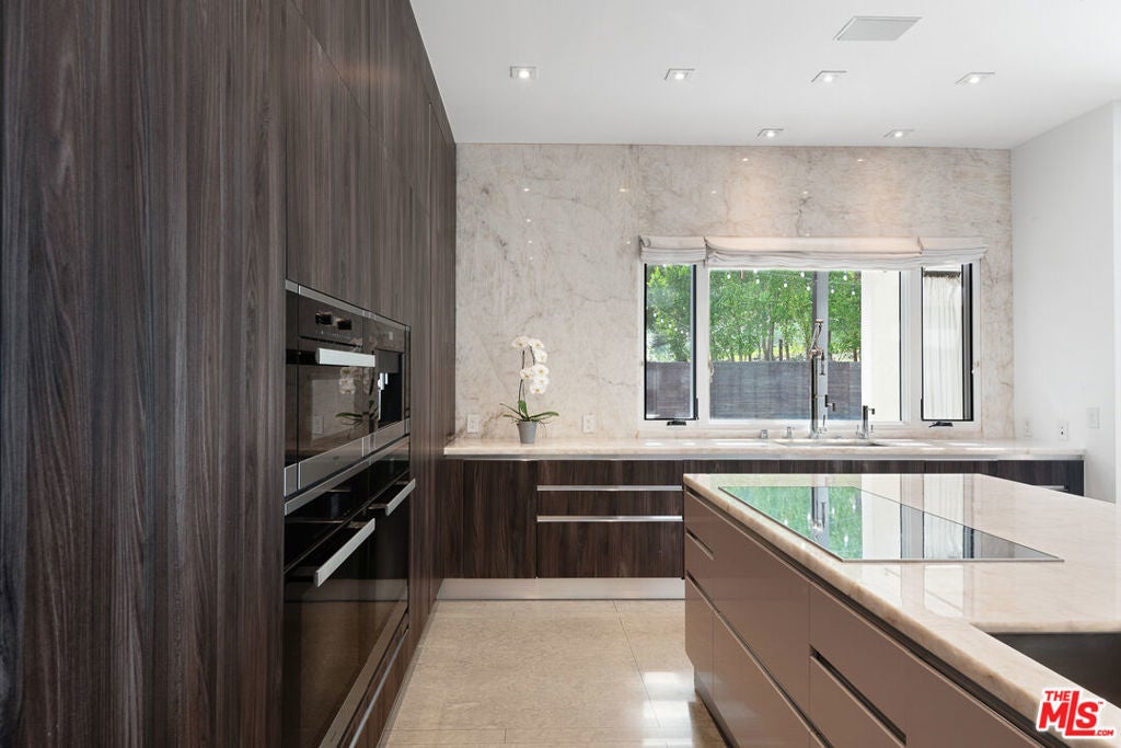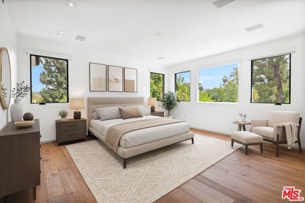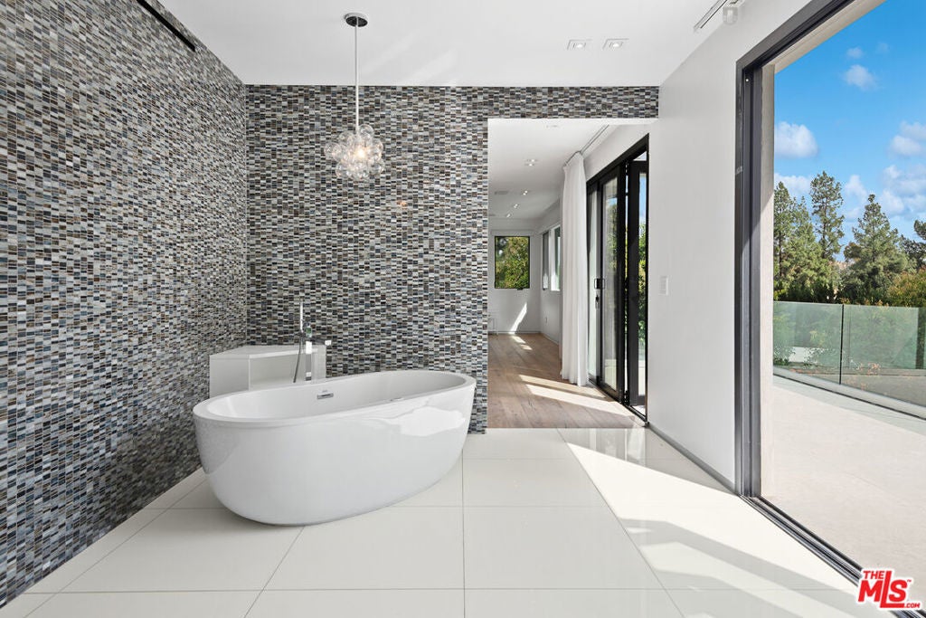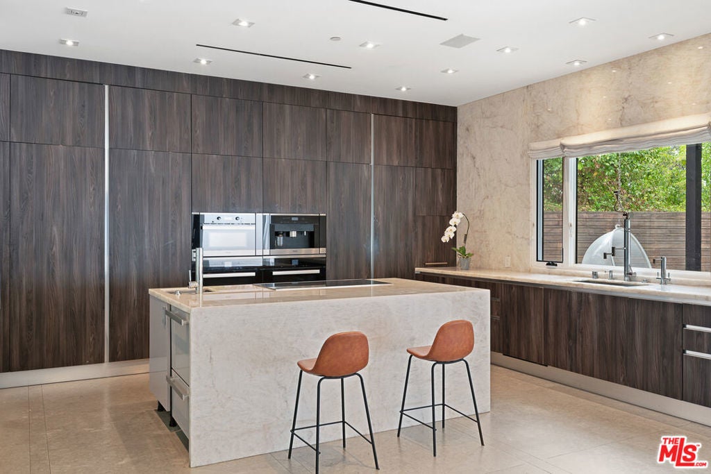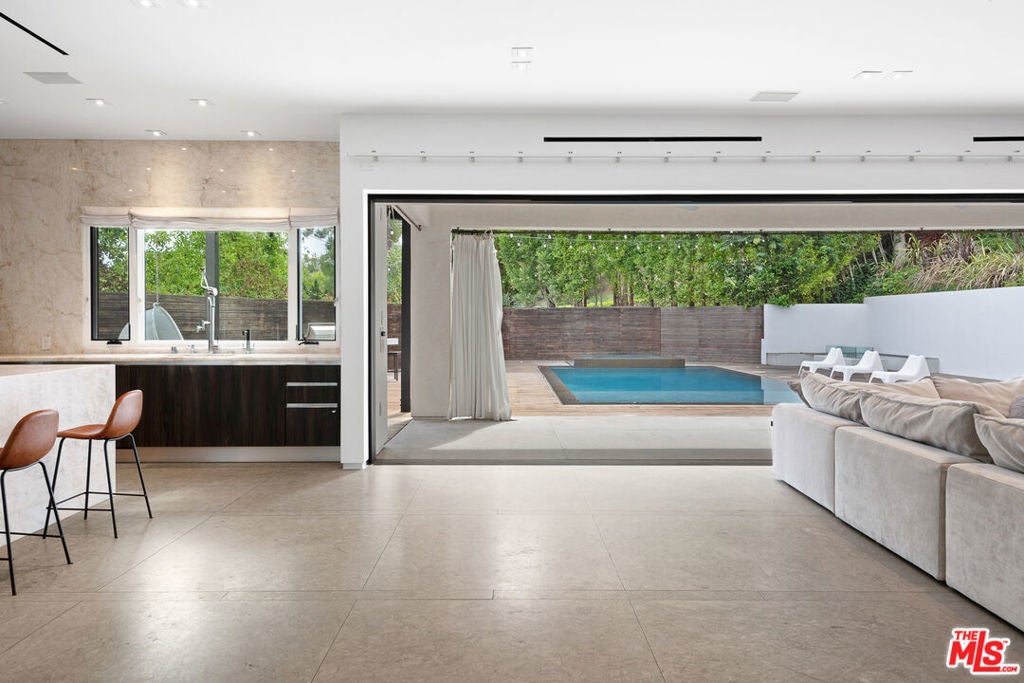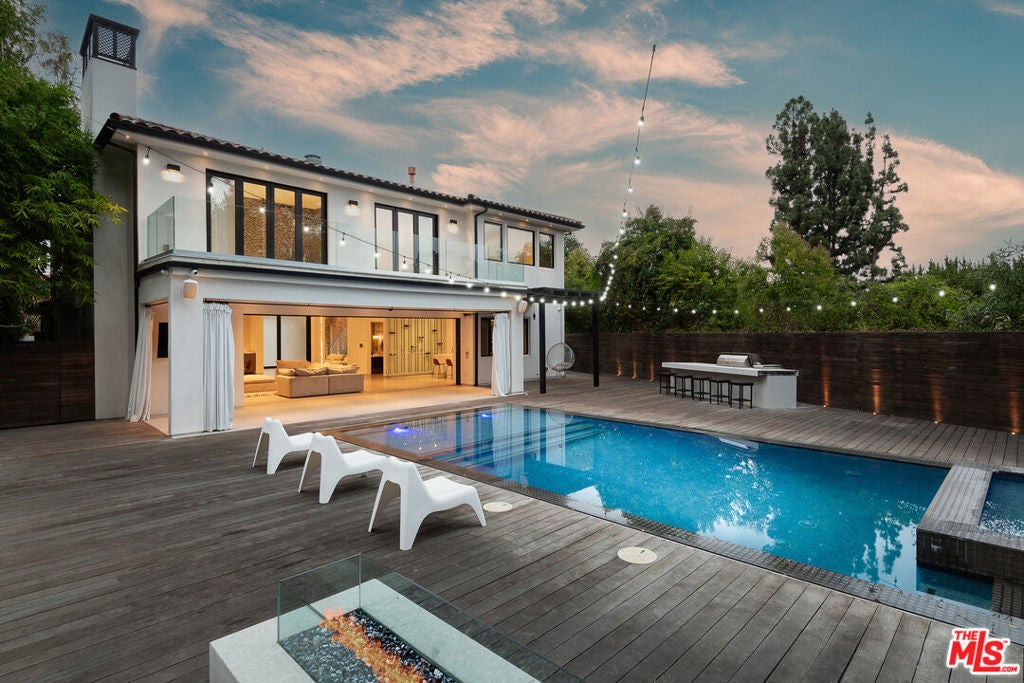 Sophistication meets modern luxury at this architecturally curated contemporary estate nestled in the prestigious enclave of Calabasas Park. Crafted with an extraordinary level of style and finish, this bespoke smart home offers over 5,000 sqft. featuring 5 bedrooms, 5 bathrooms, an additional office space and warm contemporary architecture and style. Beyond large double doors, a dramatic formal foyer features soaring ceilings and a striking stone accent wall. Expansive Fleetwood pocket doors stylishly fuse the line between indoor and outdoor living, leading to an entertainer's dream backyard featuring a zero-edge pool and spa, a fully outfitted outdoor kitchen, cozy fire pit, and a covered patio with built-in heaters and ceiling fans for year-round enjoyment. The kitchen is a culinary masterpiece with stainless steel Miele appliances, sleek built-in cabinetry, a dramatic waterfall center island, and a 192-bottle glass-enclosed wine wall. The open-concept dining area is highlighted by a built-in floating buffet bar topped with exquisite backlit Onyx countertops. Interior finishes are second to none, with stunning Batik Blue slab floors on the lower level and wide-planked hardwood throughout the upper level. The home features five en-suite bedrooms, each with private balconies, offering peaceful retreats with luxurious details. A downstairs office provides dedicated workspace, while the primary suite is a true sanctuary featuring Fleetwood accordion doors, a double-sided fireplace, steam shower with waterfall faucet, and a show-stopping walk-in closet. Designed for comfort, style, and cutting-edge convenience, the estate also includes full home automation, an advanced security system, water purifier, home gym, and a 3-car garage with epoxy flooring. Bold yet refined, this Calabasas estate offers a rare opportunity to experience elevated living in one of the area's most desirable communities. Located just minutes from premier shopping, dining, and with direct gated access to Lake Calabasas, this showpiece is a true statement of elegance and innovation.