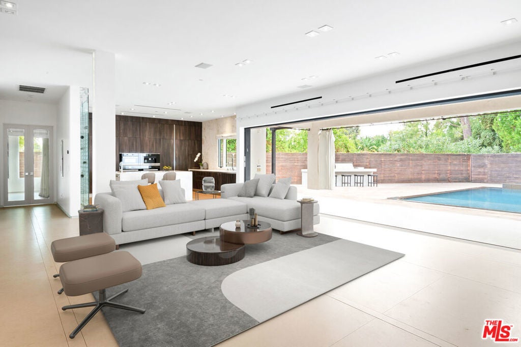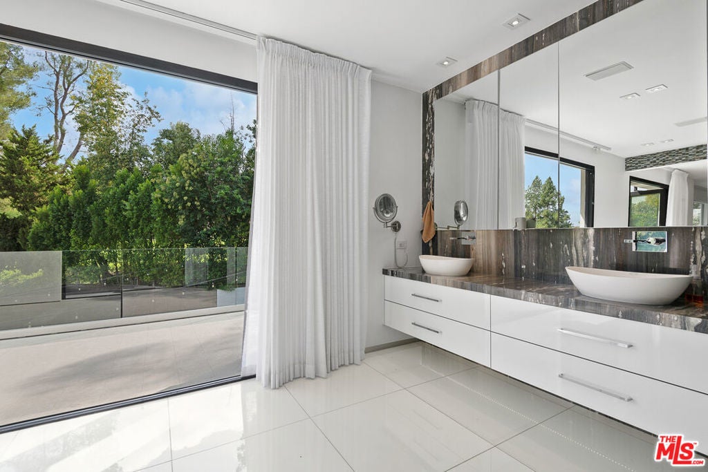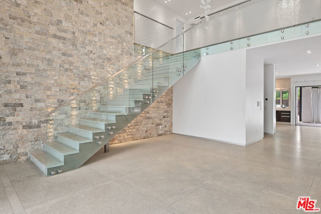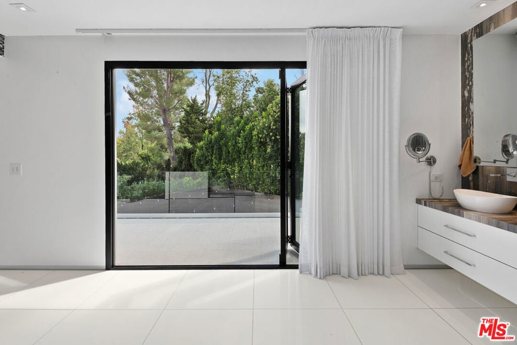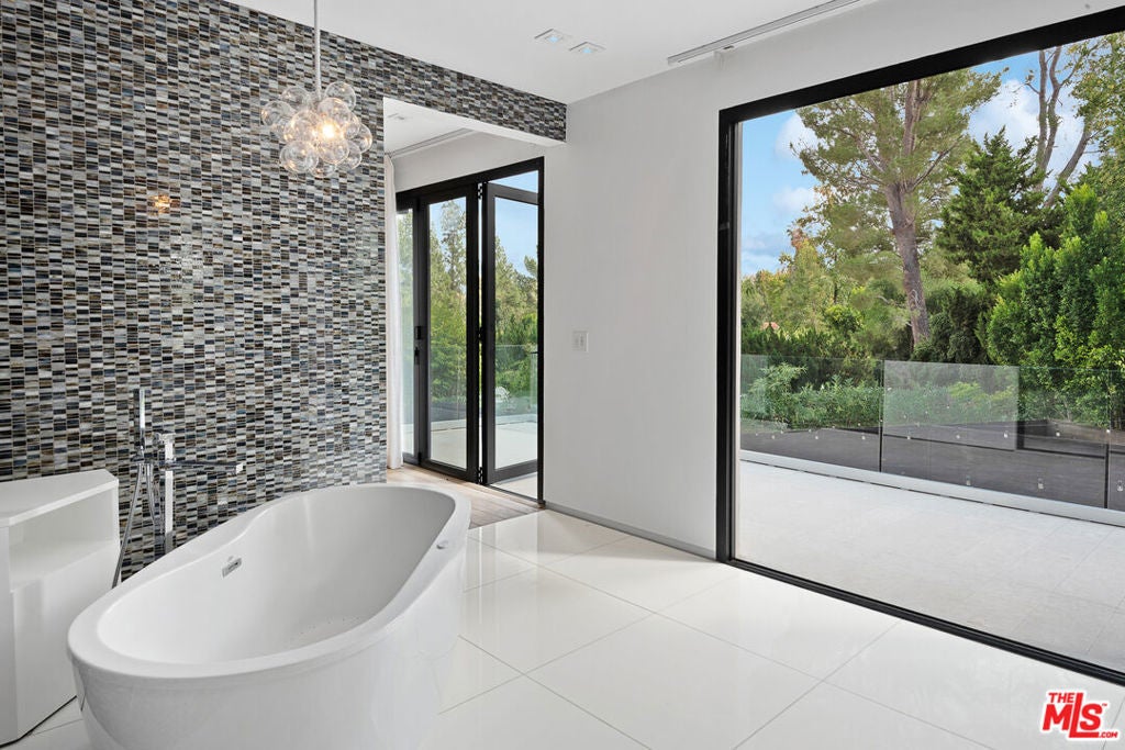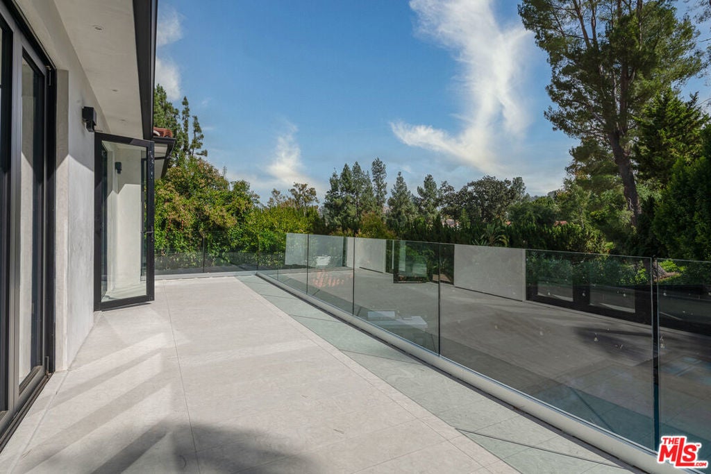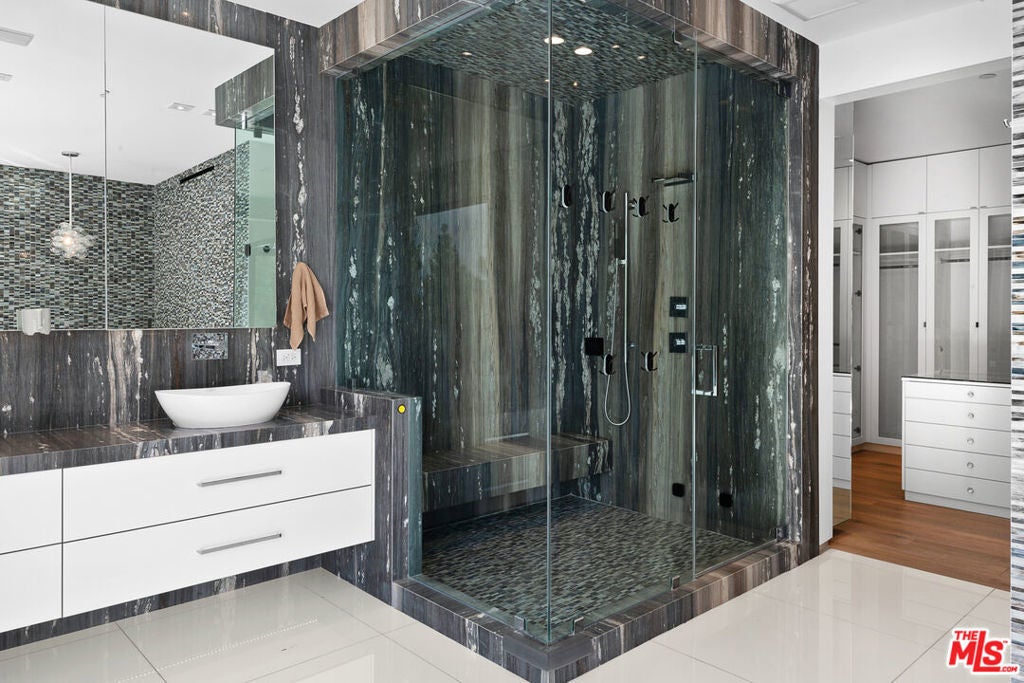 Sophistication meets modern luxury at this architecturally curated contemporary estate nestled in the prestigious enclave of Calabasas Park. Crafted with an extraordinary level of style and finish, this bespoke smart home offers over 5,000 sqft. featuring 5 bedrooms, 5 bathrooms, an additional office space and warm contemporary architecture and style. Beyond large double doors, a dramatic formal foyer features soaring ceilings and a striking stone accent wall. Expansive Fleetwood pocket doors stylishly fuse the line between indoor and outdoor living, leading to an entertainer's dream backyard featuring a zero-edge pool and spa, a fully outfitted outdoor kitchen, cozy fire pit, and a covered patio with built-in heaters and ceiling fans for year-round enjoyment. The kitchen is a culinary masterpiece with stainless steel Miele appliances, sleek built-in cabinetry, a dramatic waterfall center island, and a 192-bottle glass-enclosed wine wall. The open-concept dining area is highlighted by a built-in floating buffet bar topped with exquisite backlit Onyx countertops. Interior finishes are second to none, with stunning Batik Blue slab floors on the lower level and wide-planked hardwood throughout the upper level. The home features five en-suite bedrooms, each with private balconies, offering peaceful retreats with luxurious details. A downstairs office provides dedicated workspace, while the primary suite is a true sanctuary featuring Fleetwood accordion doors, a double-sided fireplace, steam shower with waterfall faucet, and a show-stopping walk-in closet. Designed for comfort, style, and cutting-edge convenience, the estate also includes full home automation, an advanced security system, water purifier, home gym, and a 3-car garage with epoxy flooring. Bold yet refined, this Calabasas estate offers a rare opportunity to experience elevated living in one of the area's most desirable communities. Located just minutes from premier shopping, dining, and with direct gated access to Lake Calabasas, this showpiece is a true statement of elegance and innovation.